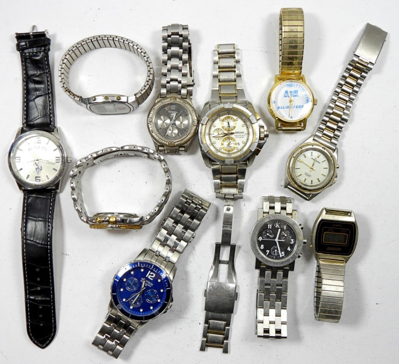 10 mens watches, not tested as to working or not 0 most will need battery replacements 0 some for parts or repairs, some may work