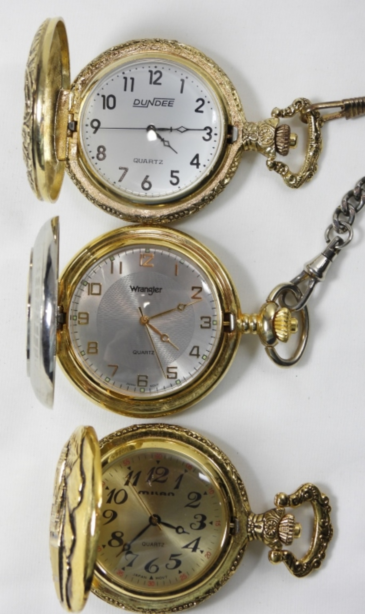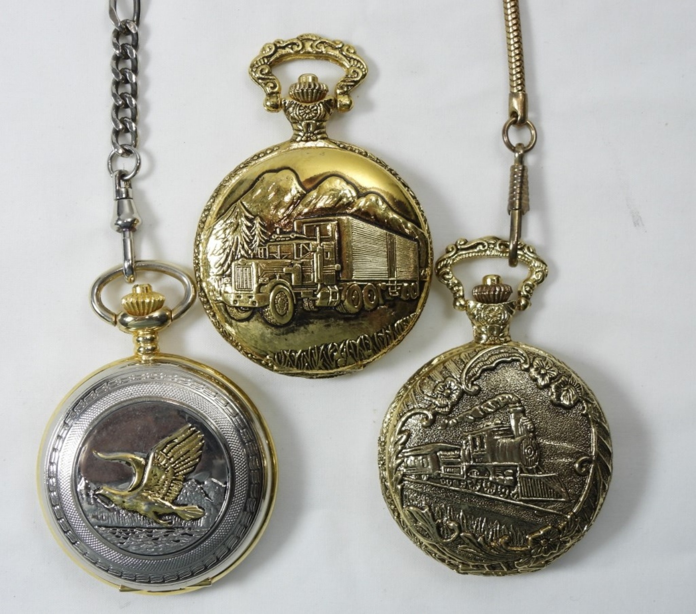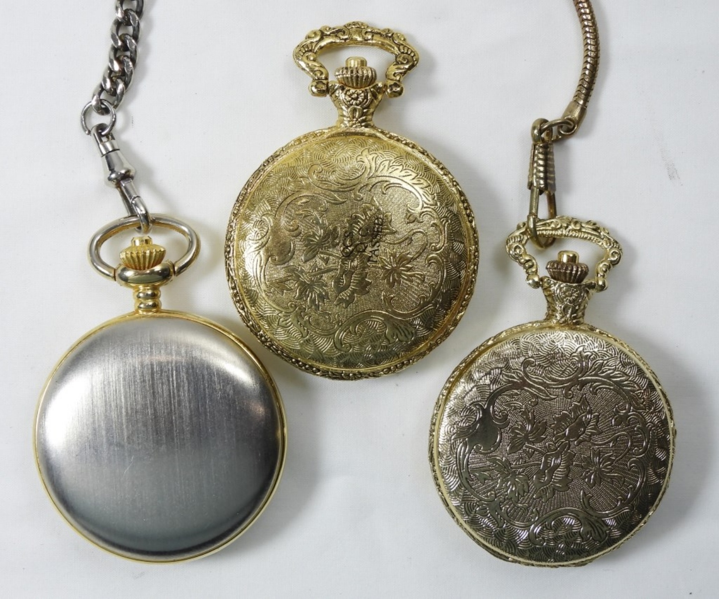 3 QUARTZ VINTAGE POCKET WATCHES, UNTESTED, SOME MAY BE BROKEN OR NEED REPAIRED, CAN BE USED FOR PARTS/REPAIR