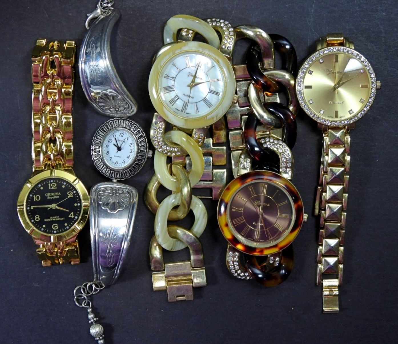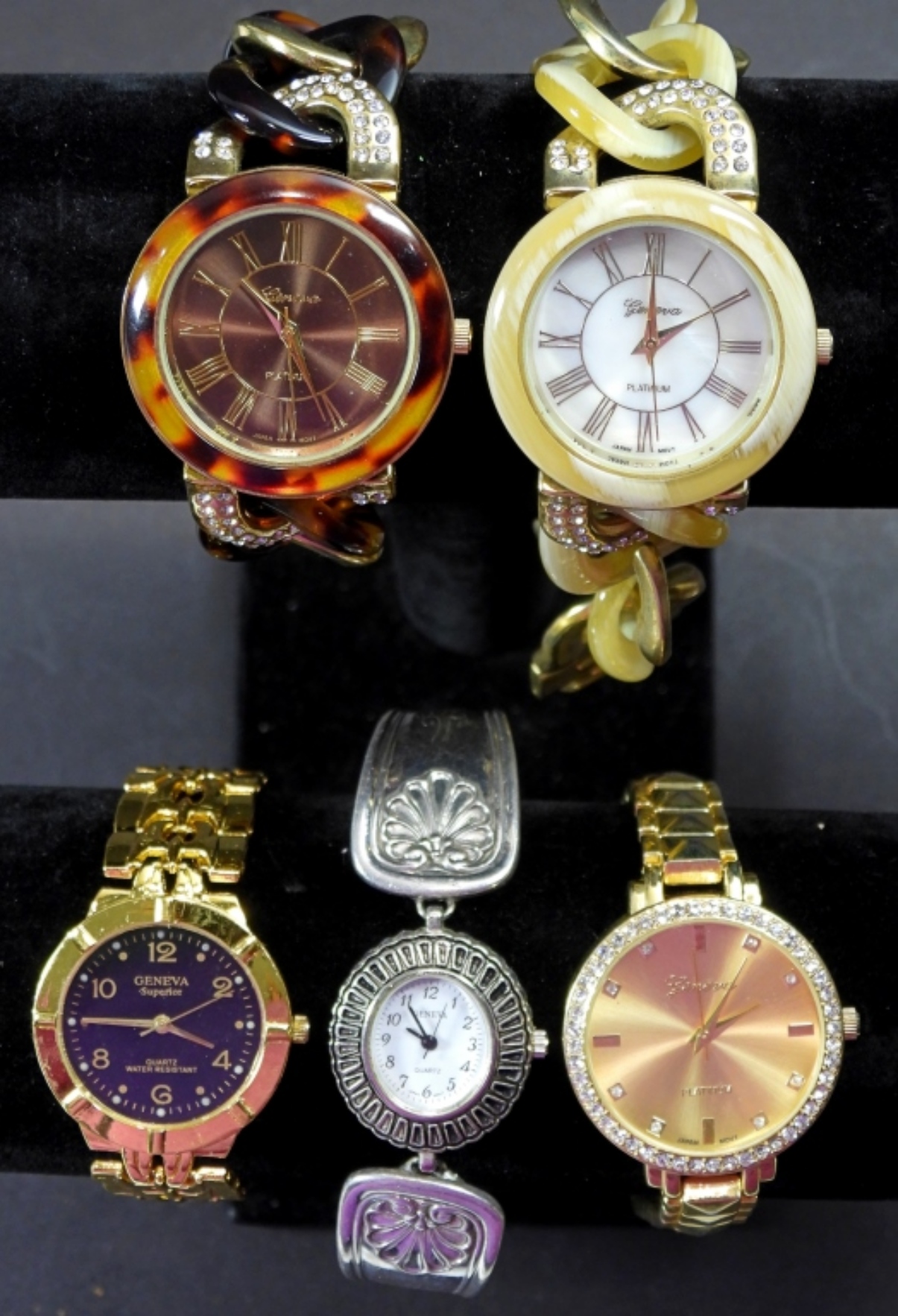 (5)SPARKLY GOLD TONE GENEVE WATCHES, UNTESTED, WATCH MAY OR MAY NOT WORK, COULD BE USED FOR PARTS OR REPAIR