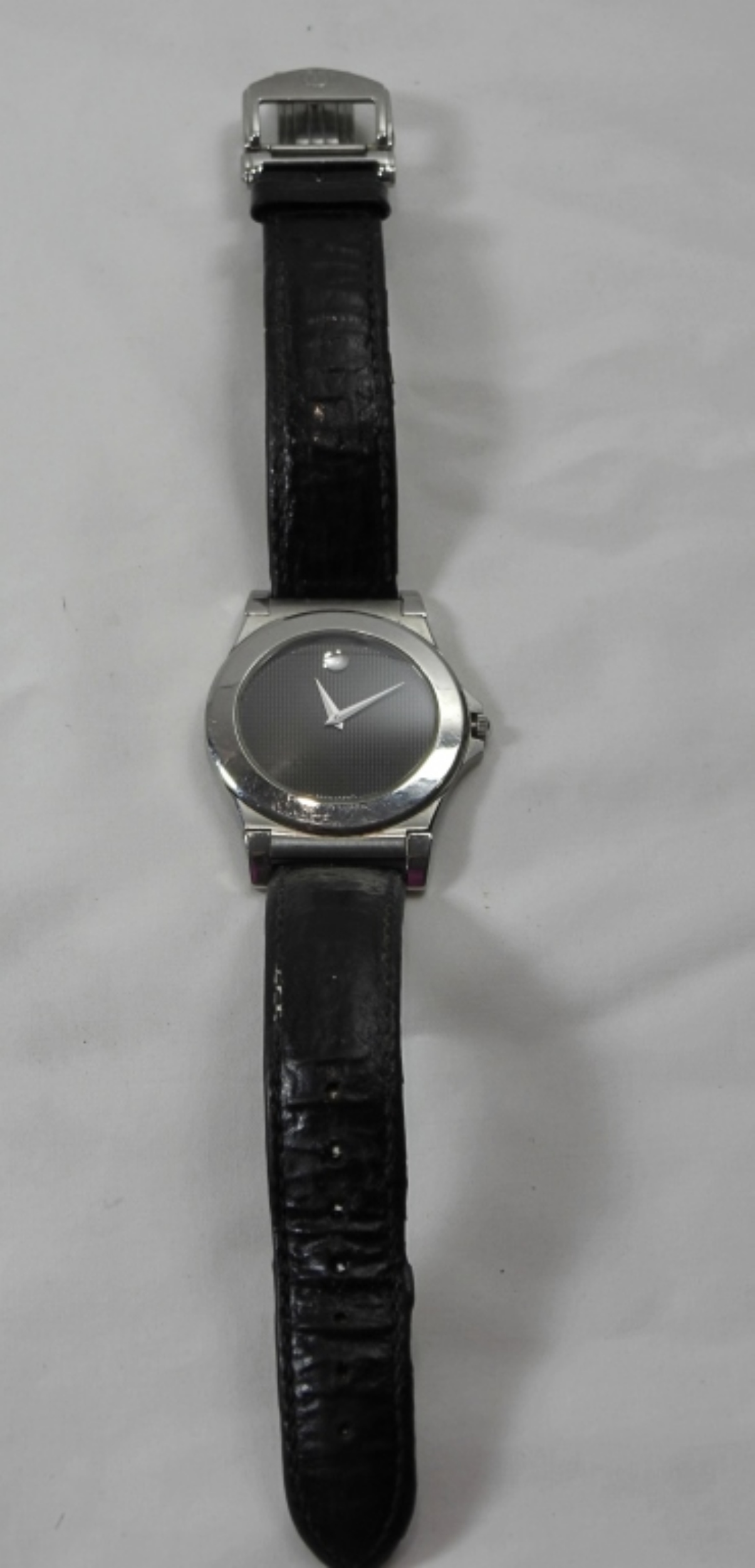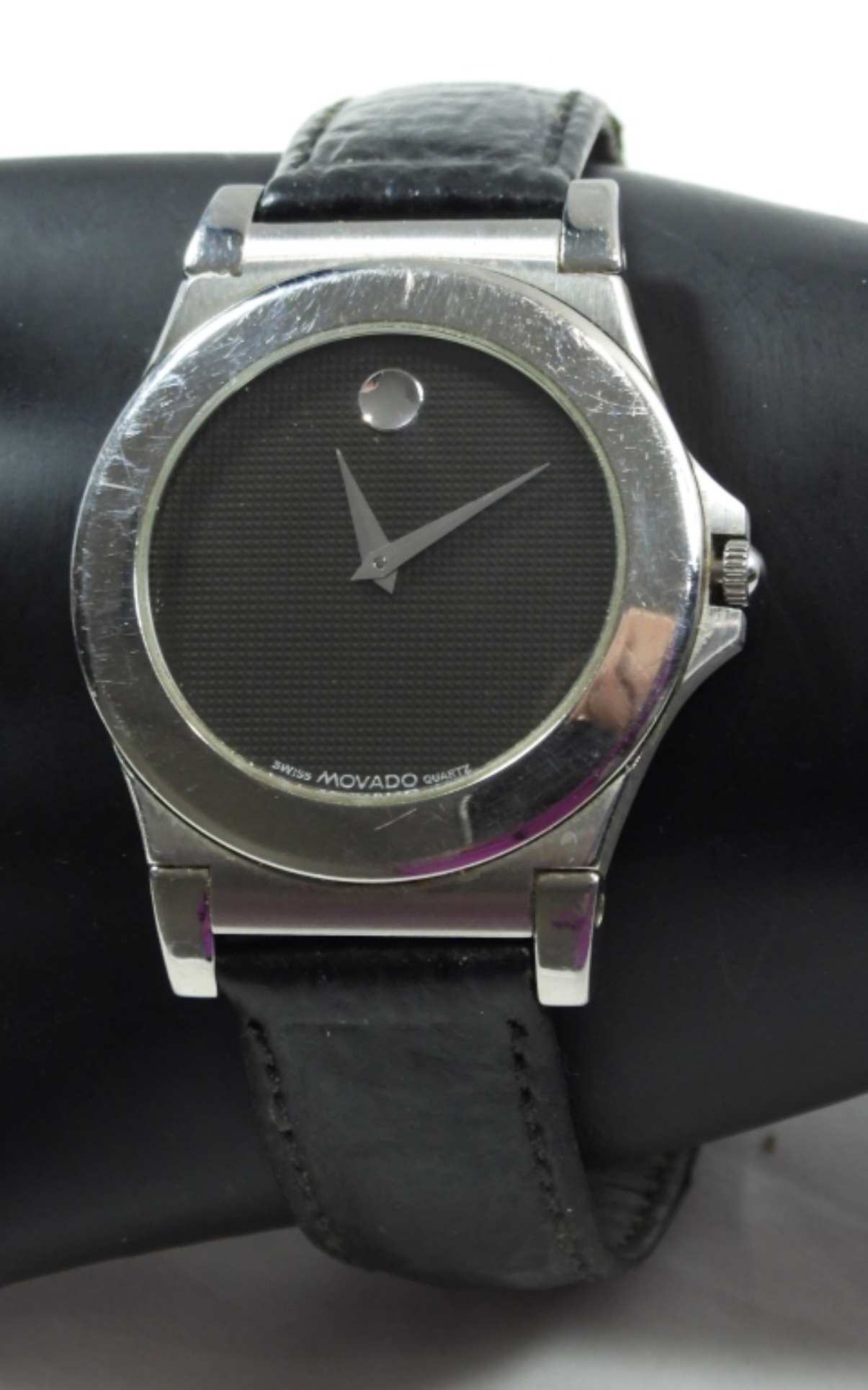 MOVADO LEATHER BAND WATCH, UNTESTED, WATCH MAY OR MAY NOT WORK, COULD BE USED FOR PARTS OR REPAIR