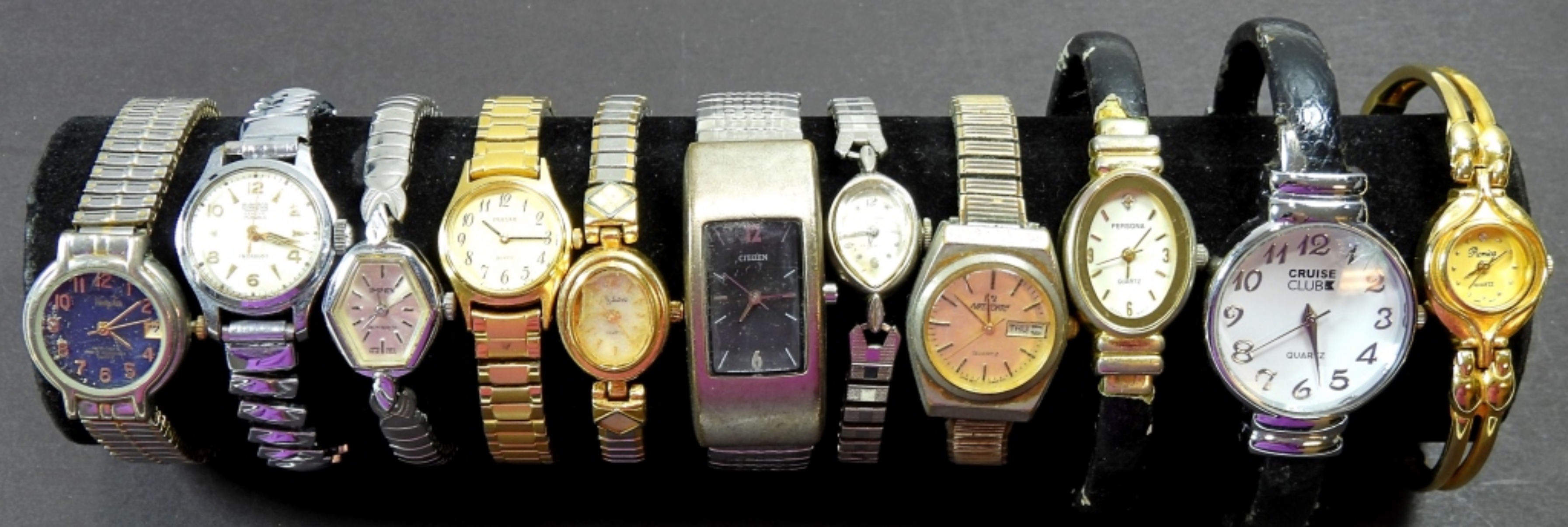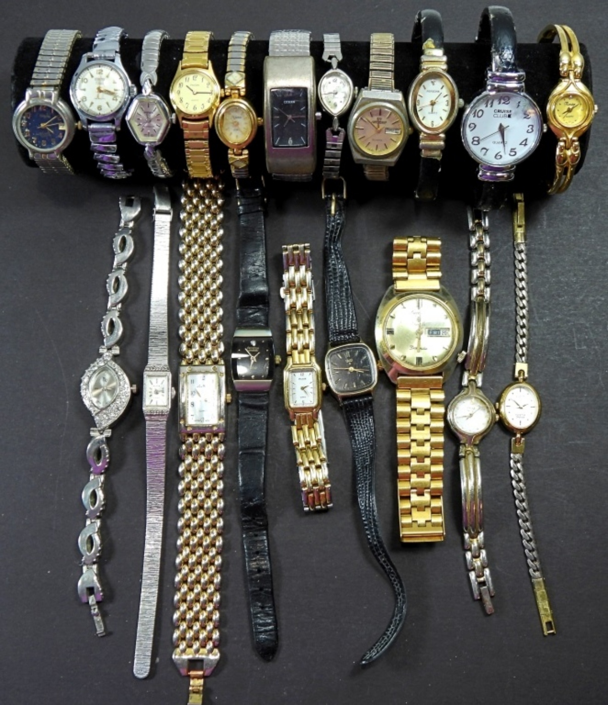 20 WOMENS VARIETY WATCHES, GOLD/SILVER TONED, UNTESTED, MAY NEED WORK, BRANDS (IMPEX, PULSAR, AND MORE)