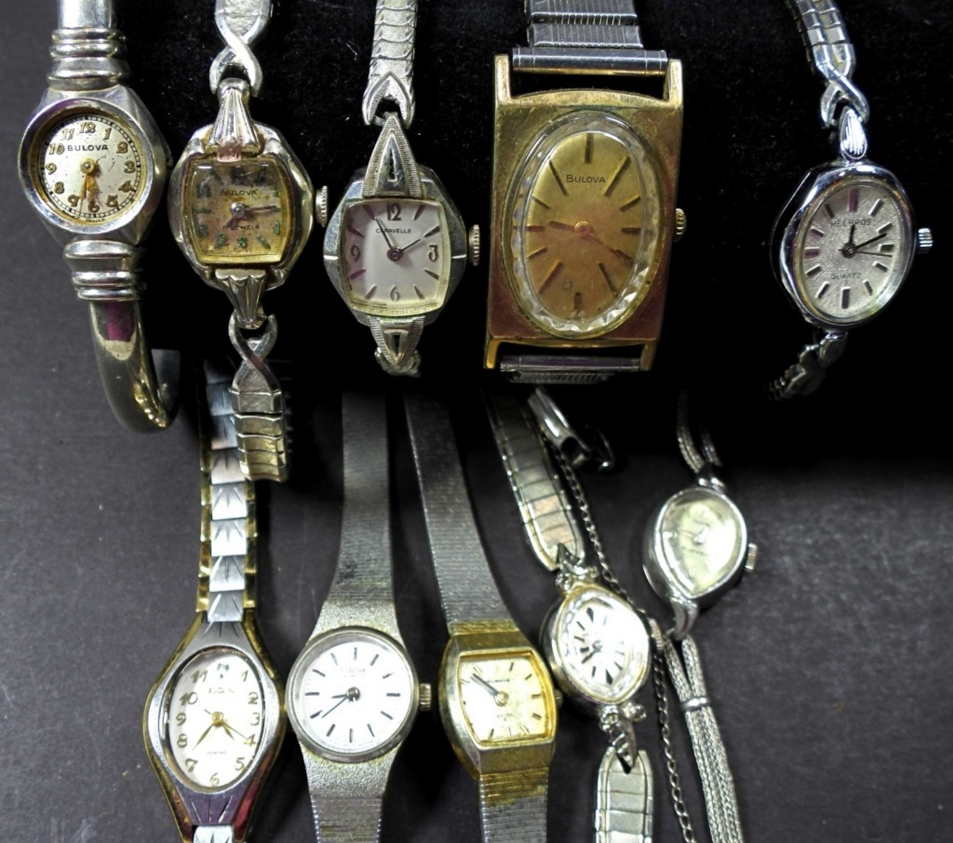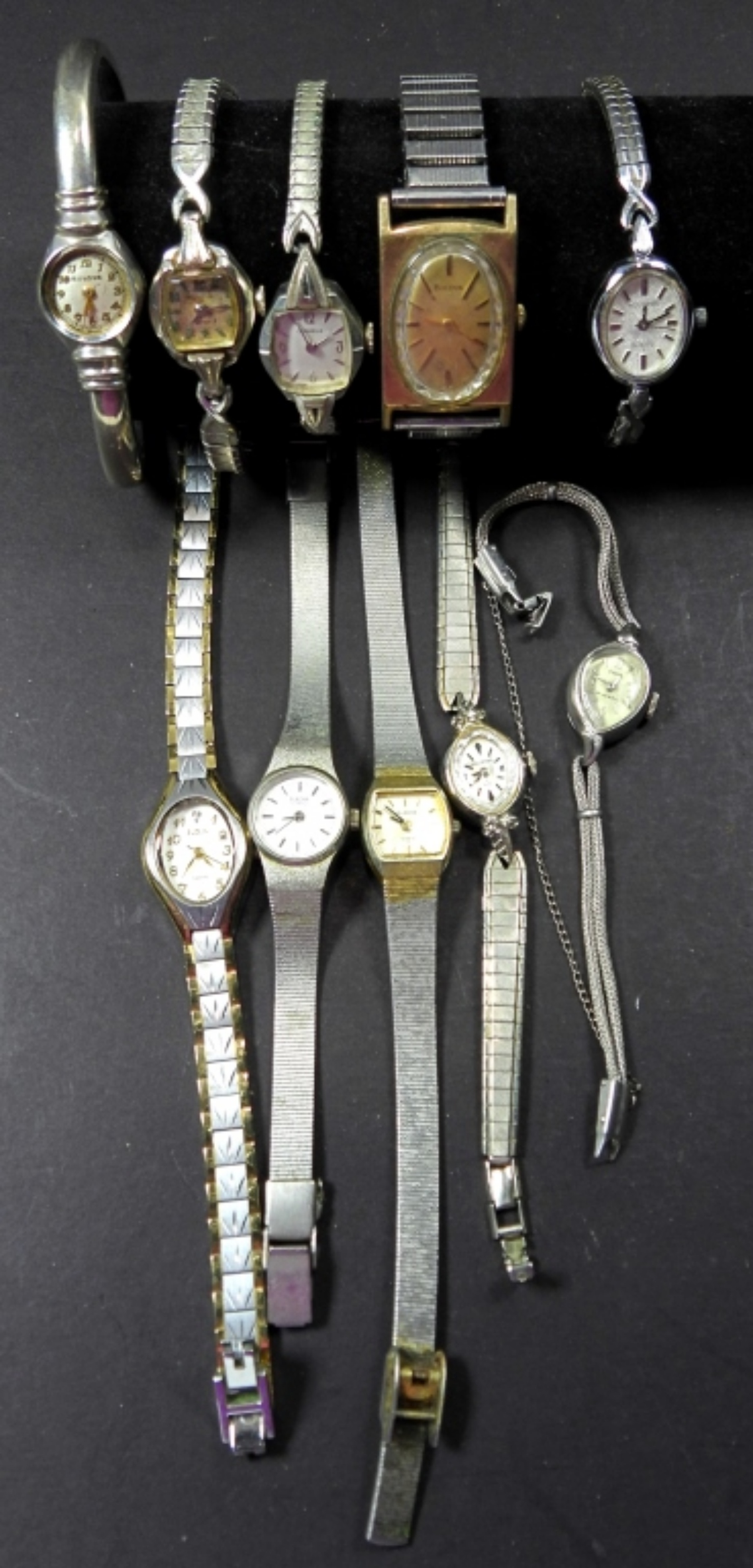 10 SMALL WOMENS SILVER TONE WATCHES, UNTESTED, MAY NEED WORK, BRANDS (ELGIN, BULOVA, AND HELBROS)