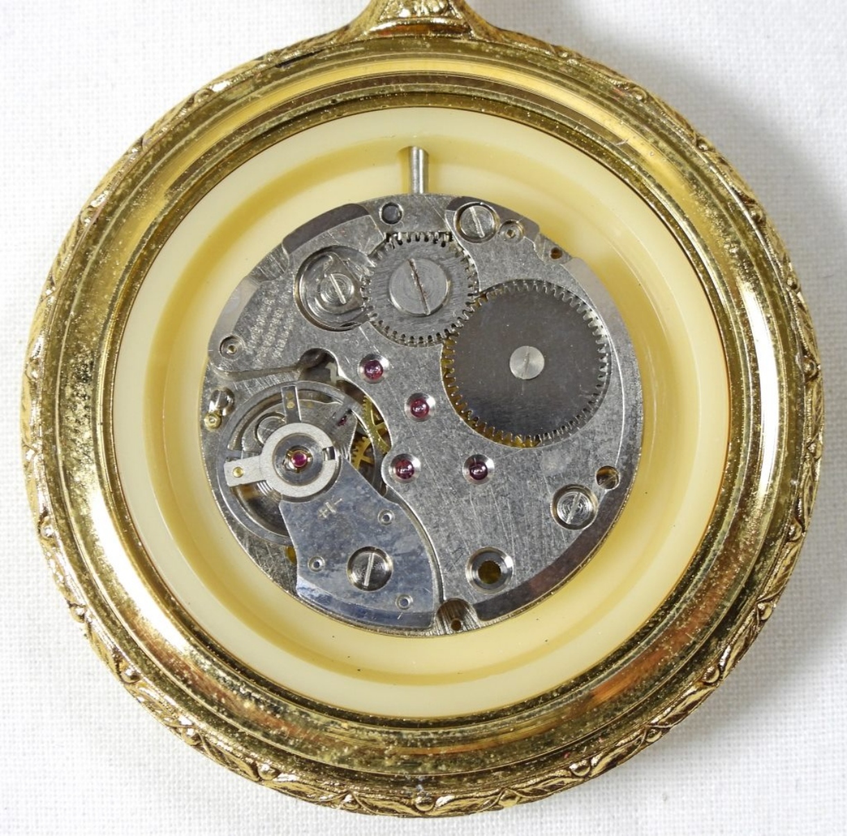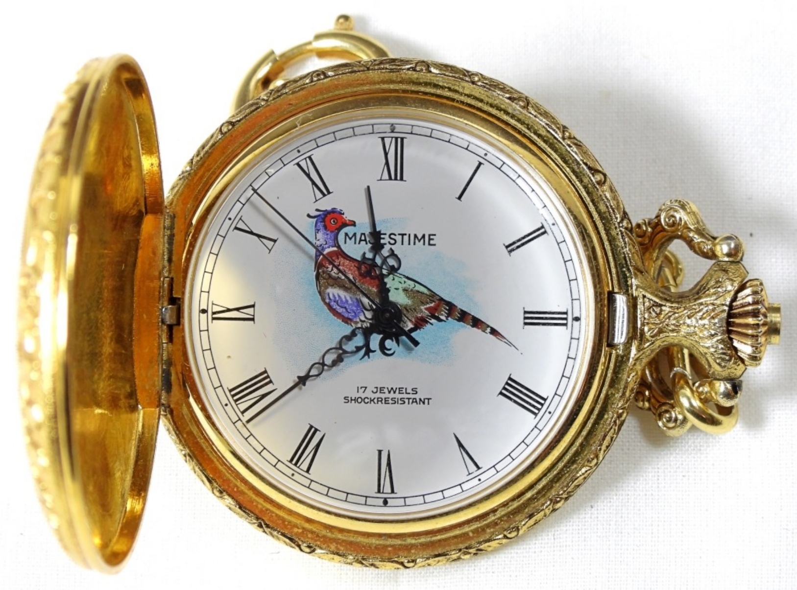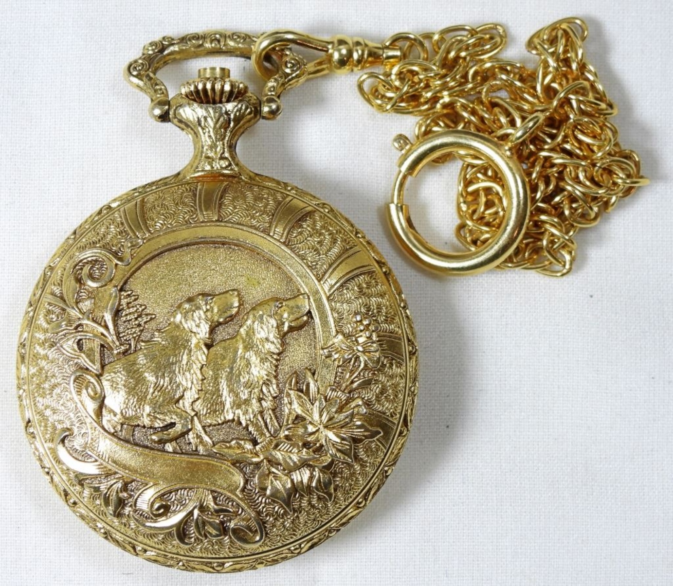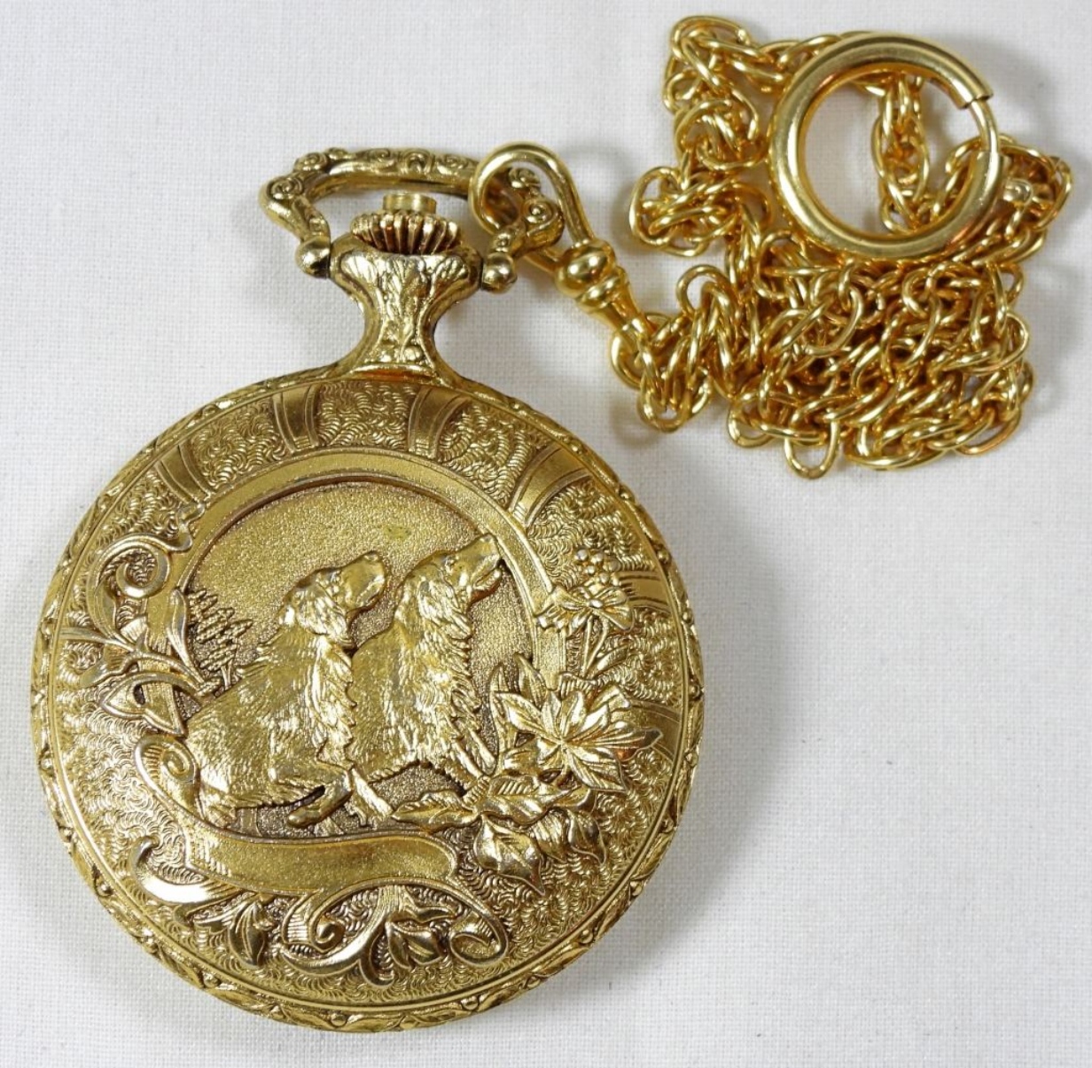 Majestime pocket watch, deer on front, wolves on back, gold, with chain, untested to see if it works