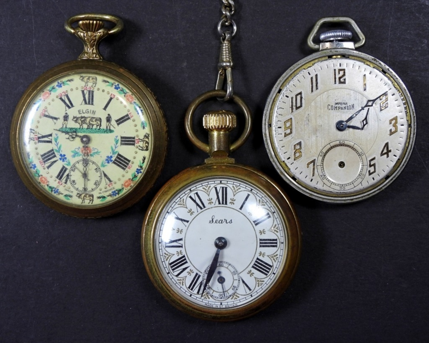 3 POCKET WATCHES FOR PARTS/REPAIR, UNTESTED, SOME MAY WORK SOME MAY NOT WORK COULD BE USED FOR PARTS/REPAIR, BRANDS (WEARS, ELGIN AND COMPANION)