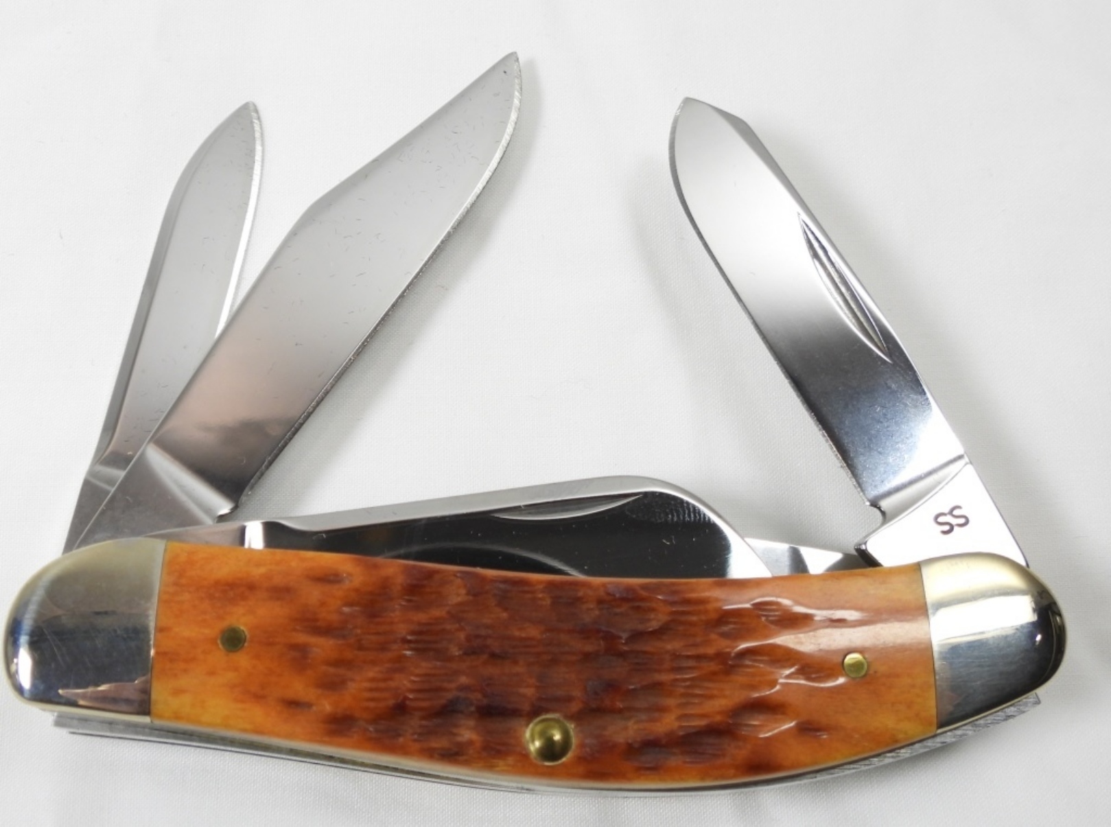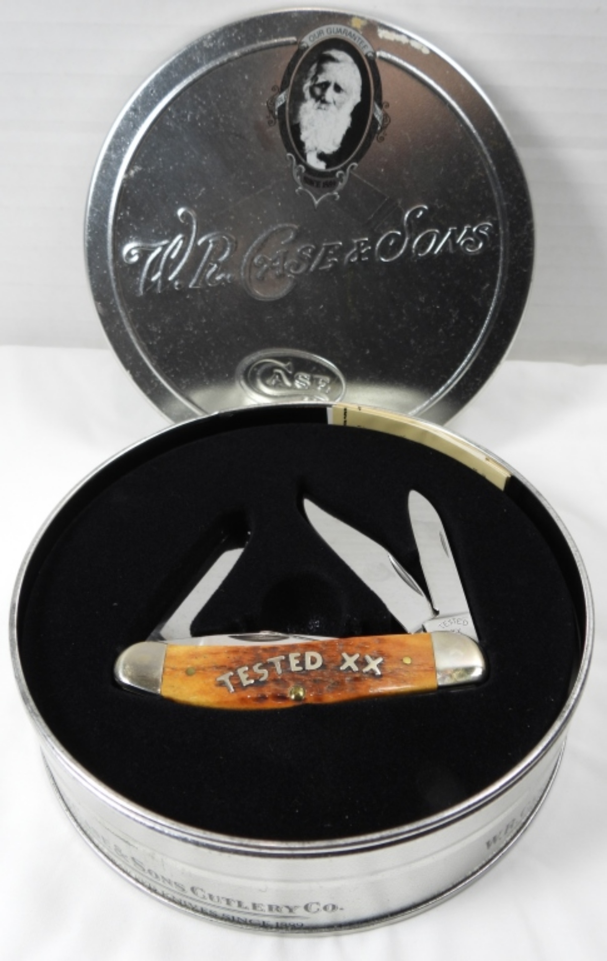 W.R. Case & Sons pocket knife in metal tin, Tested XX, amber colors, multi blades