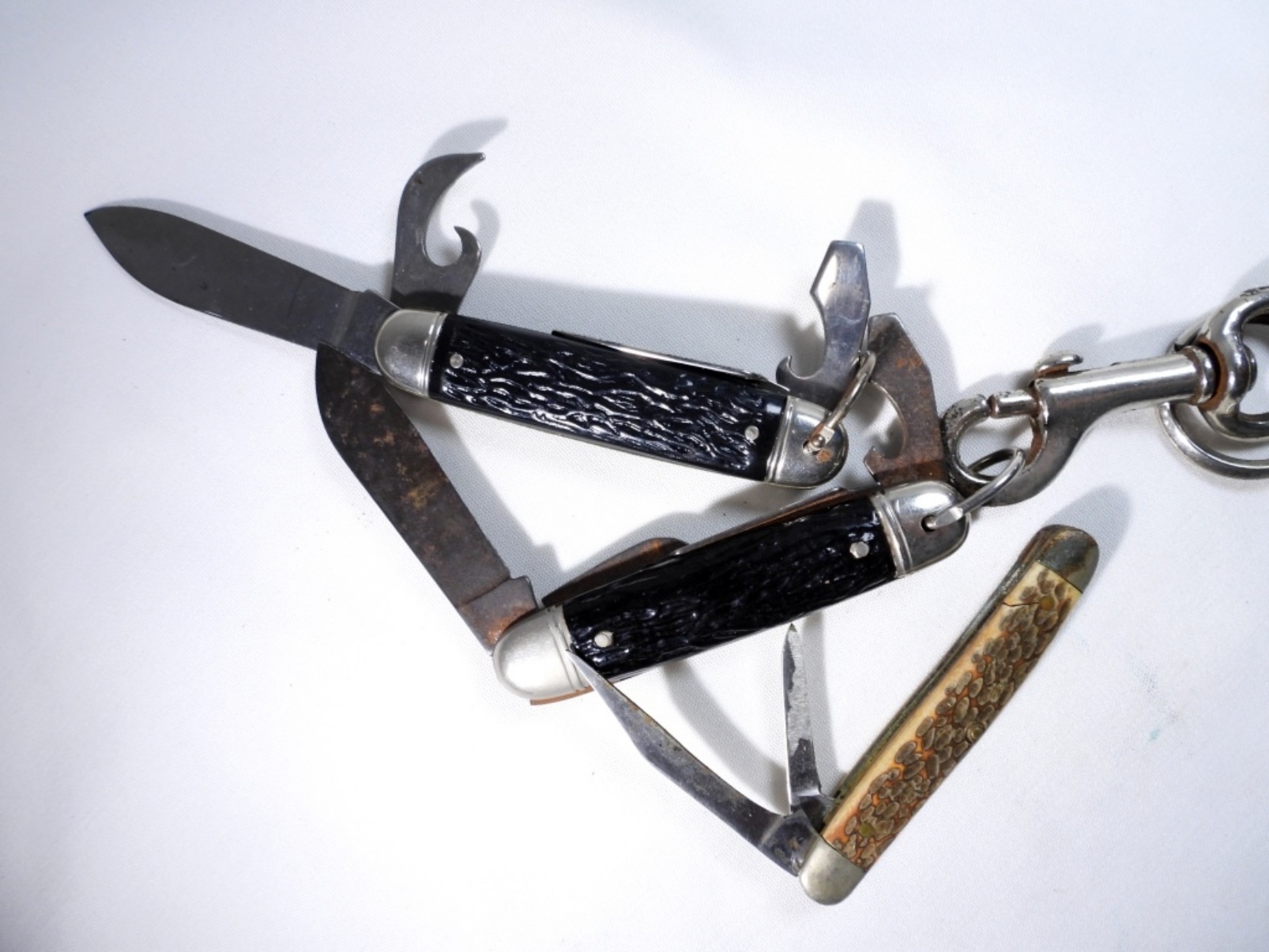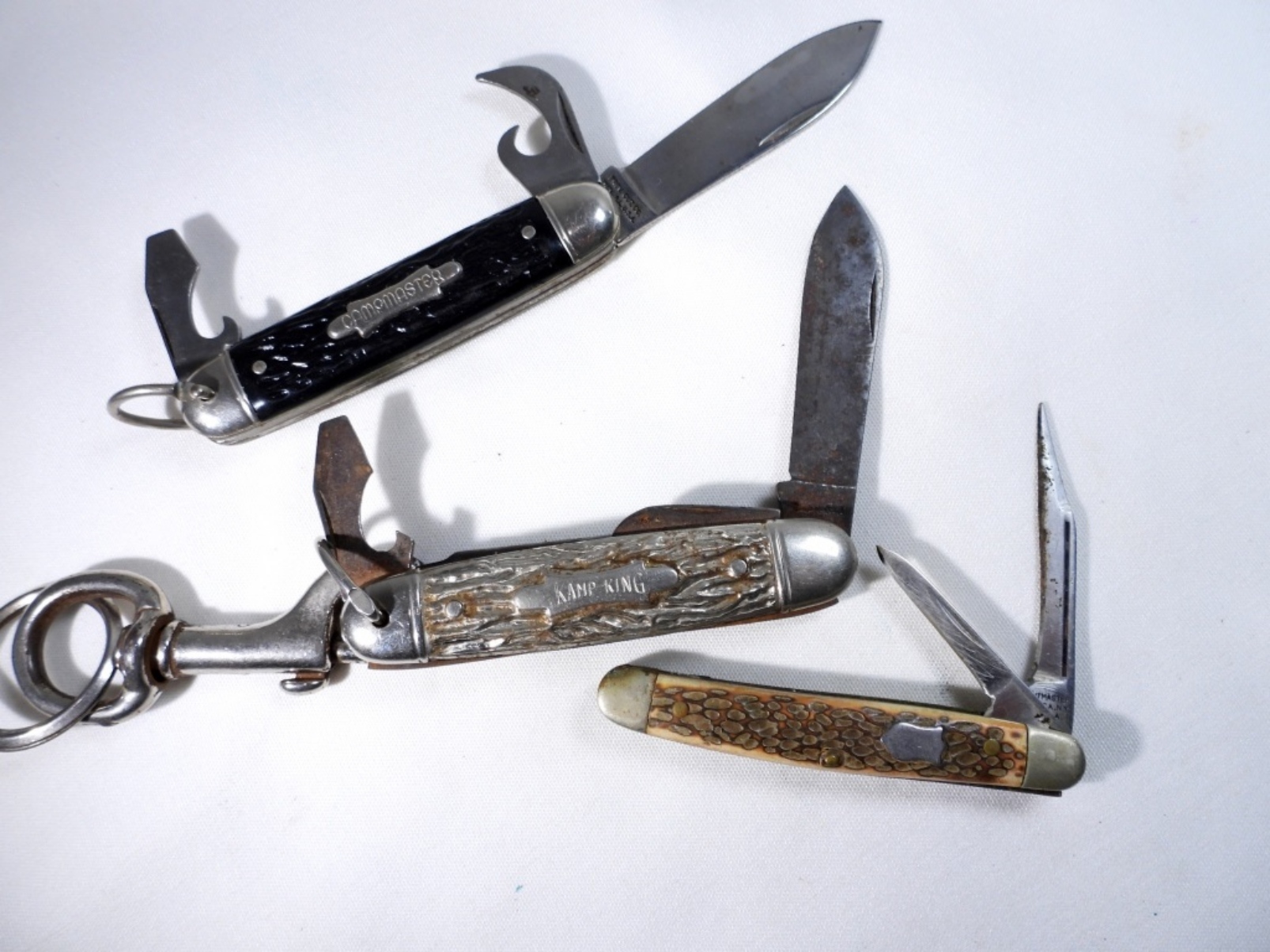 3 jigged bone pocket knives by various brands, assorted colors and sizes