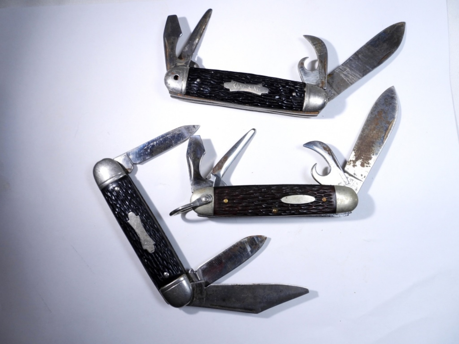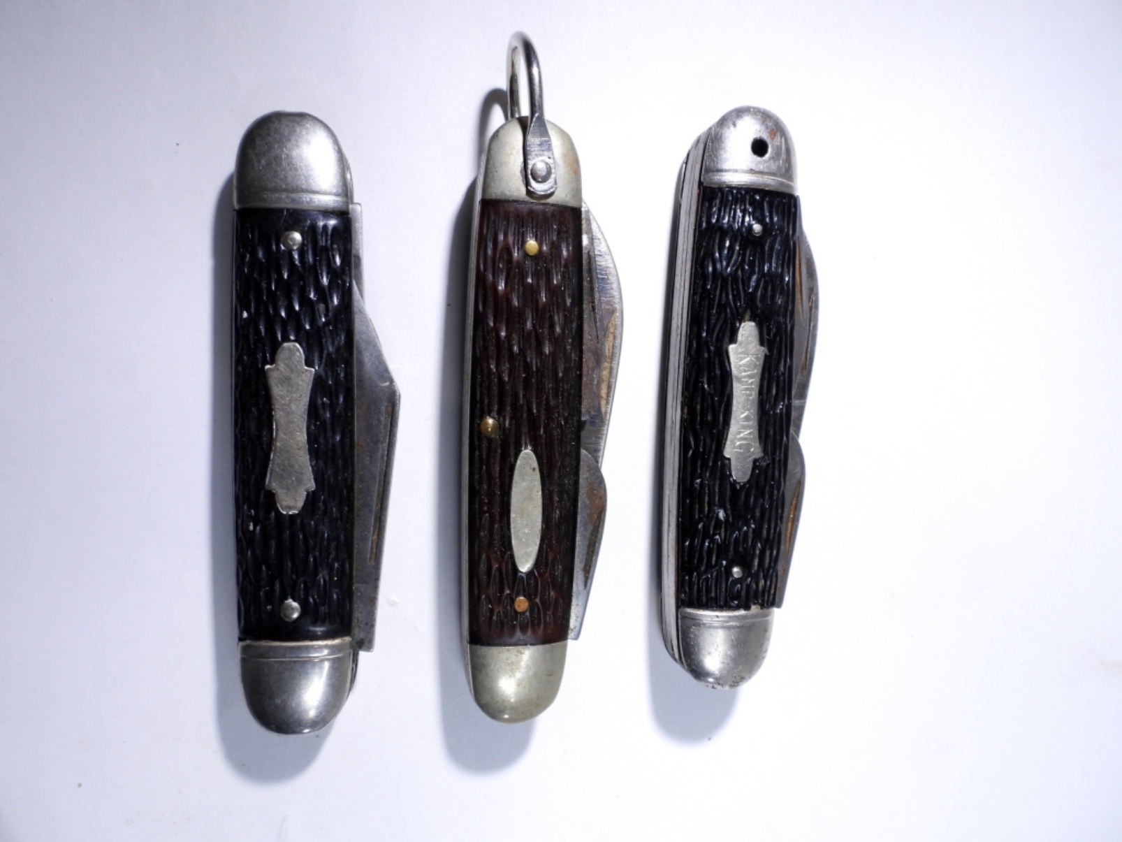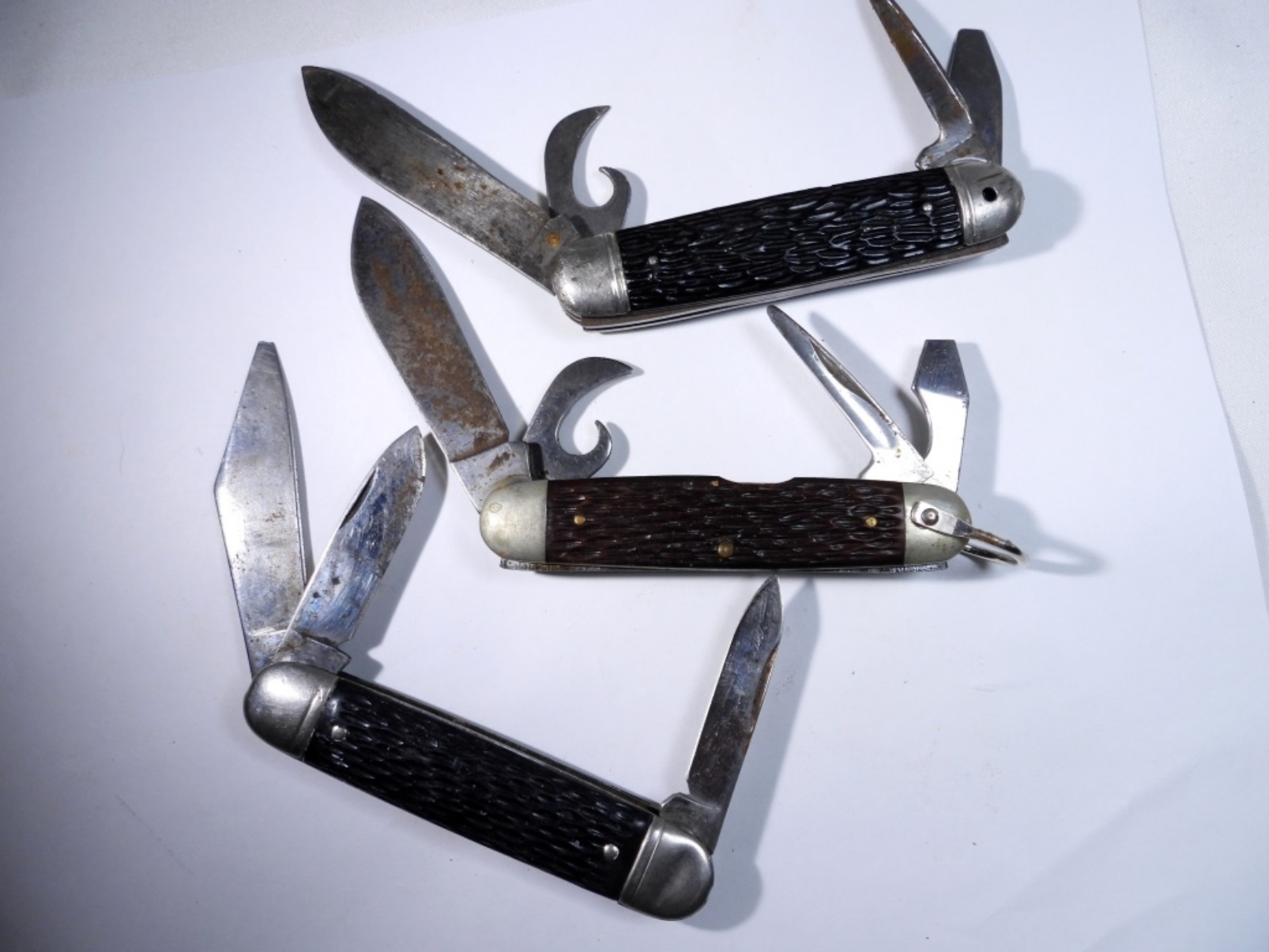 3 jigged bone pocket knives, by various brands, assorted colors and sizes