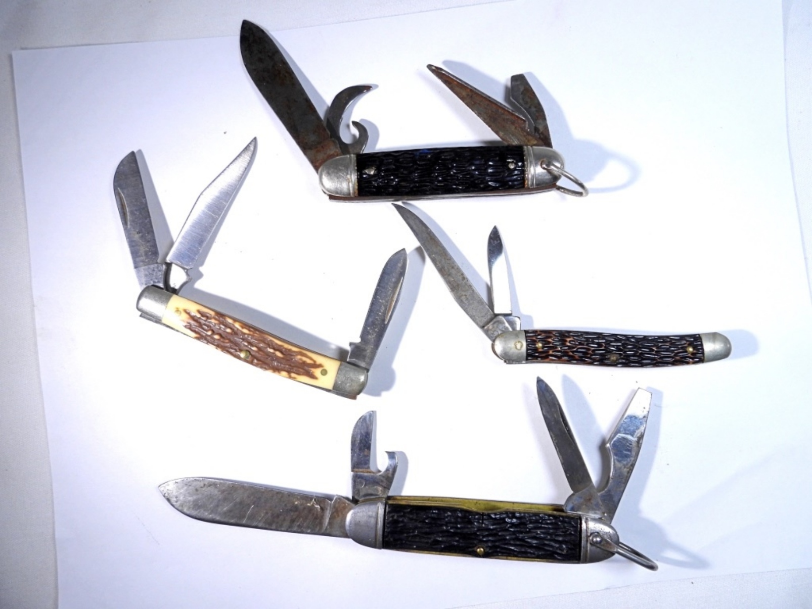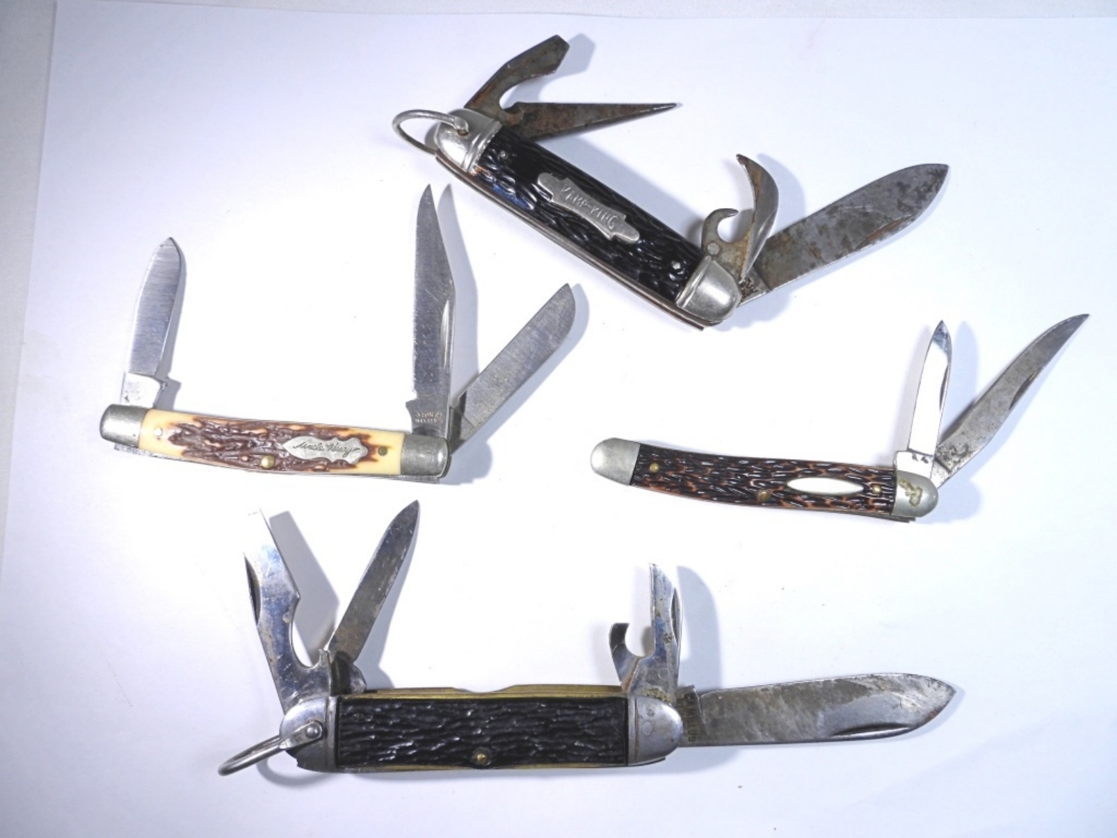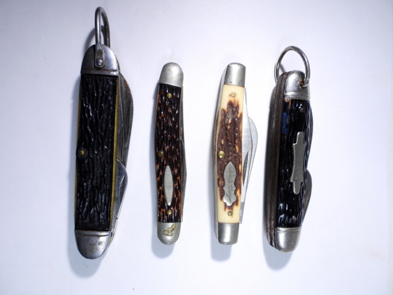 4 jigged bone pocket knives, by various brands, assorted colors and sizes