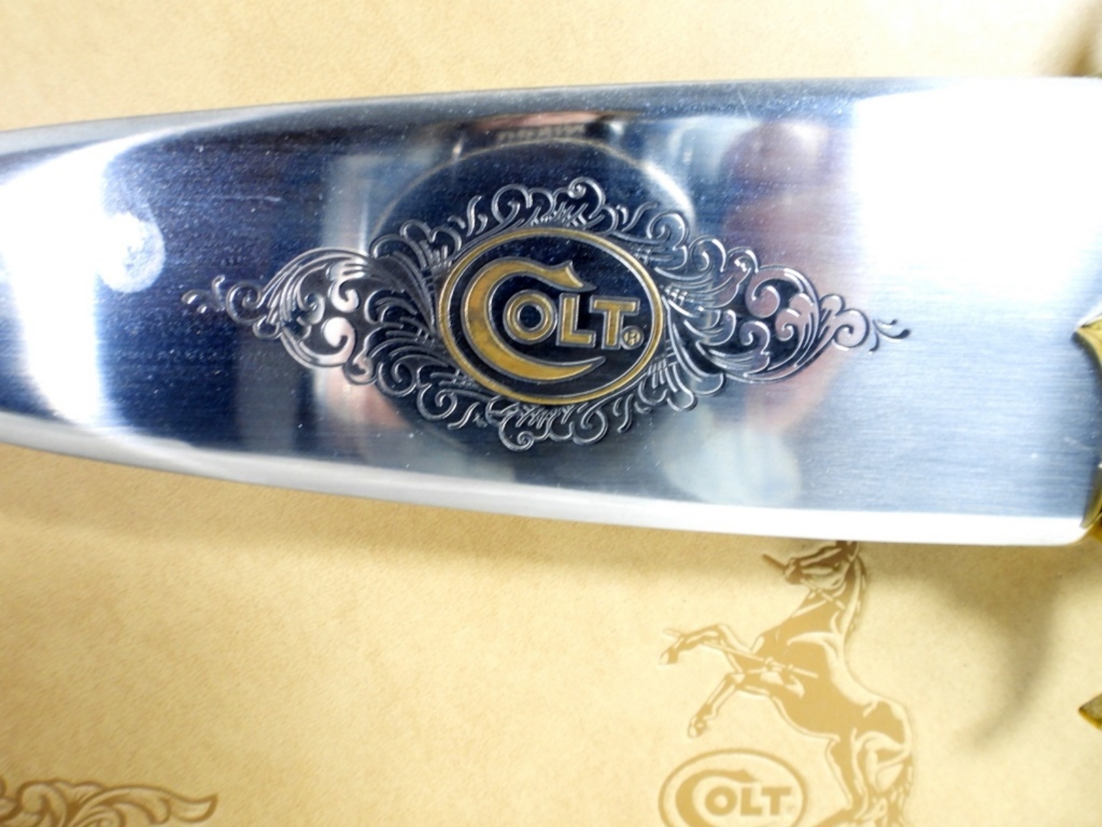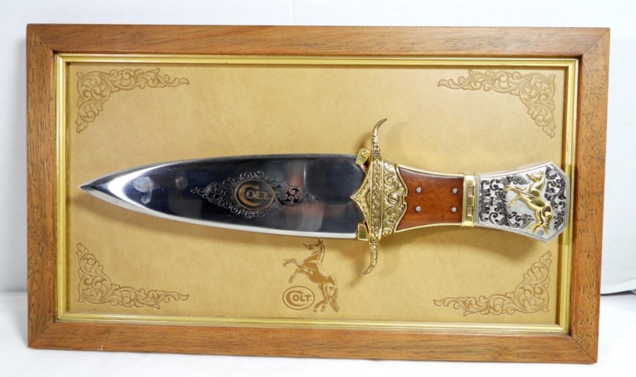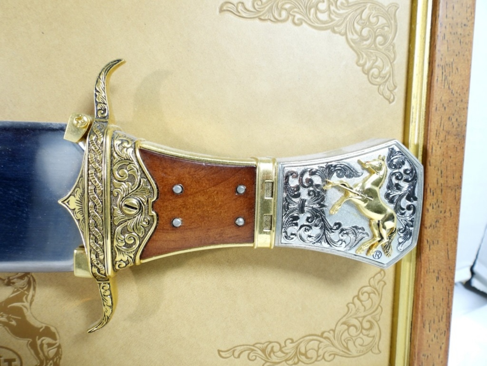 Franklin Mint Colt Art Bowine Knife Display, silver and gold, mounted