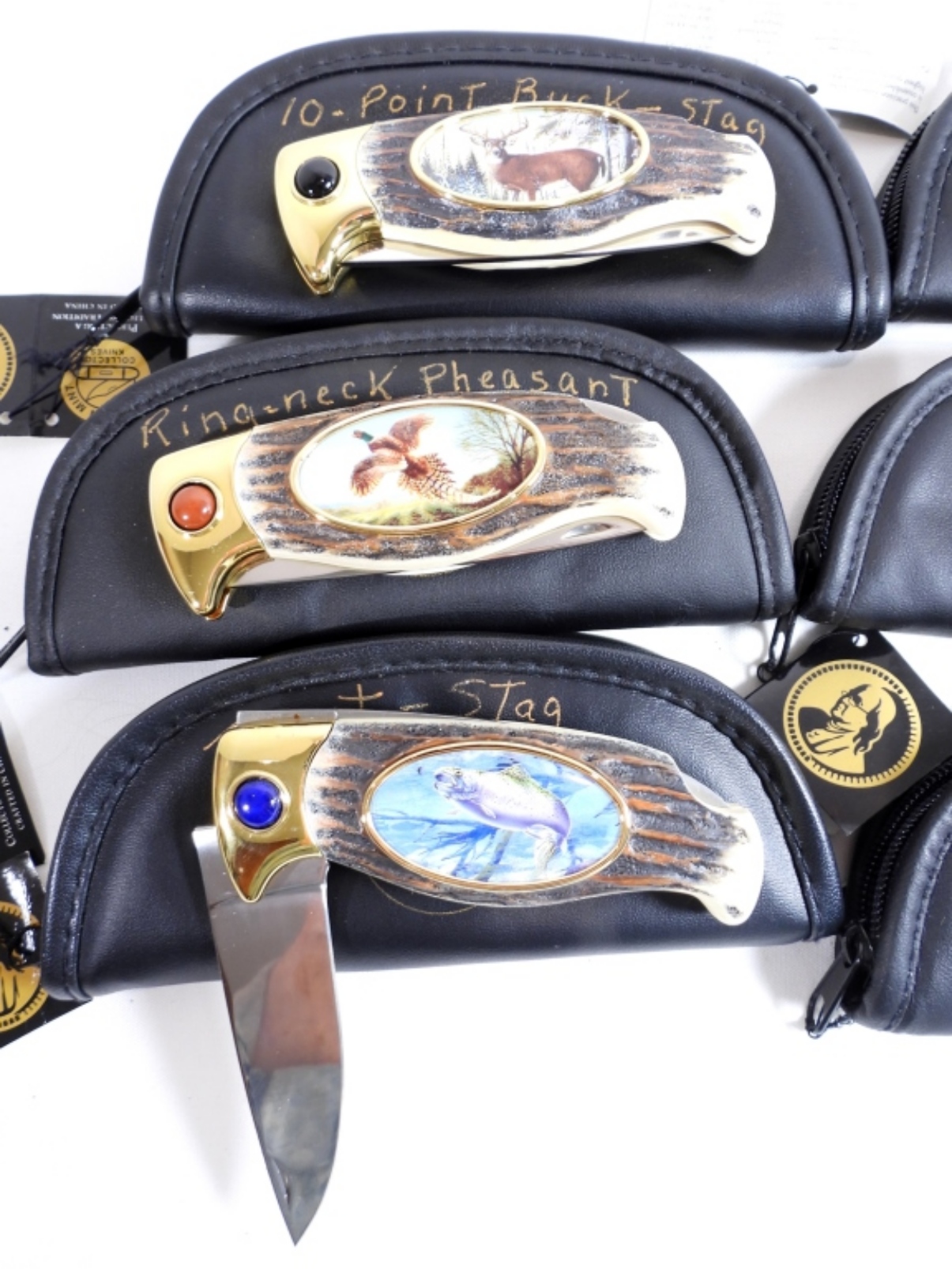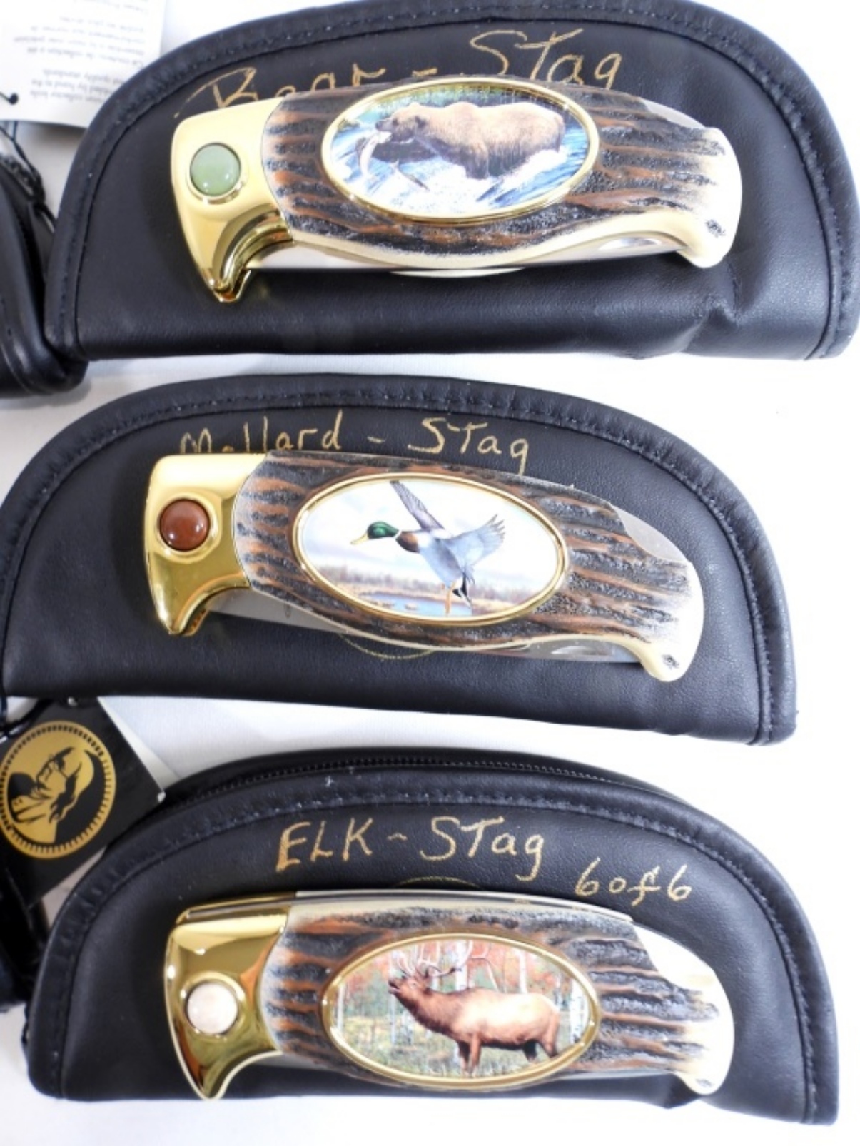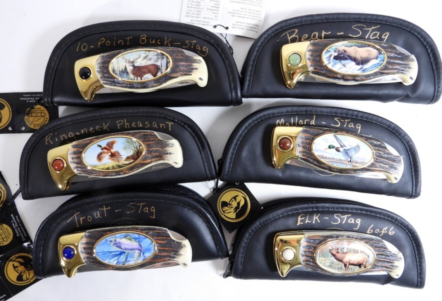 Set of 6 Franklin Mint Stag Knives with pouches, different animals on each one