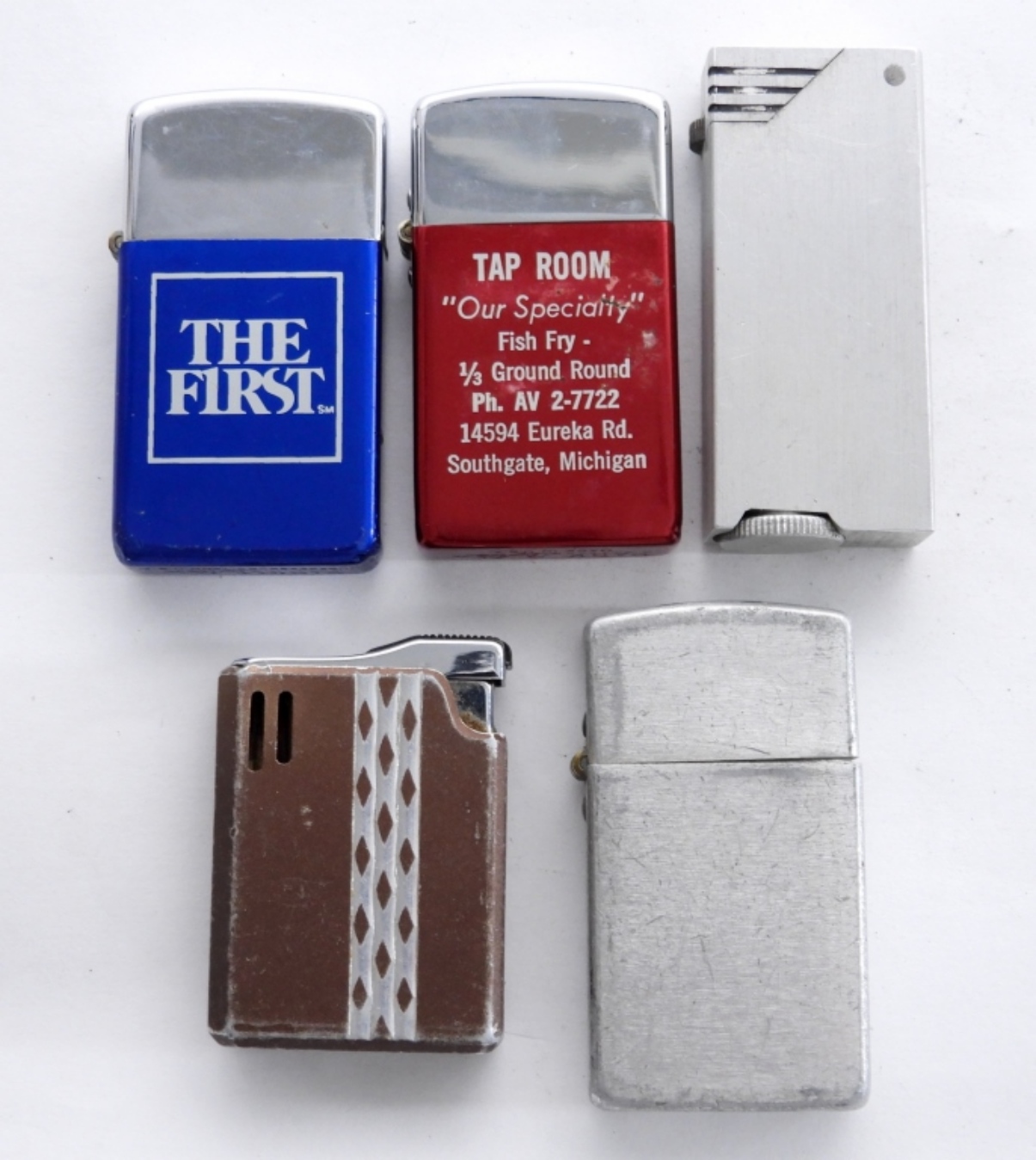 2- IN SILVER TONE- ONE IS A STORM KING- BOTH HAVE BEEN FIRED. TAP ROOM- RED AND SILVER TONE- FIRED. THE FIRST- BLUE AND SILVER TONED-FIRED. FIREBIRD- FIRED. ALL OF THESE LIGHTERS ARE IN GOOD CONDITION. THEY DO SHOW