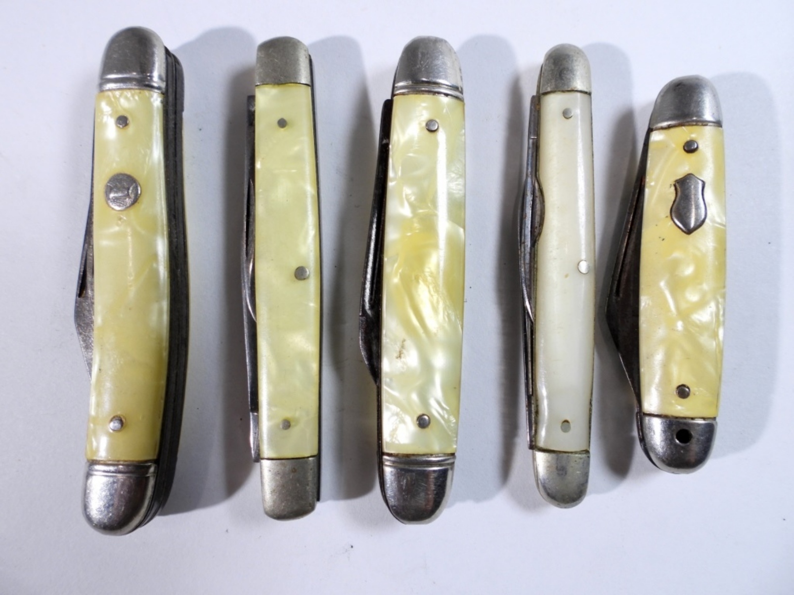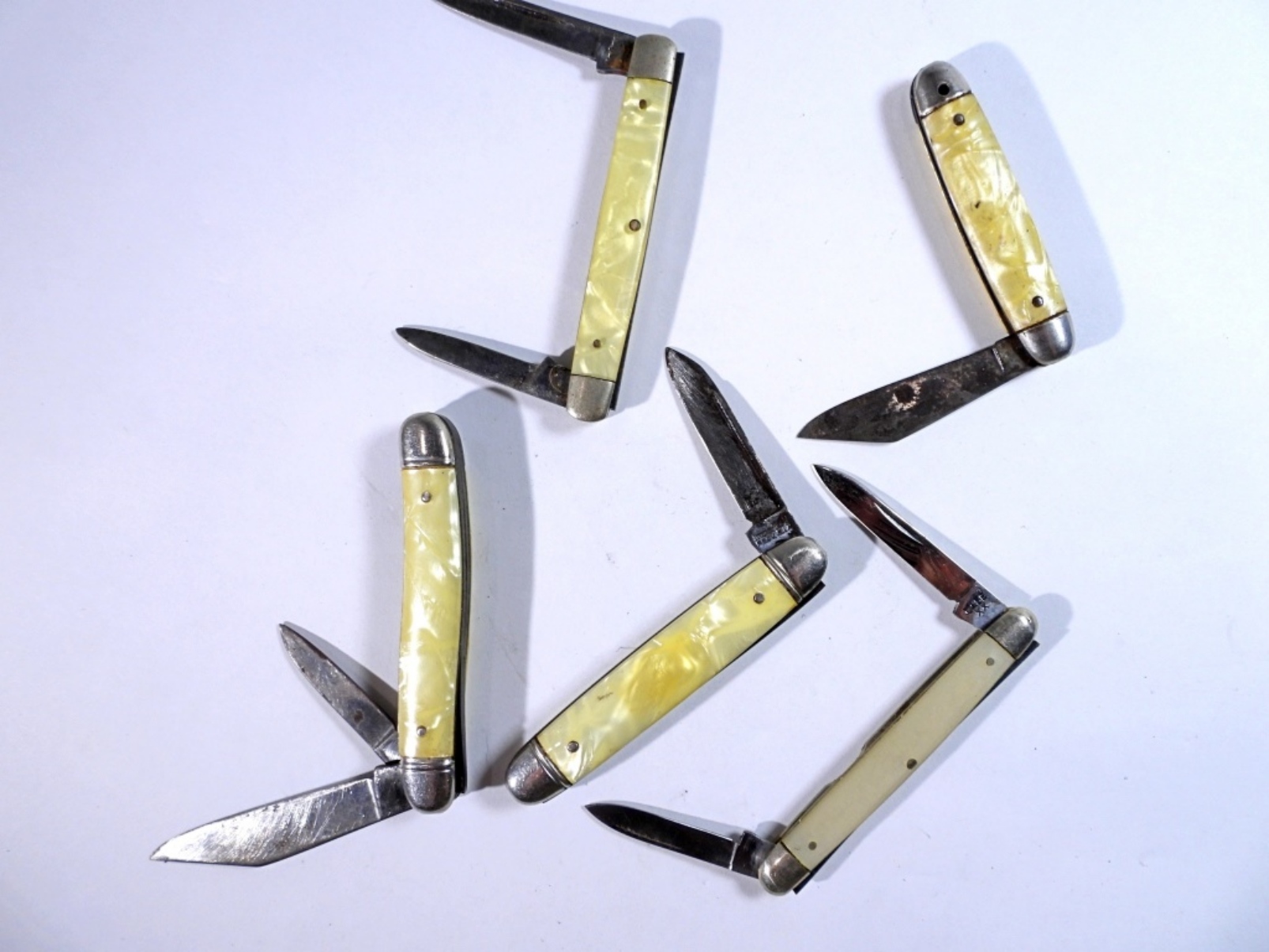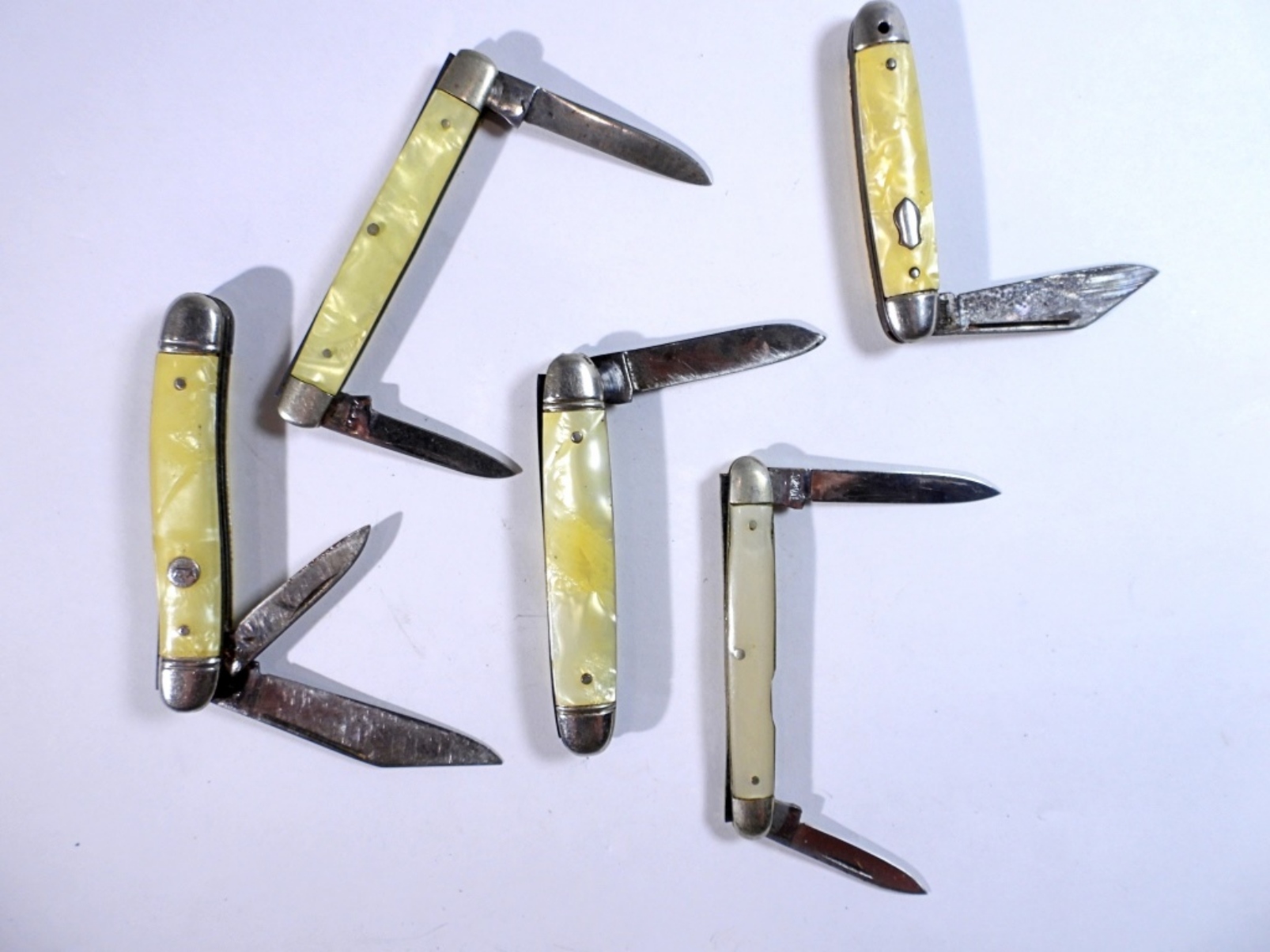 (5) MINI YELLOW FOLDING POCKET KNIVES, USED/PRE-OWNED
