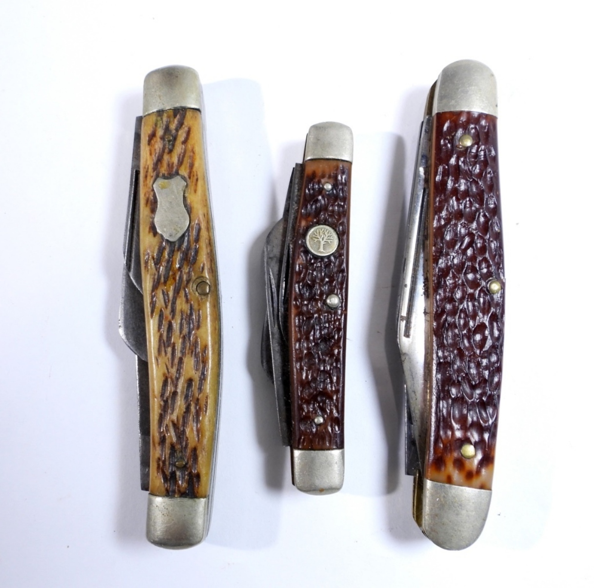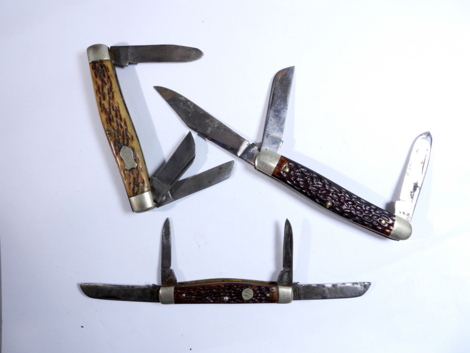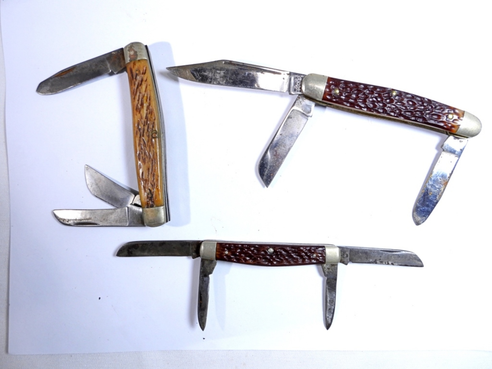 3 vintage pocket knives by various brands, assorted colors and sizes