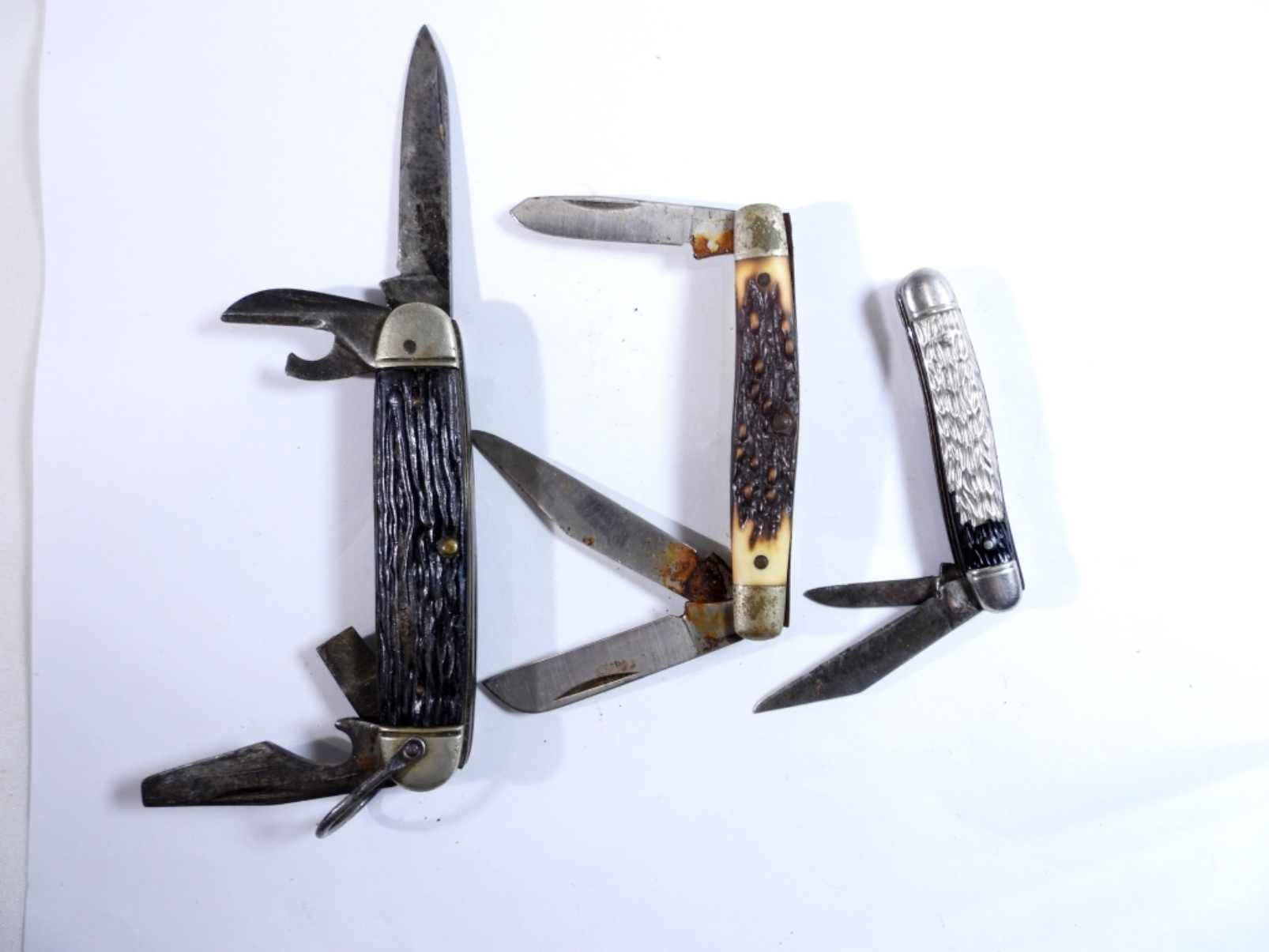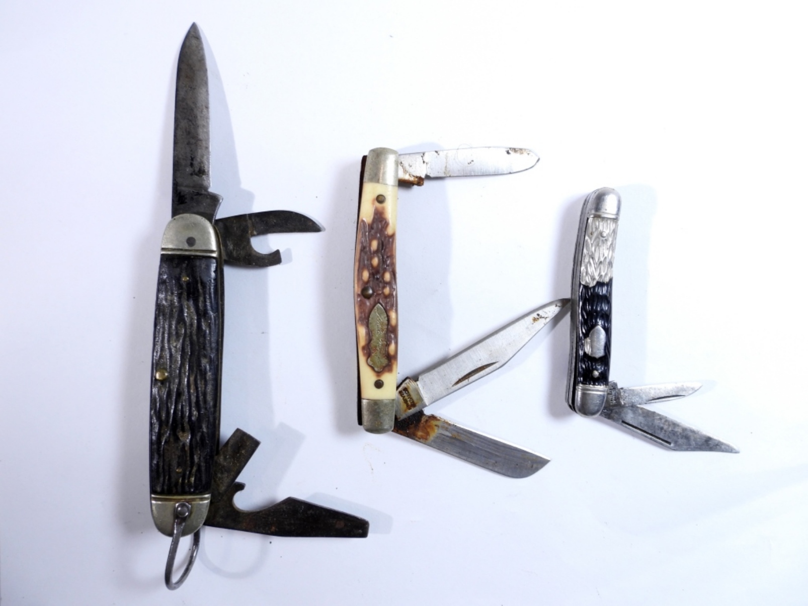 3 vintage pocket knives by various brands, assorted colors and sizes