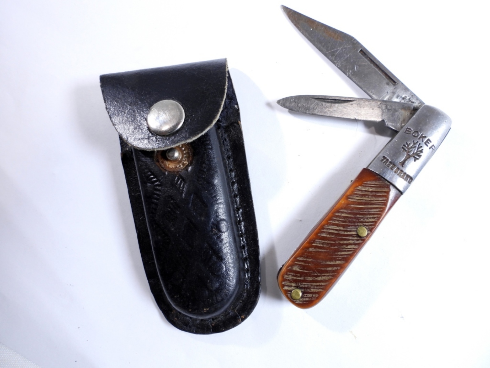 Wood handle Tree Brand boker with multiple blades with leather sheath