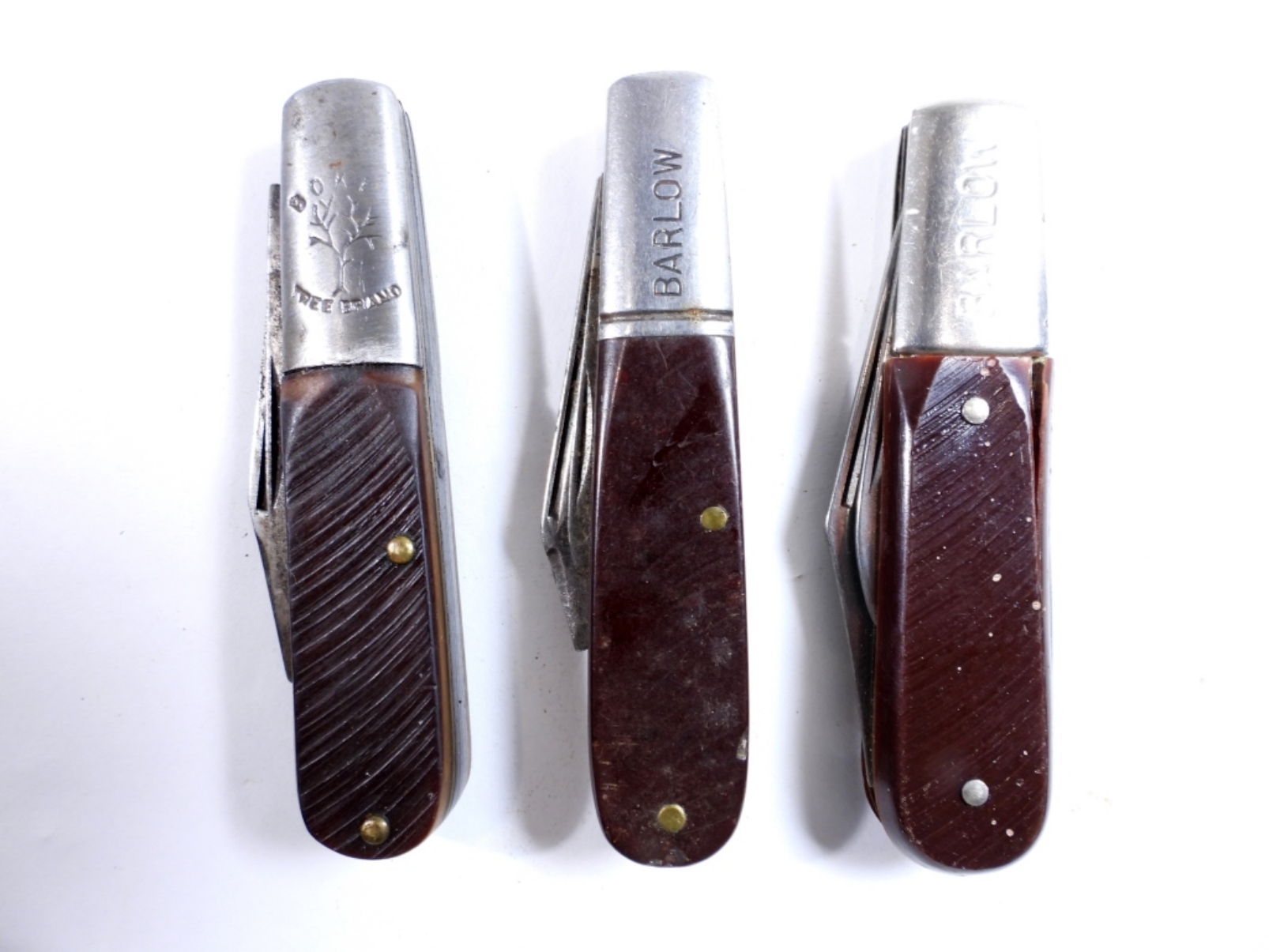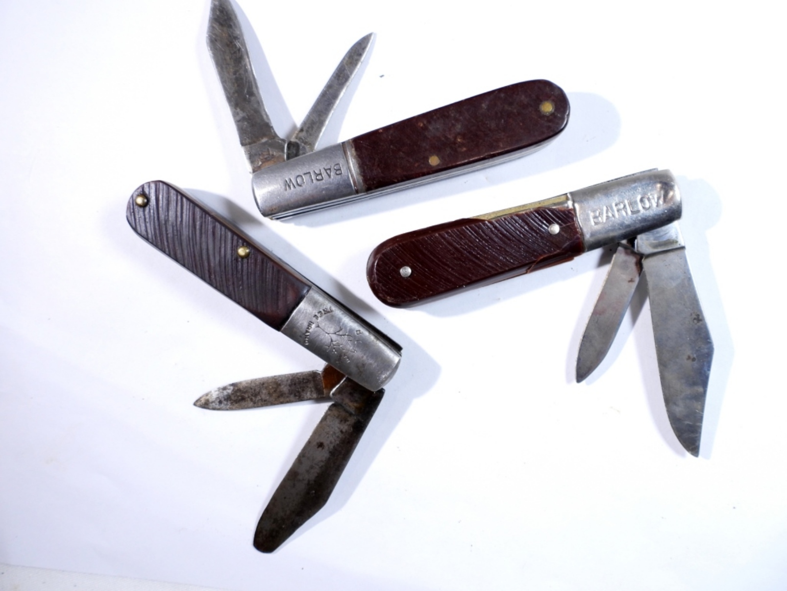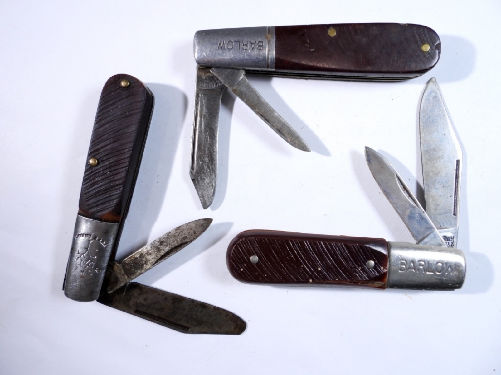 3 Barlow Style pocket knives by variosu brands, assorted colors and sizes