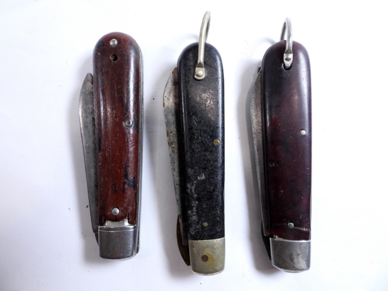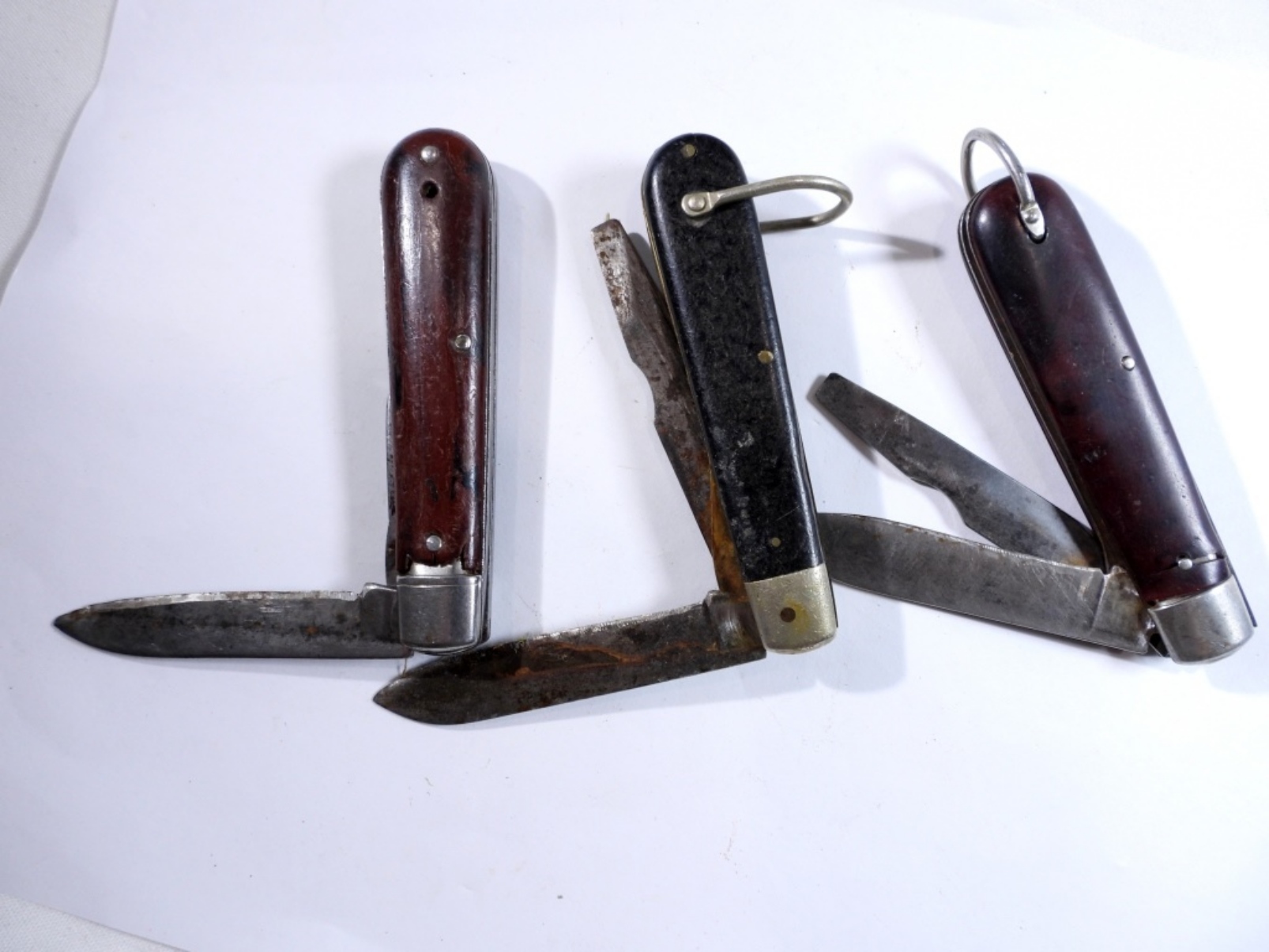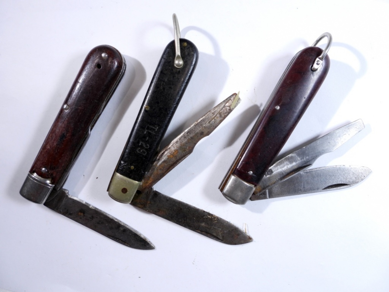 3 electrician style pocket knives by various brands, assorted colors and sizes