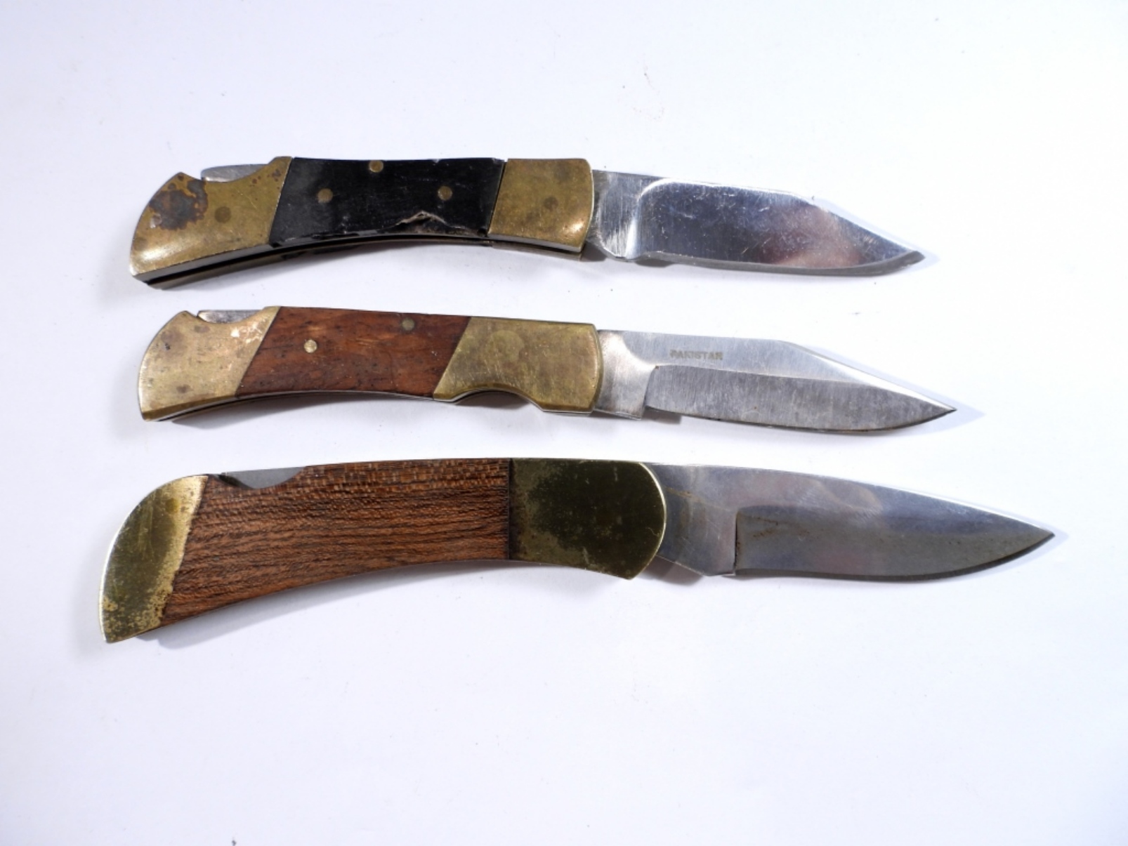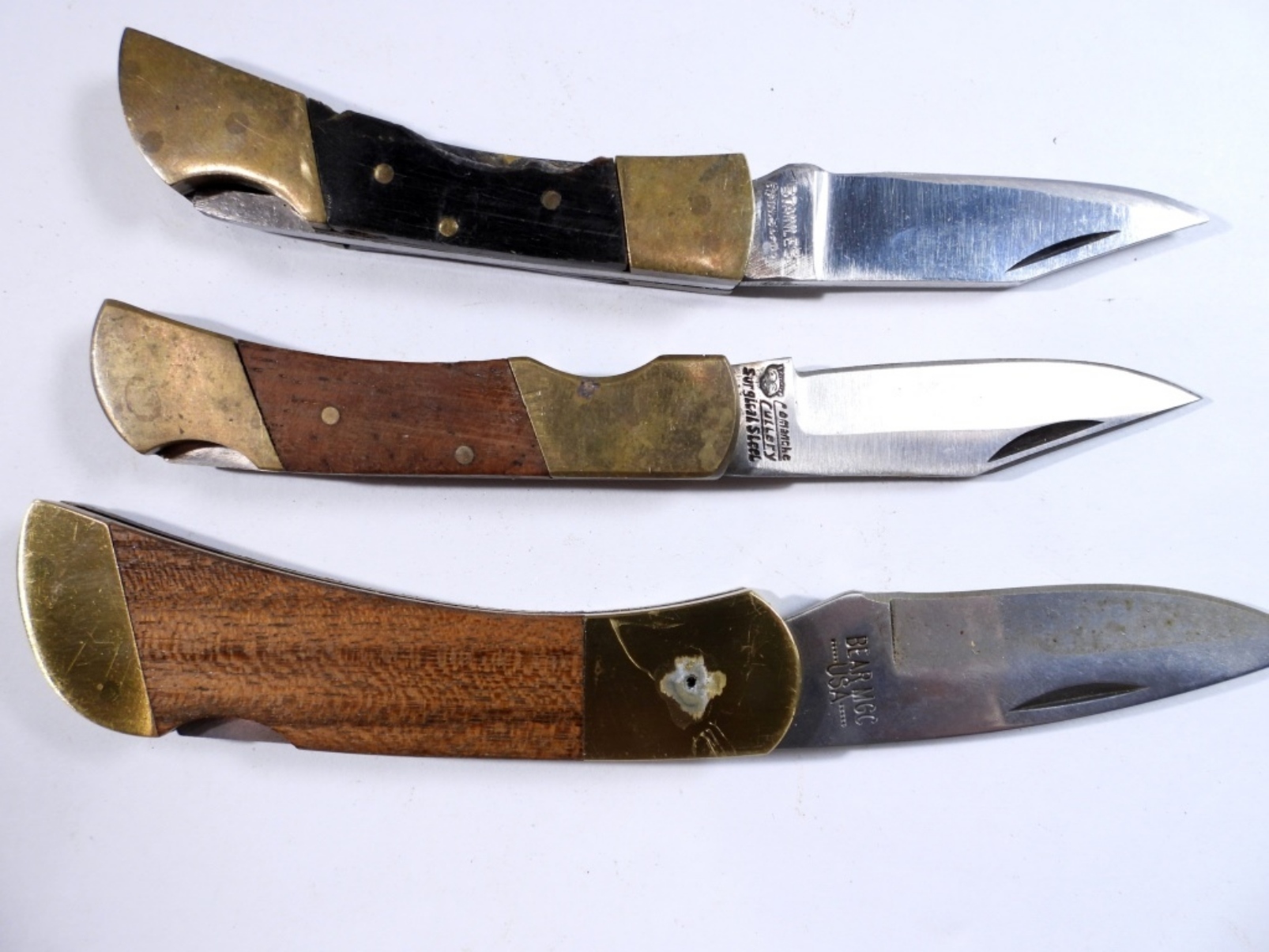 3 lock back pocket knives by various brands, assorted colors and sizes