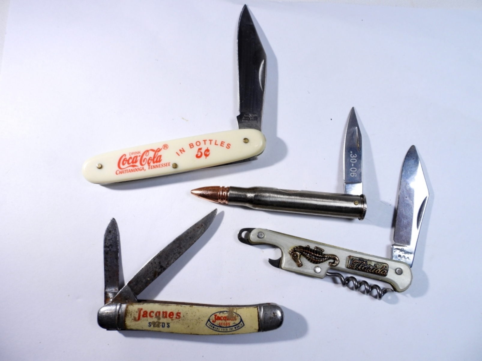(4) DESIGNED MINI POCKET KNIVES, DESIGNS (COCA COLA, SEA HORSE, JACQUES SEEDS, NULLET), USED/PRE-OWNED