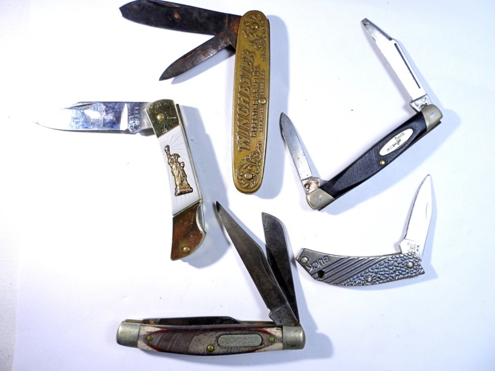 (5) DESIGNED MINI POCKET KNIVES, DESIGNS (OLD TIMER, LADY LIBERTY, WINCHESTER, BUCK), USED/PRE-OWNED