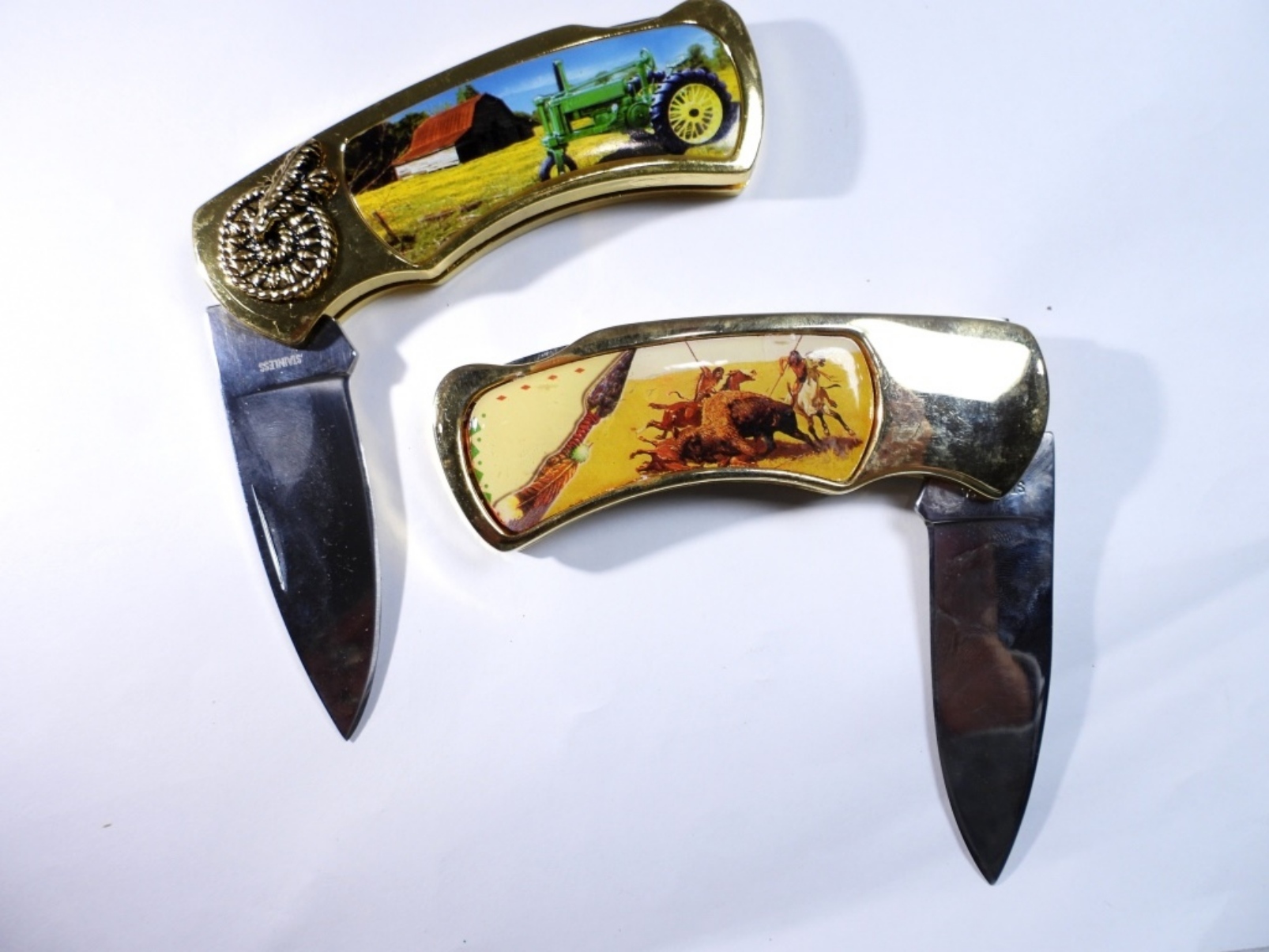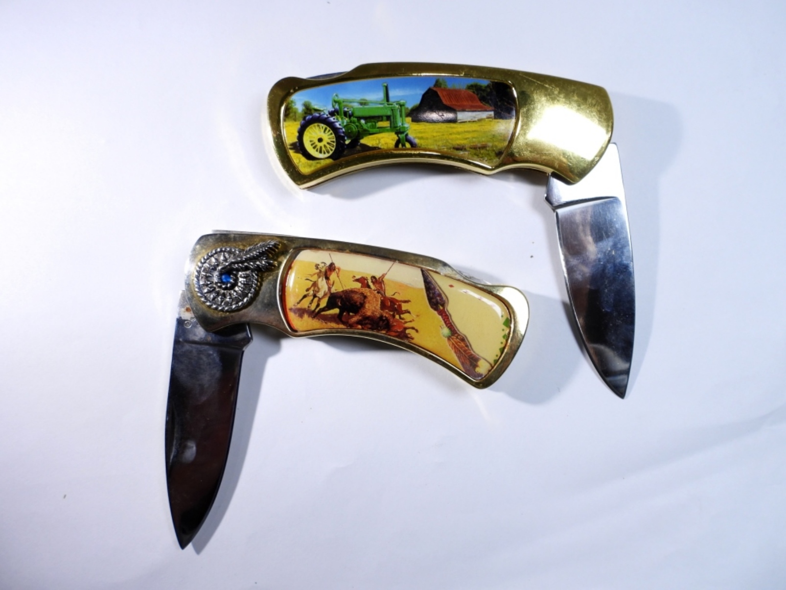 (2) TRACTOR/INDIAN STYLE POCKET KNIVES, BLADE 3”, KNIFE 7” ALL TOGETHER, KNIVES DO NOT COME IN ORIGINAL BOXES
