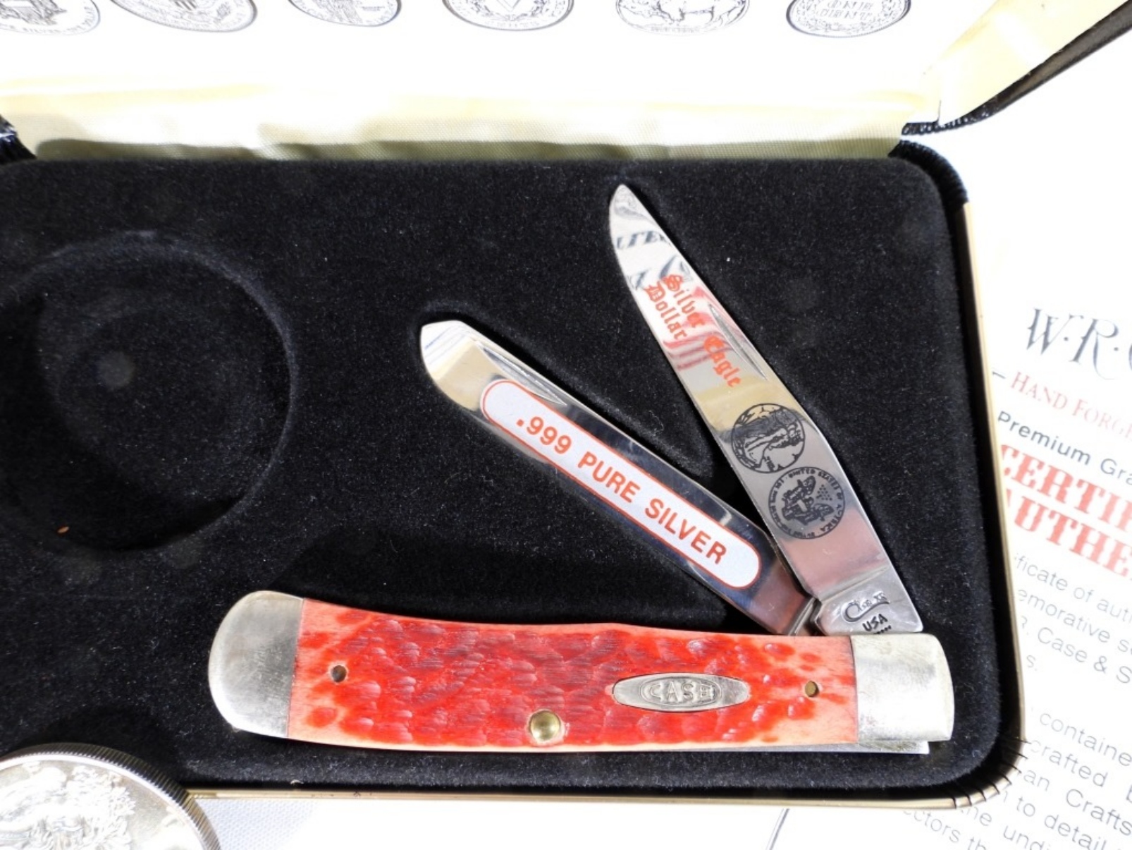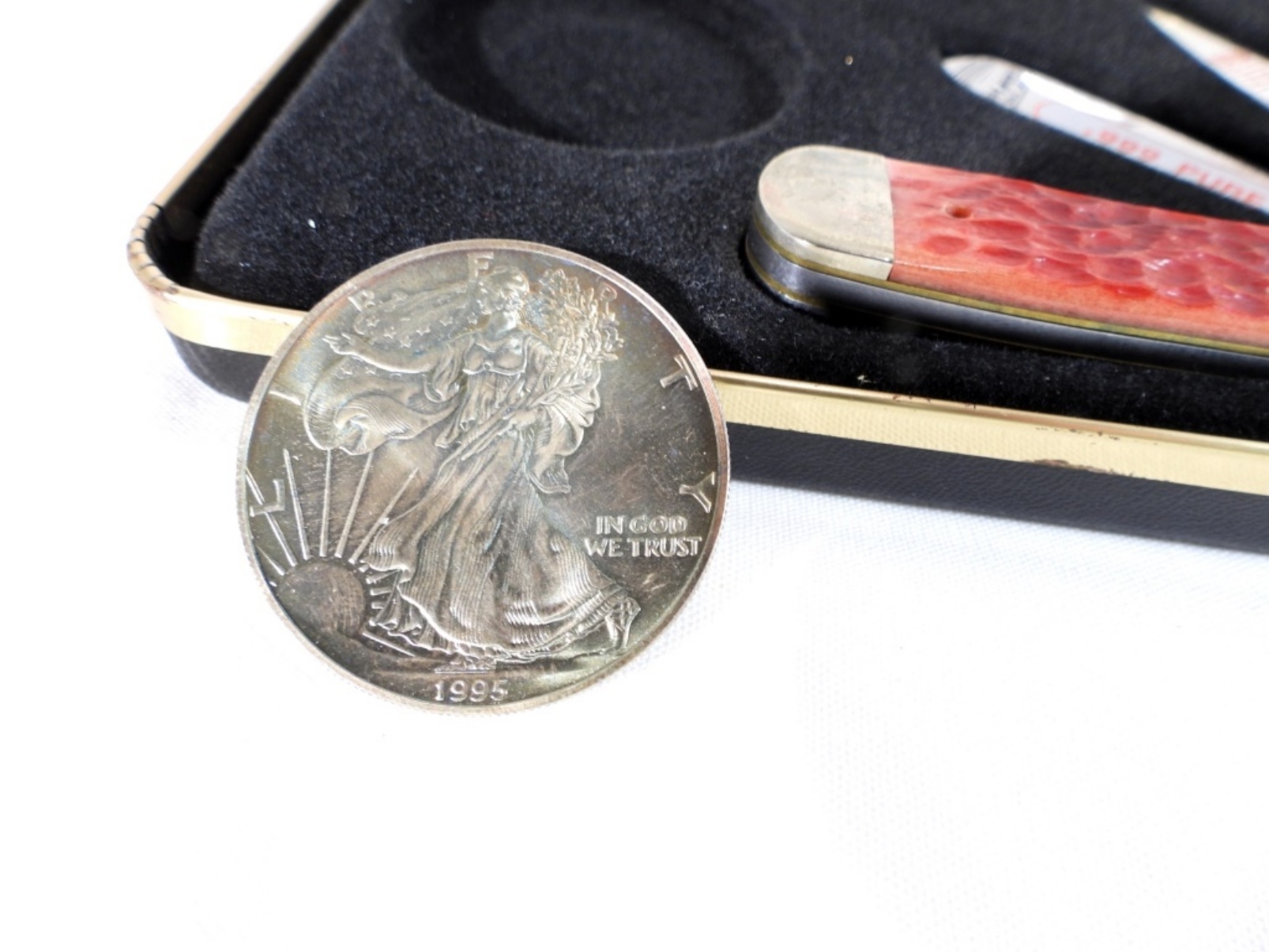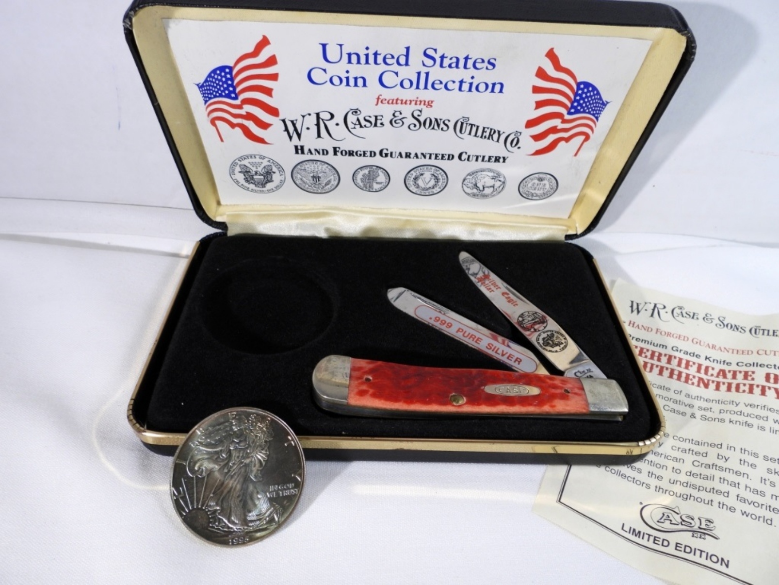 U.S. COIN COLLECTION CASE KNIFE, SET COMES WIT 1 U.S. SILVER DOLLAR, BLADE 3”, KNIFE 7.25” ALL TOGETHER, KNIFE AND COIN DO COME IN ORIGINAL CASING