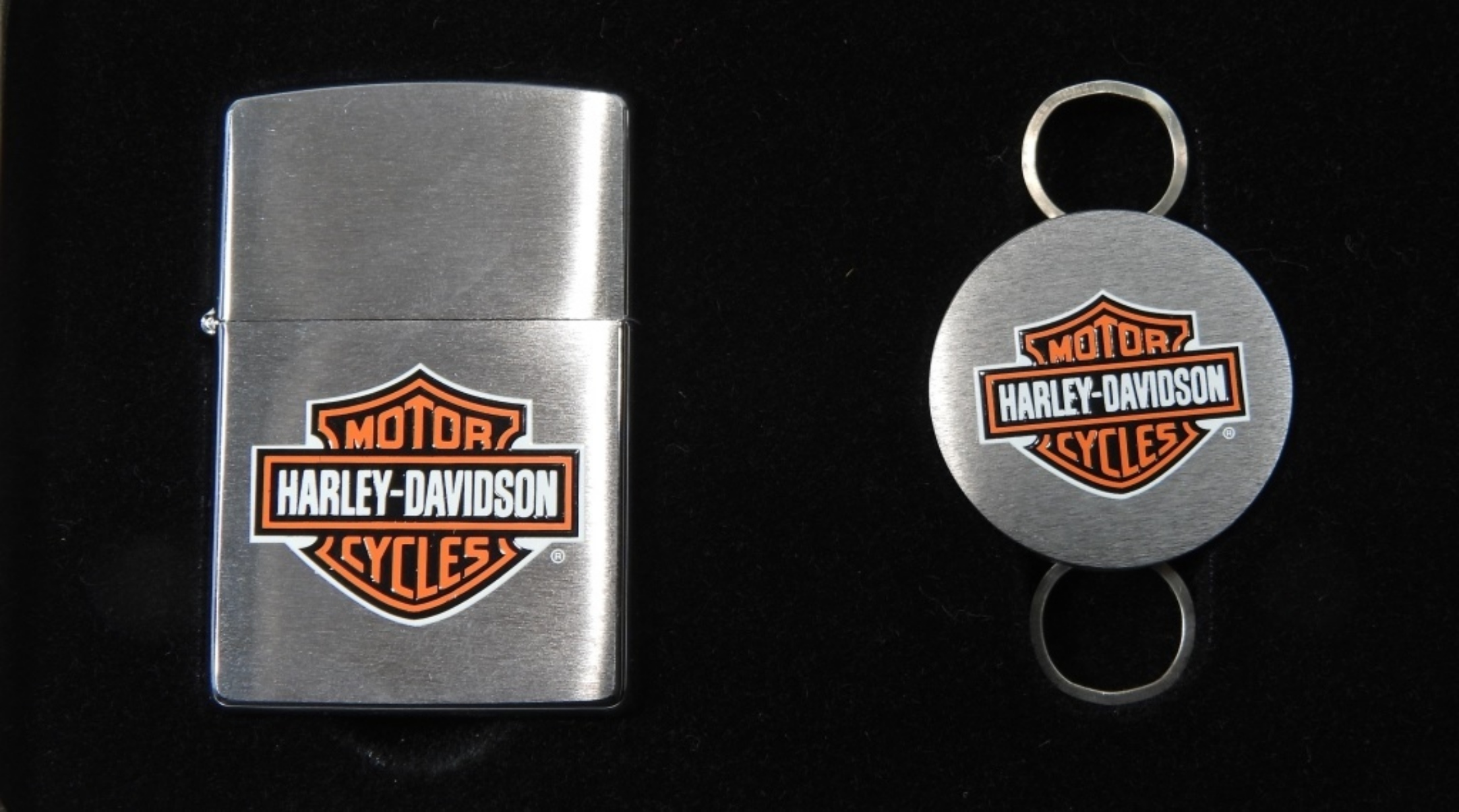 IN ORIGINAL HARLEY-DAVIDSON GIFT SET. HAS LOGO ON LIGHTER AND KEY RING, 1997