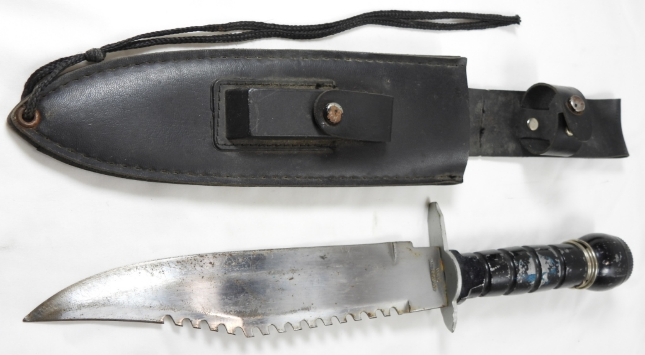 HUNTING KNIFE IN SHEATH, BLADE 9”, KNIFE 14” ALL TOGETHER, KNIFE DOES COME WITH ORIGINAL SHEATH