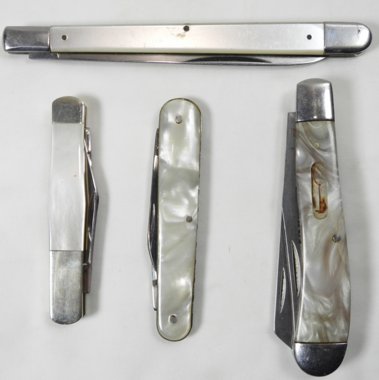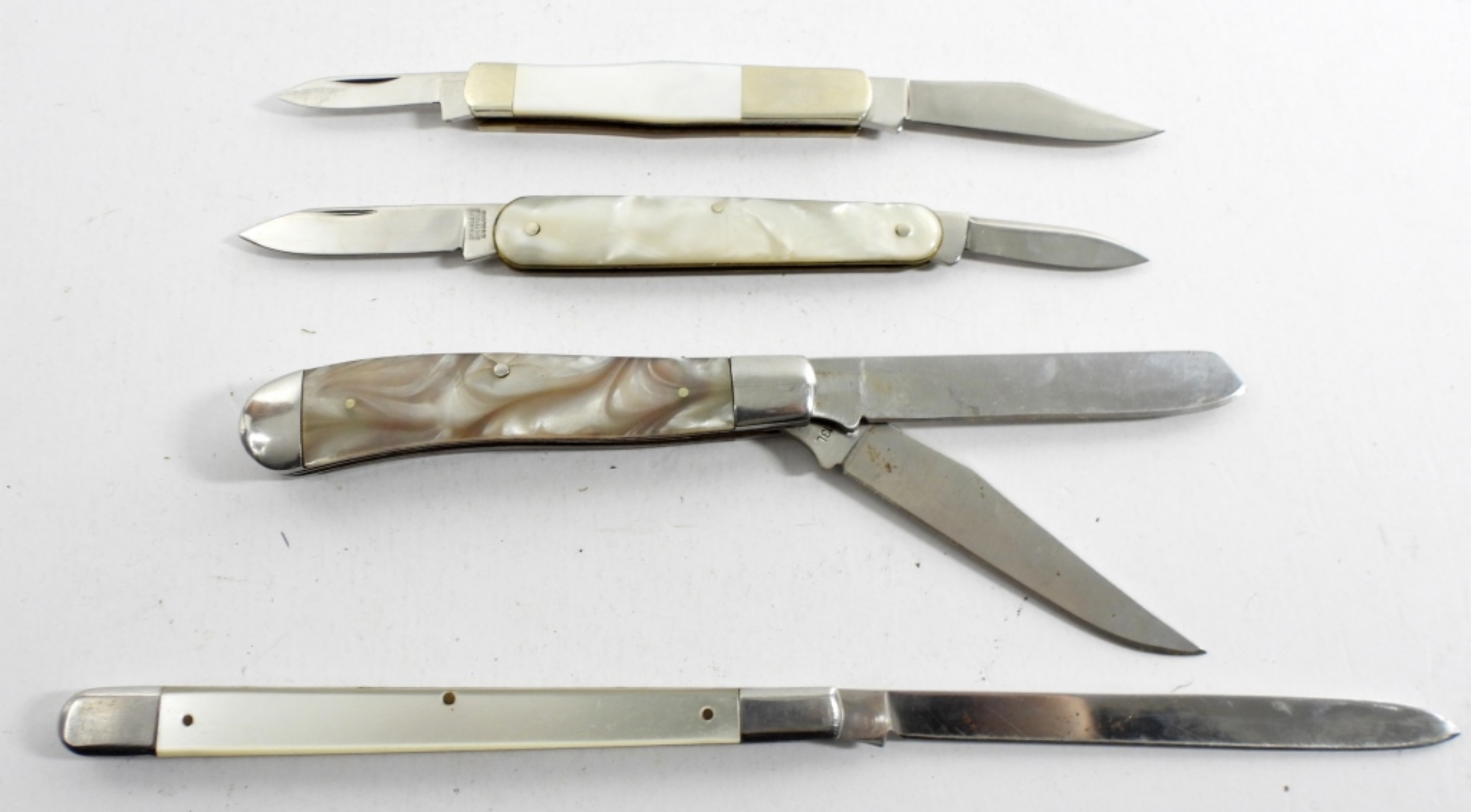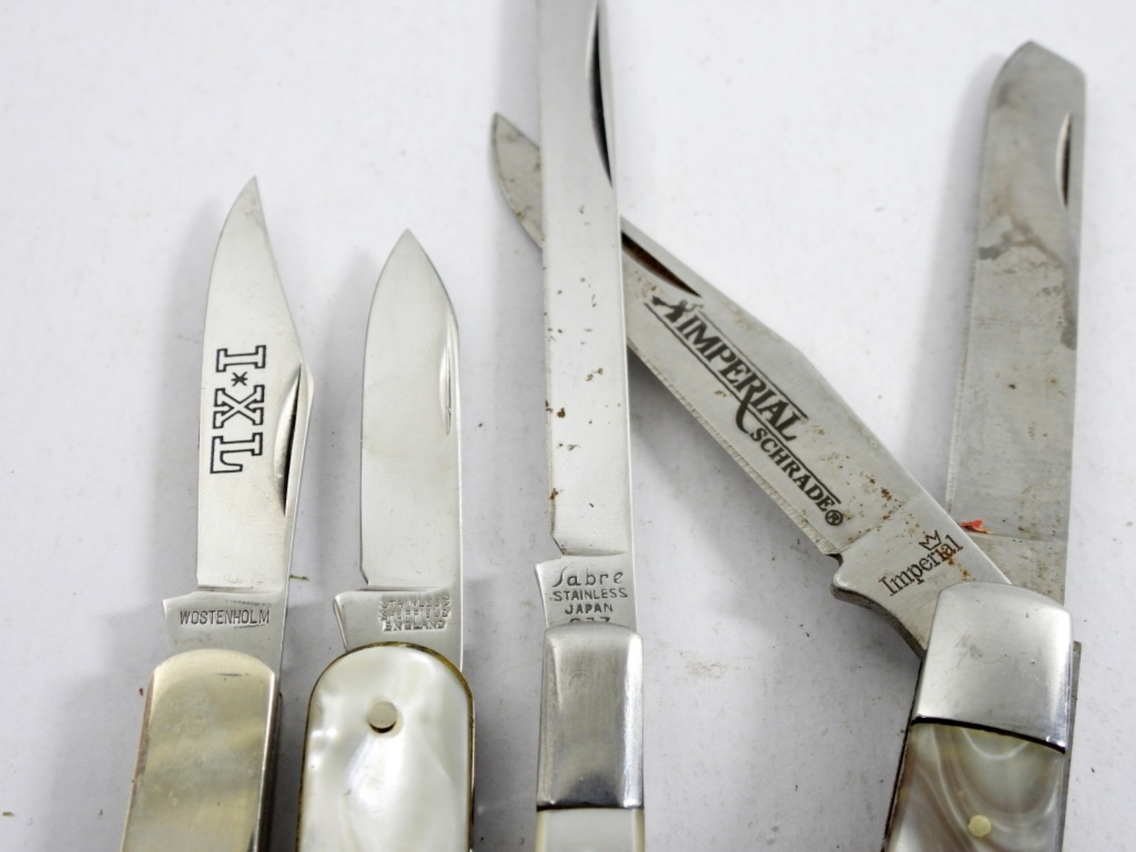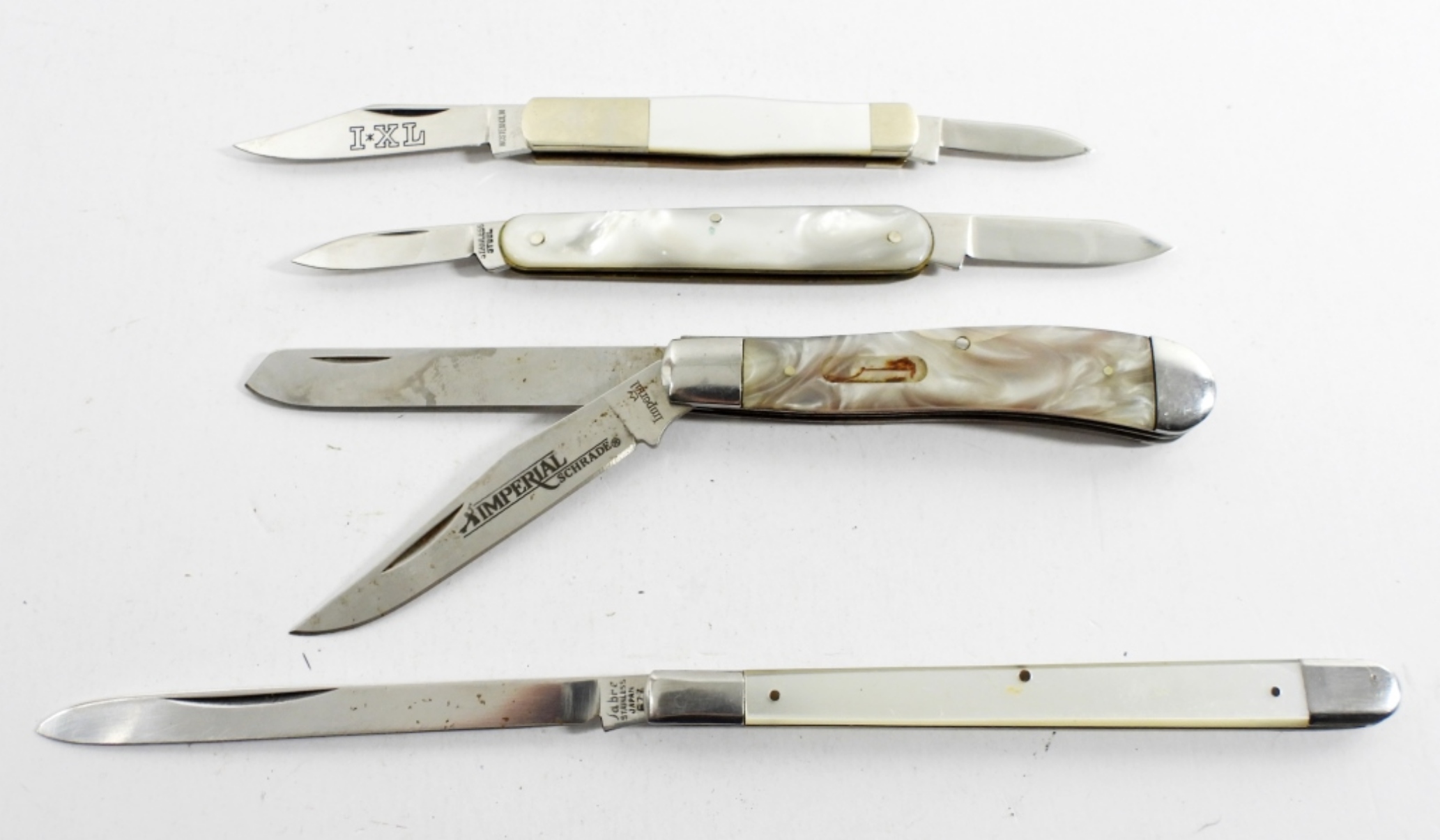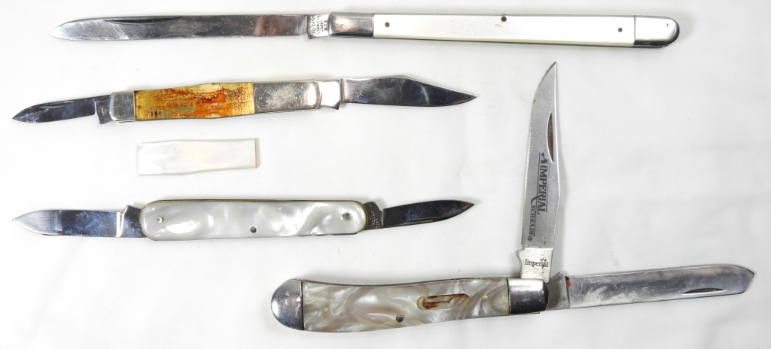 SABRE FRUIT KNIFE, SHEFFIELD TWO BLADE, WOSTENHOLM IXL TWO BLADE & IMPERIAL TWO BLADE missing emblem on handle – ALL PRE OWNED NICE CONDITION