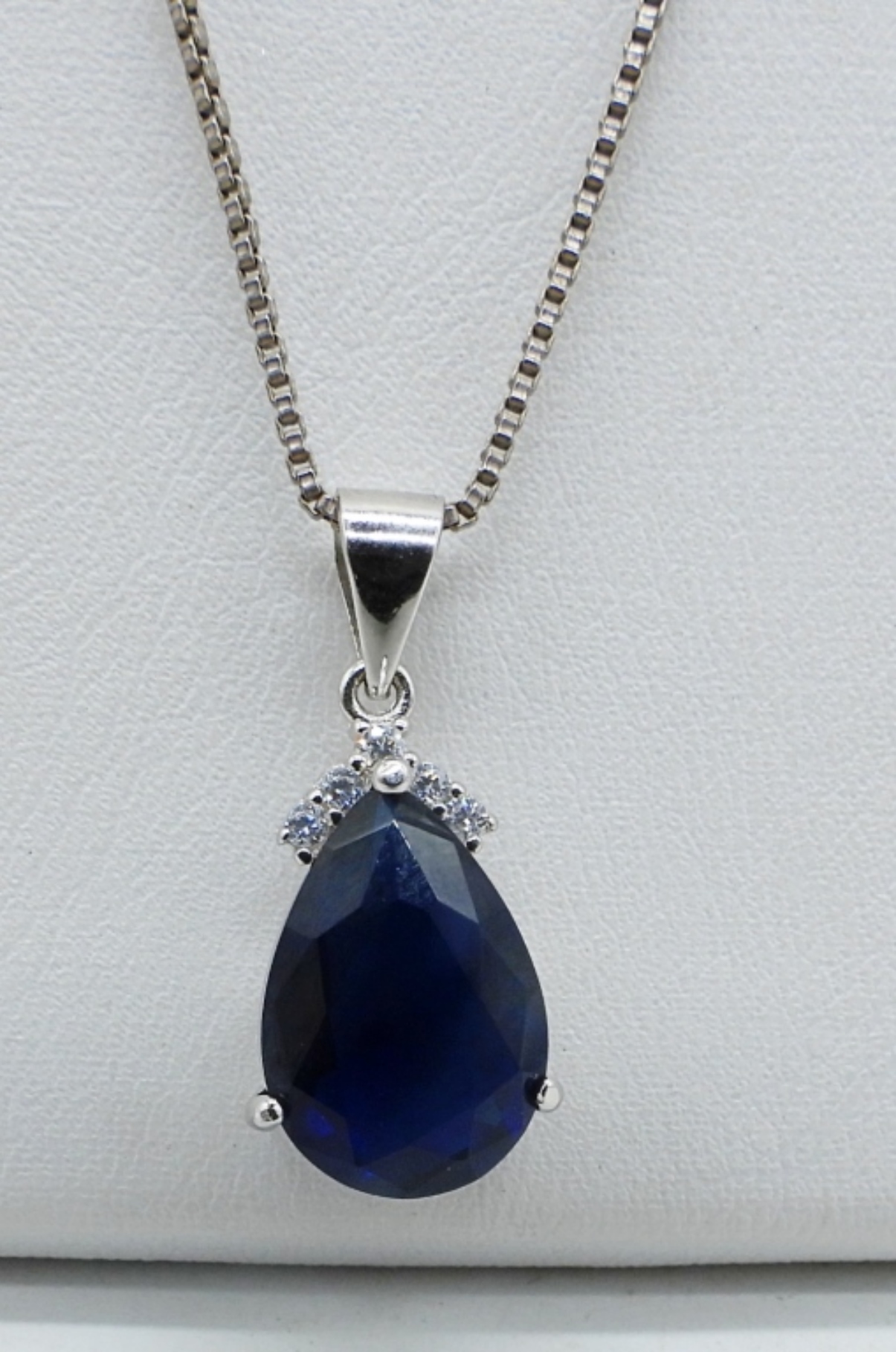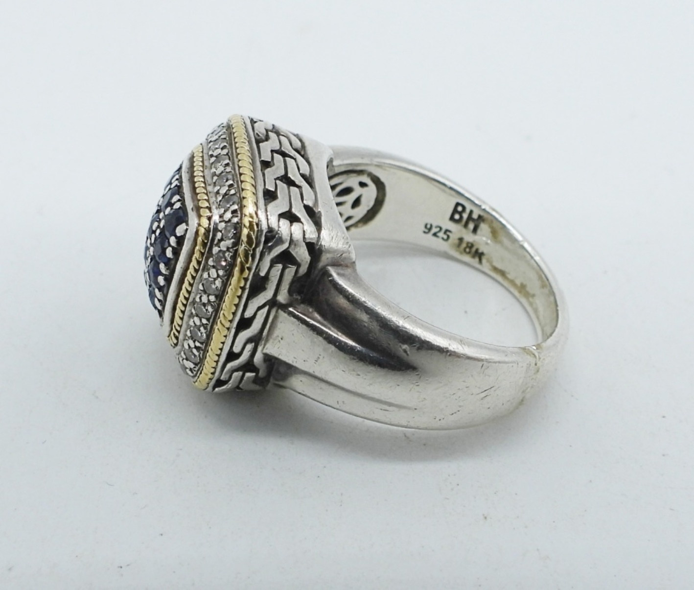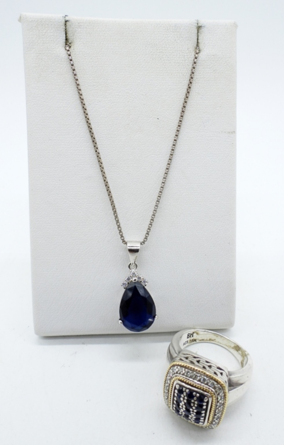 INCREDIBLY GORGEOUS STERLING RING WITH 18K GOLD ACCENTS. SAPPHIRES IN THE CENTER AND DIAMONDS AROUND THE OUTER CROWN. SIZE 7. SIMULATED SAPPHIRE GEMSTONE PENDANT ON A STERLING 18″ CHAIN. (10.6 DWT)