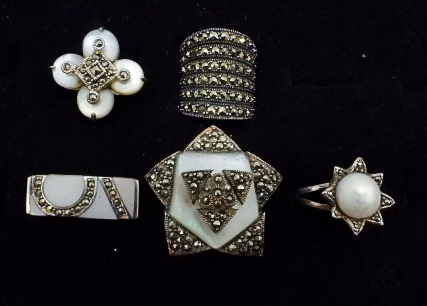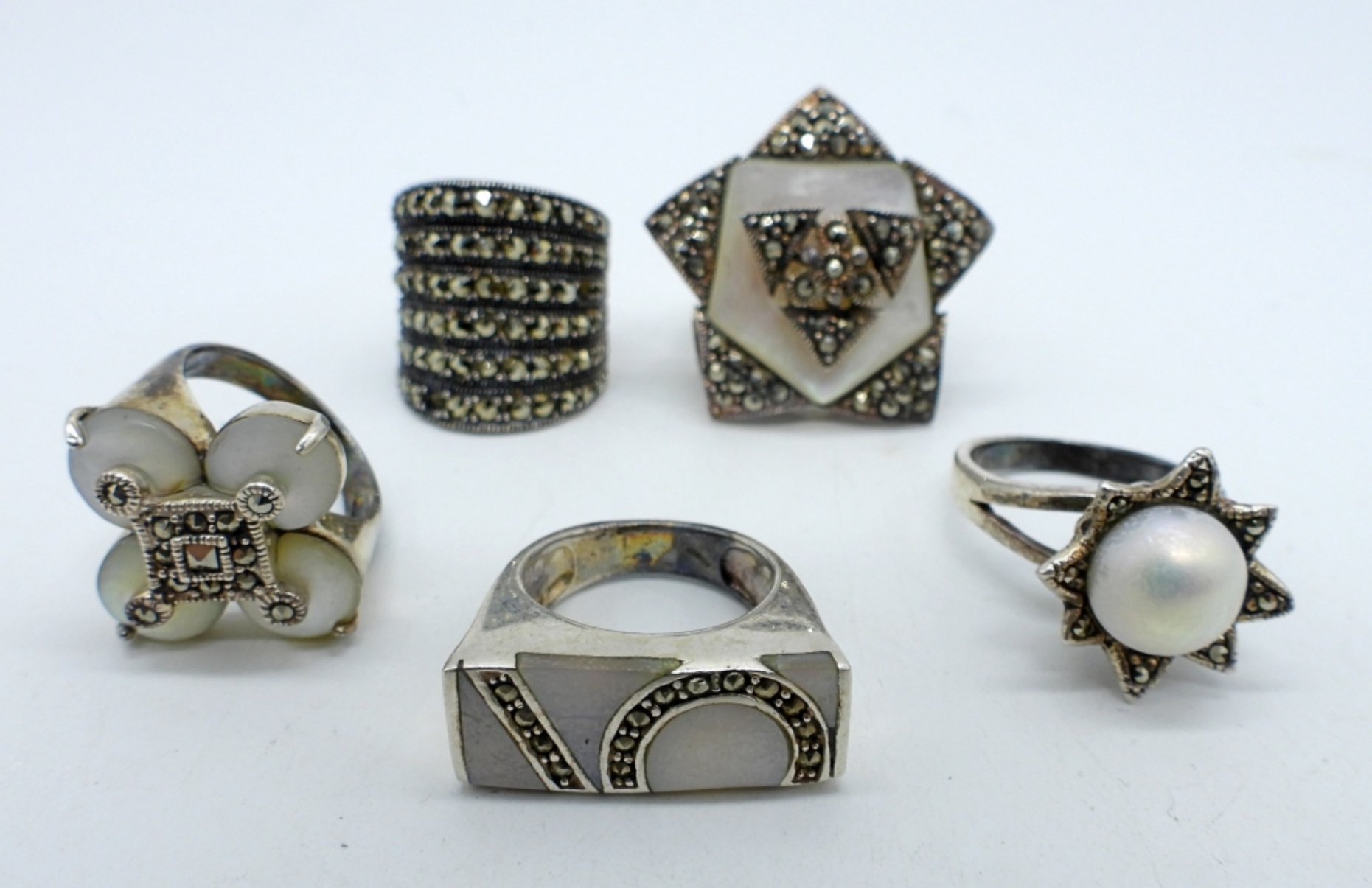 FIVE STERLING RINGS WITH MARCASITE, MOTHER OF PEARL & PEARL RINGS. SIZES 6-7. (26 DWT)