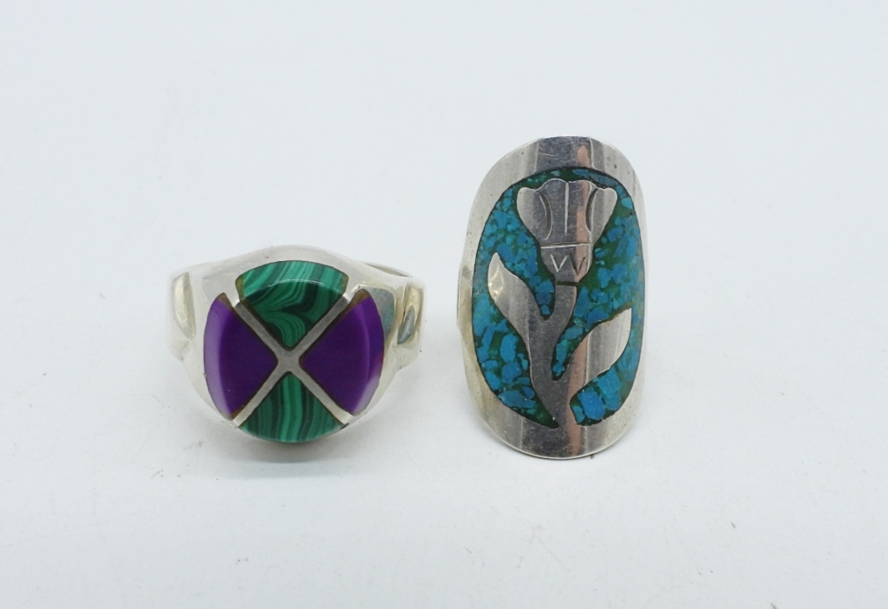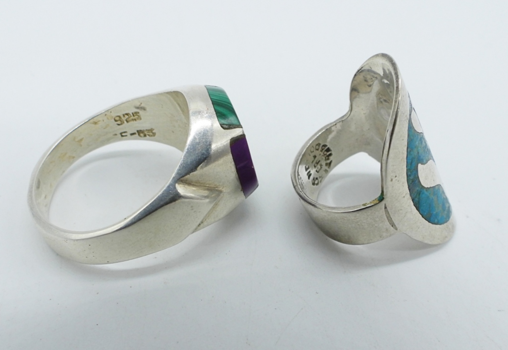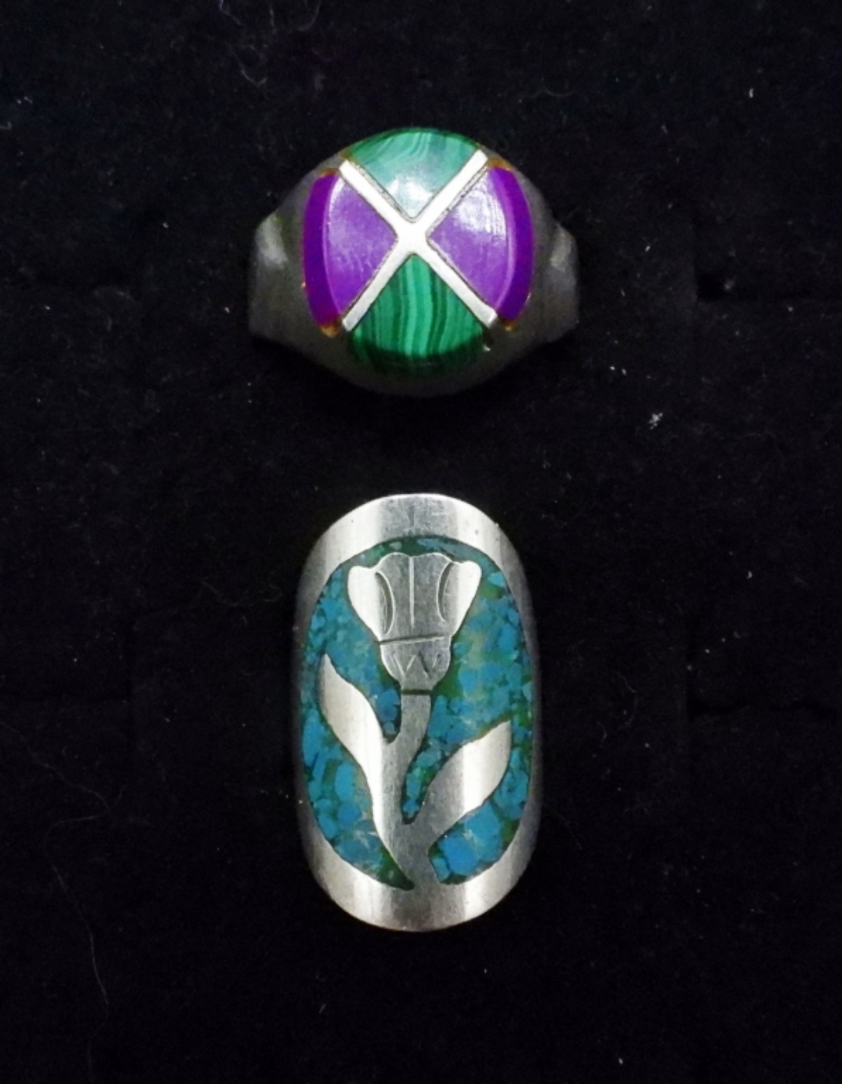 TWO STERLING RINGS, TURQUOISE IN LAY, MALACHITE & SUGILITE. MARKINGS ARE HARD TO READ. TC-85 / TAXCO MEXICO CAL?. SEE PHOTOS. (14 DWT)