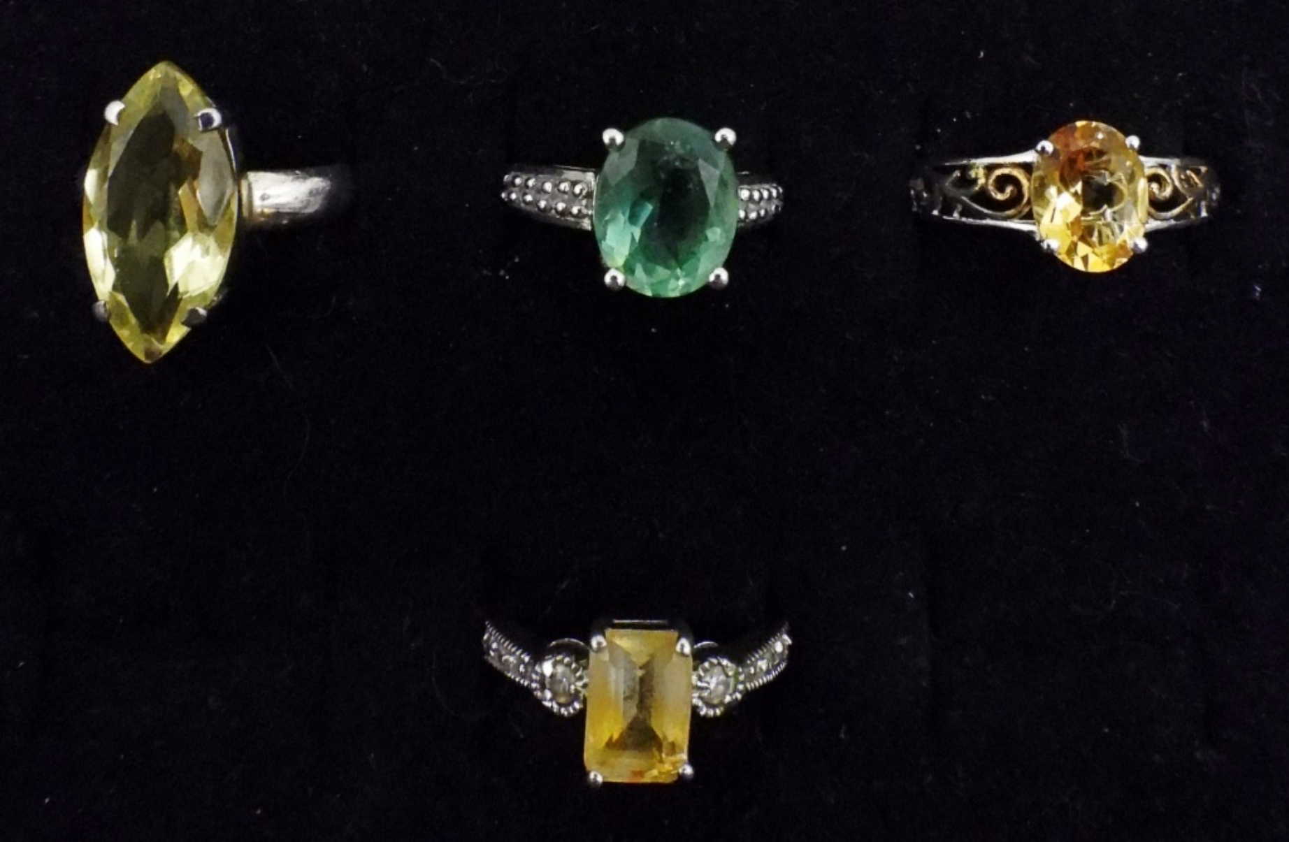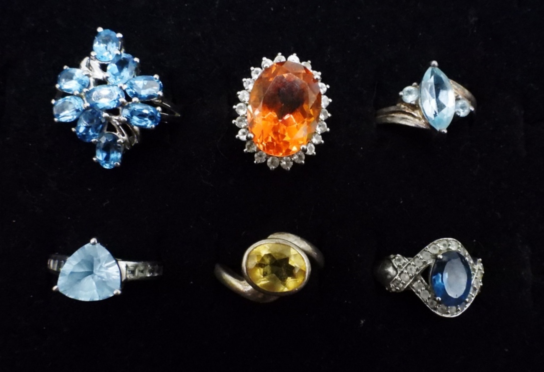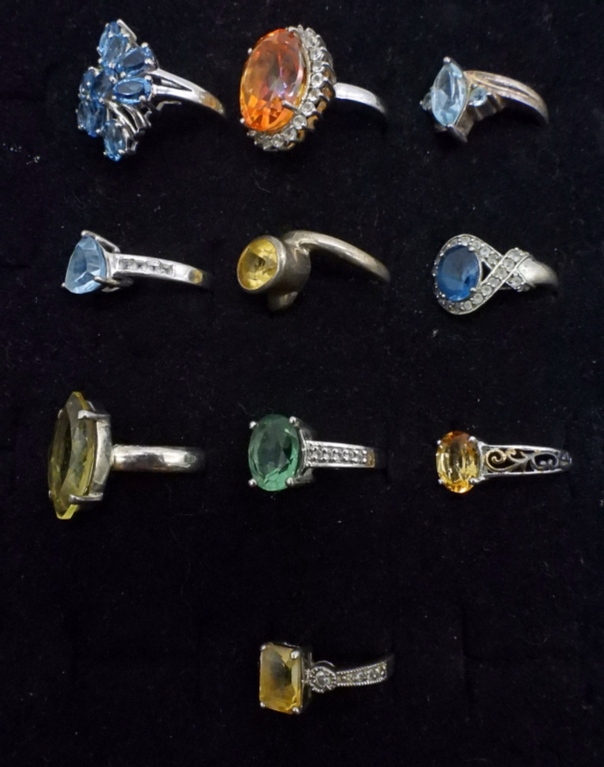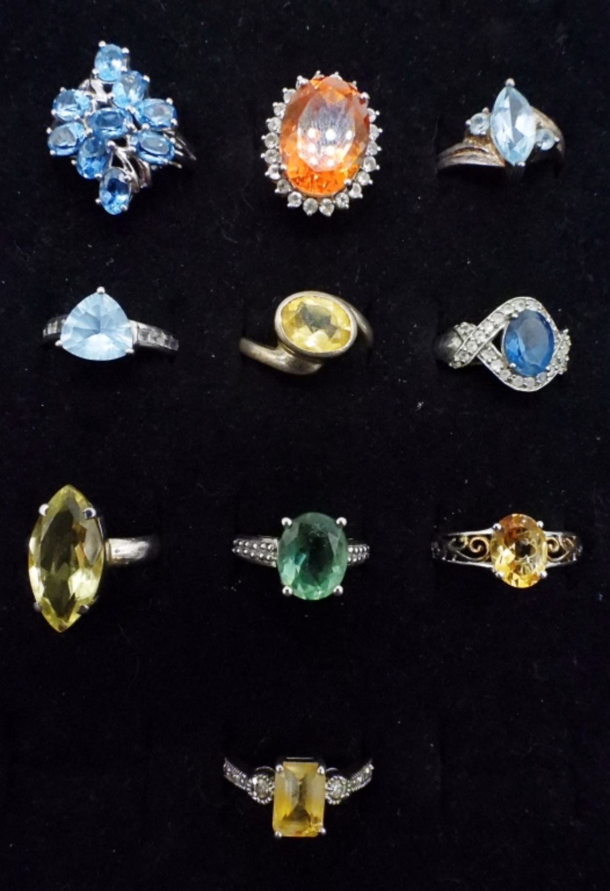TEN STERLING FASHION RINGS. BLUE TOPAZ, CITRINE & OTHER UNIDENTIFIED GEMSTONES. SIZES 6-9. (25 DWT)
