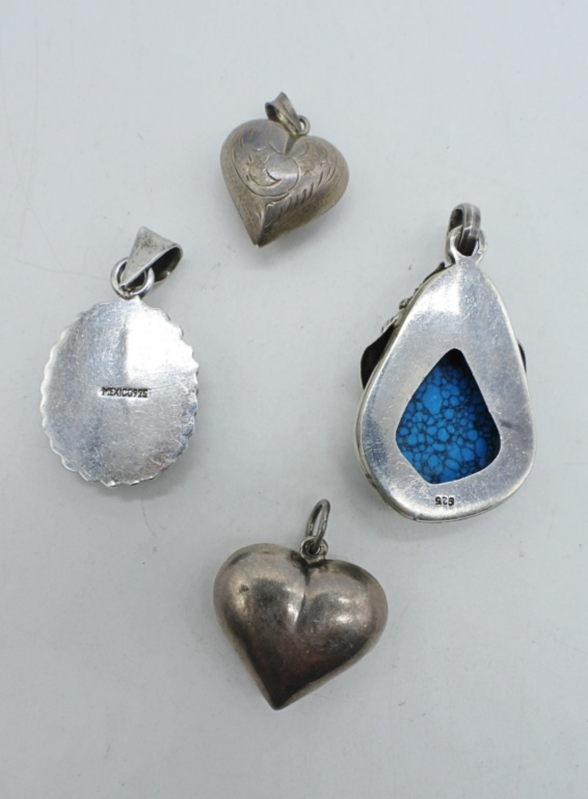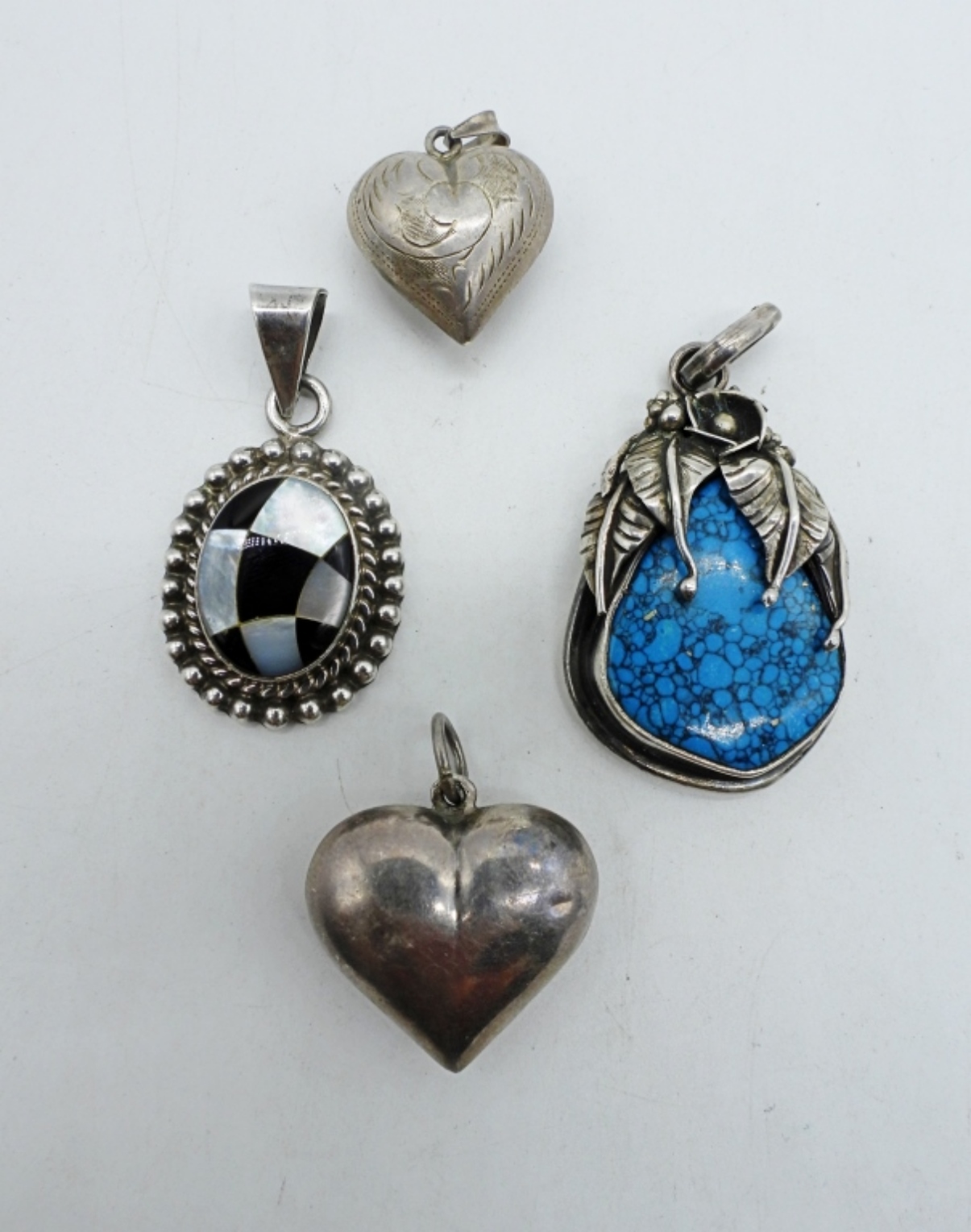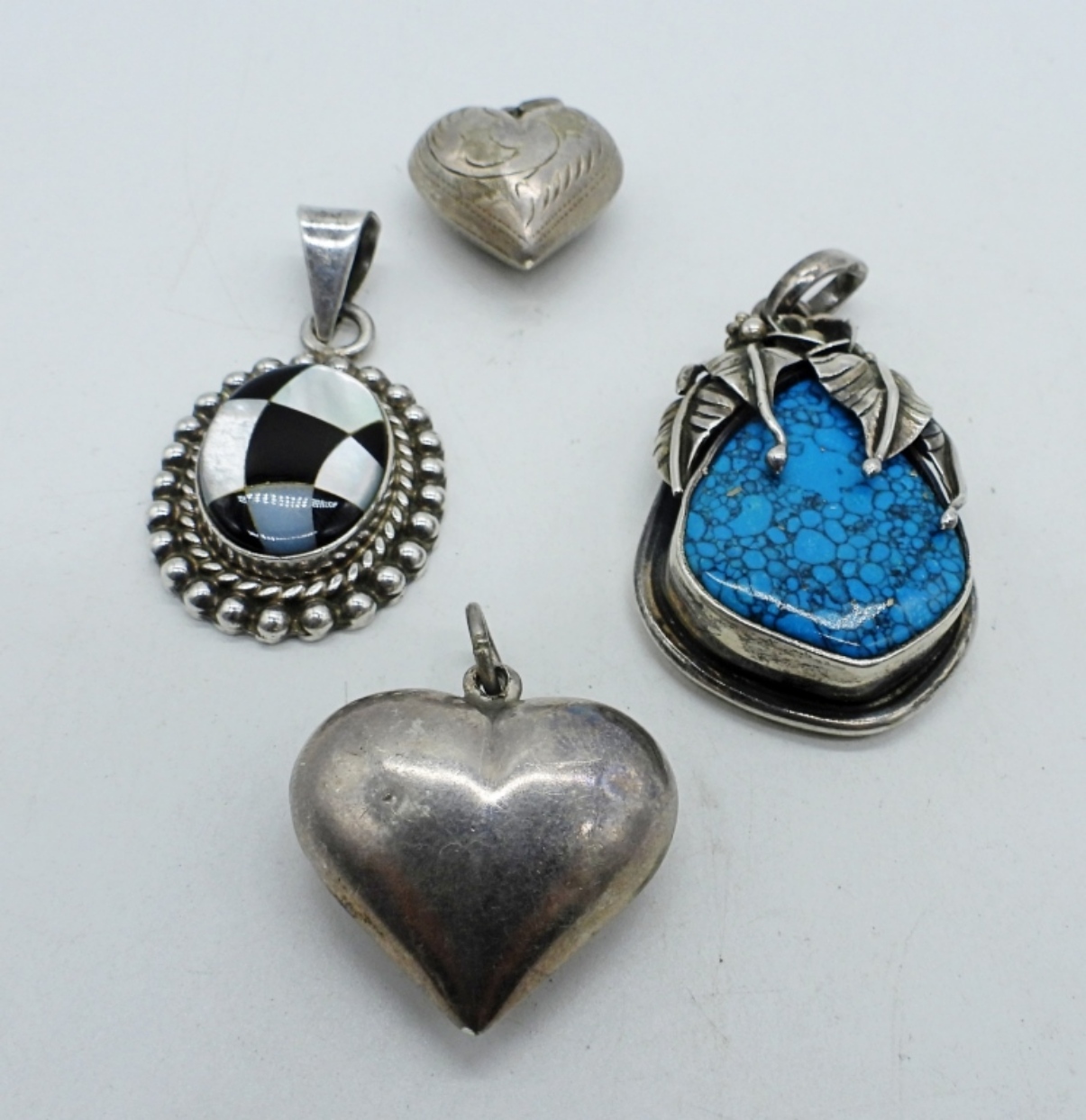 MEXICO MOTHER OF PEARL / BLACK ONYX CHECKERED STERLING PENDANT, 2″. LARGE STERLING TURQUOISE PENDANT, 2.5″. TWO VINTAGE STERLING HEART PENDANTS. (33 DWT)