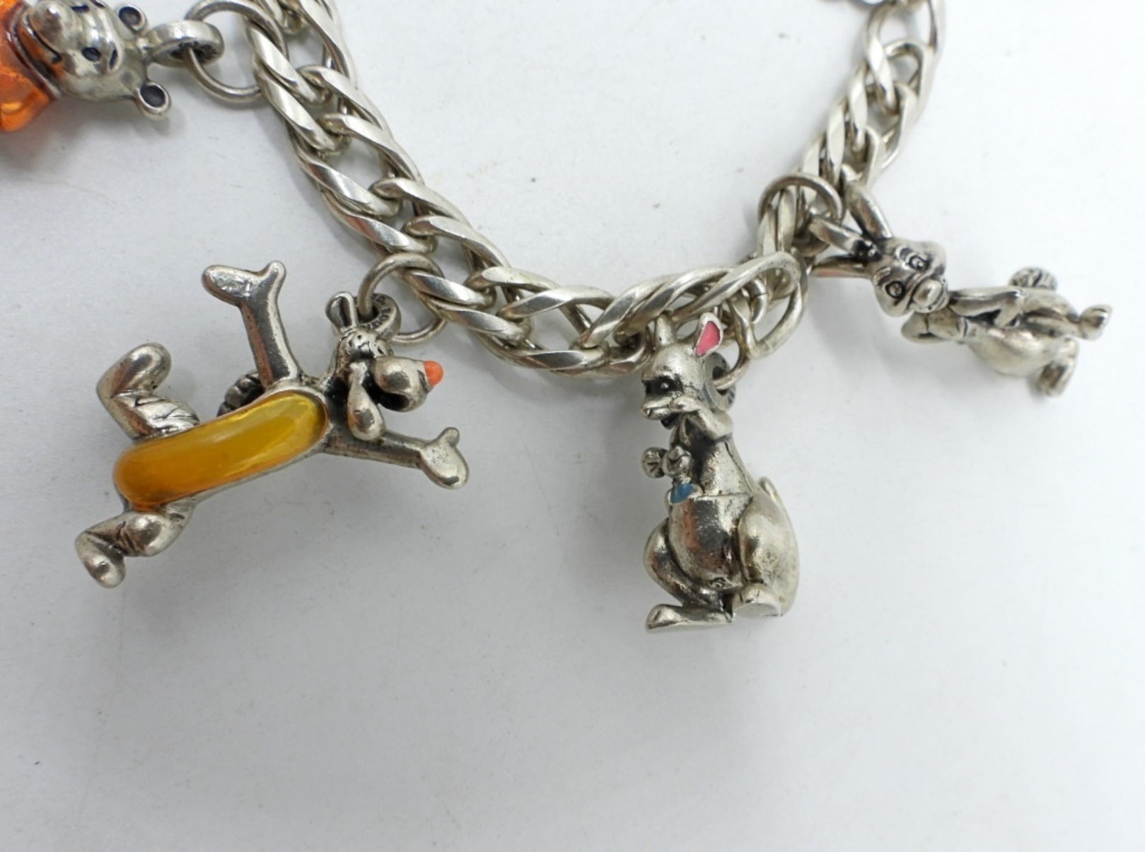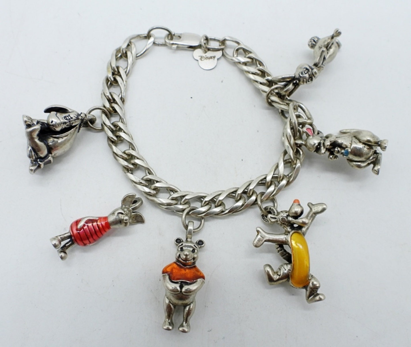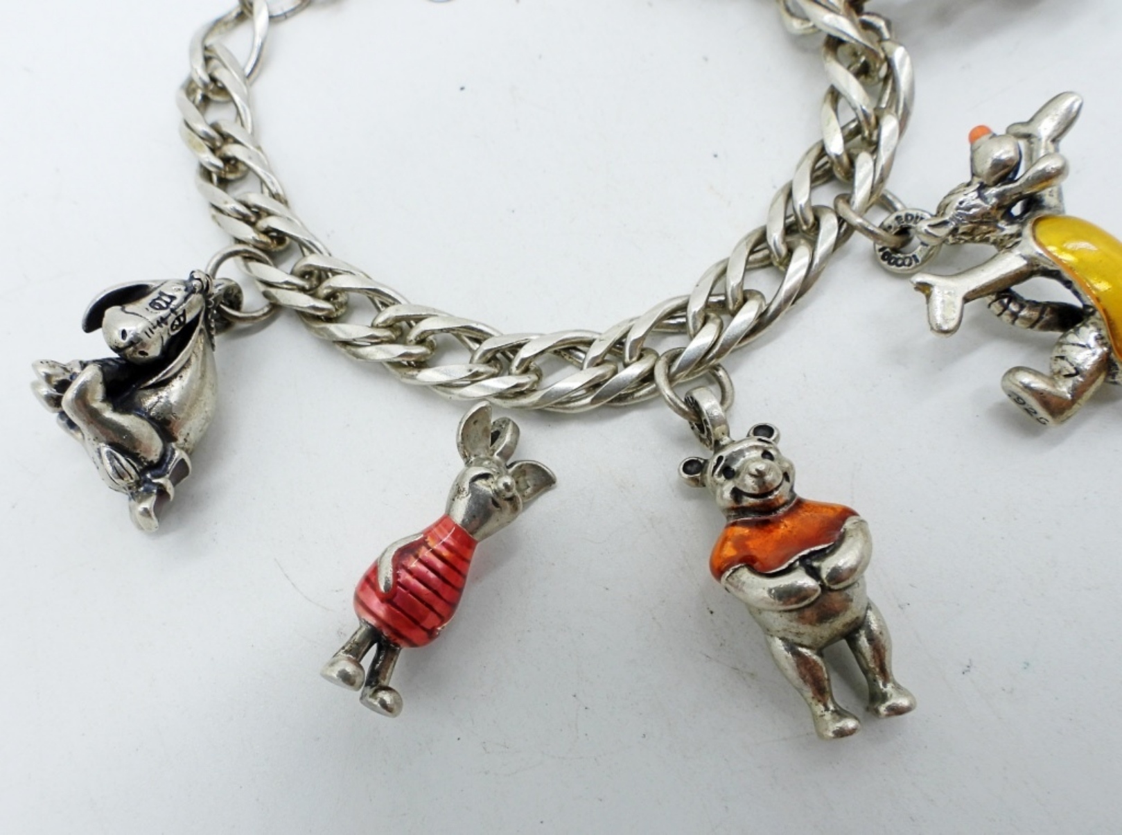 CHARM BRACELET, WINNIE THE POOH CHARACTERS IN STERLING & ENAMEL. PIGLET NEEDS TO BE REATTACHED. LIMITED EDITION. 7″, HEAVY. SEE PHOTOS!! (44 DWT)