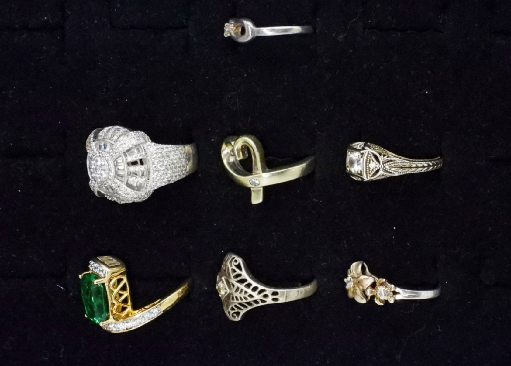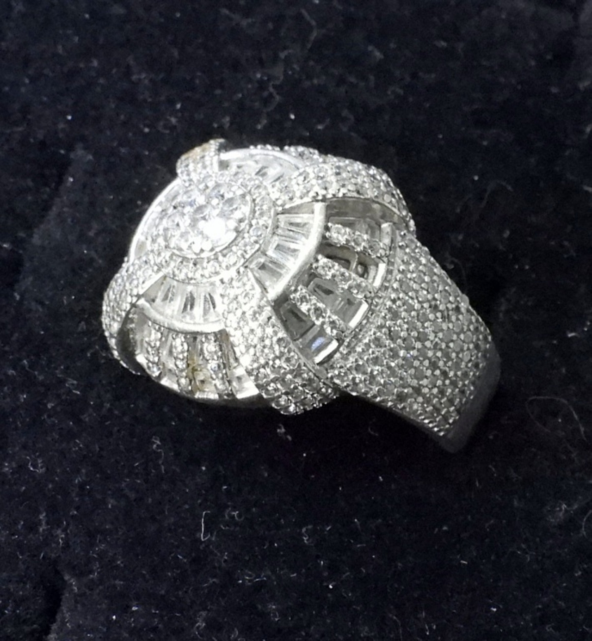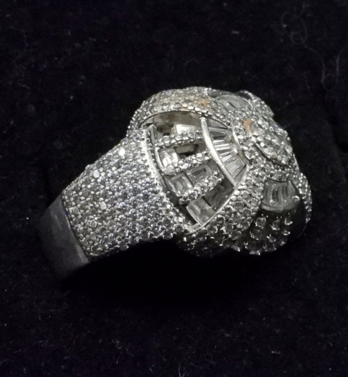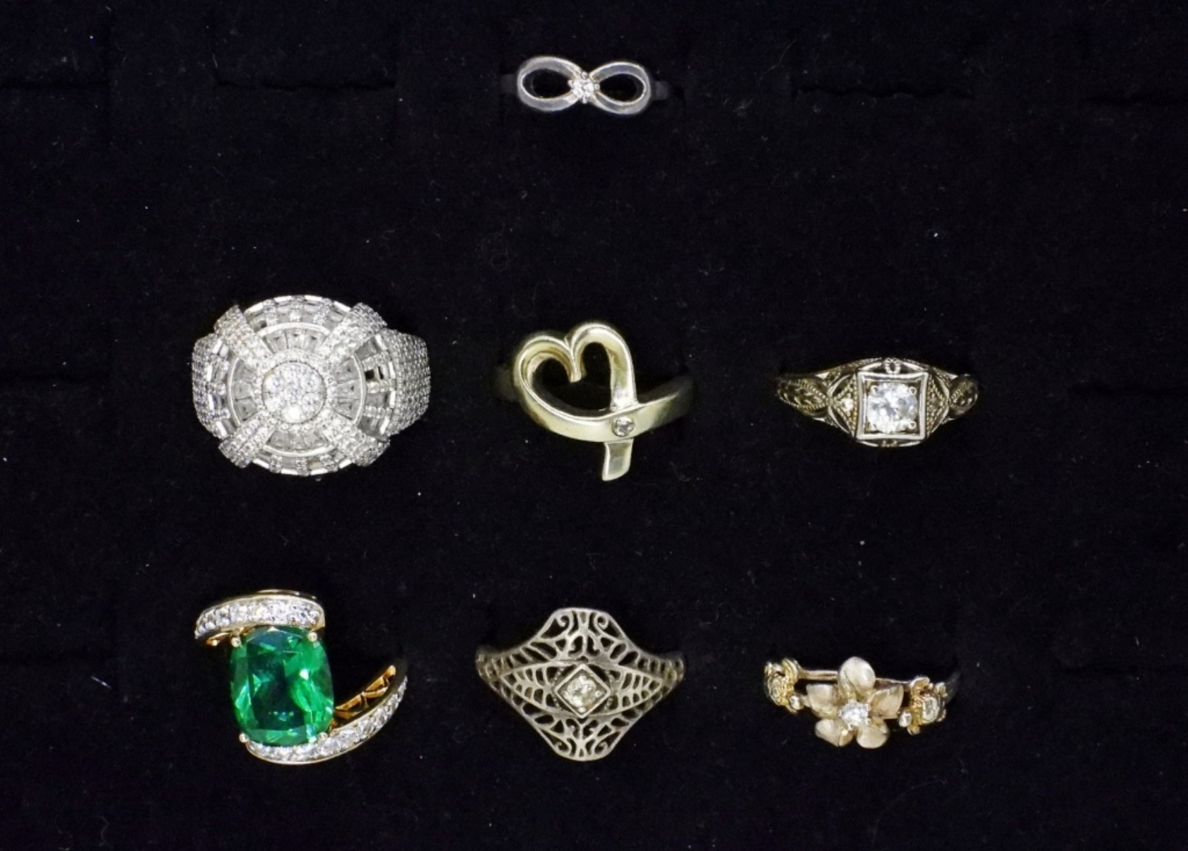 SEVEN BEAUTIFUL STERLING FASHION RINGS. SIMULATED DIAMONDS & SIMULATED EMERALD RINGS. LARGE DIAMOND LIKE STATEMENT RING IS MISSING GEMSTONES. SEE PHOTOS SIZES 6-9. (19.7 DWT)