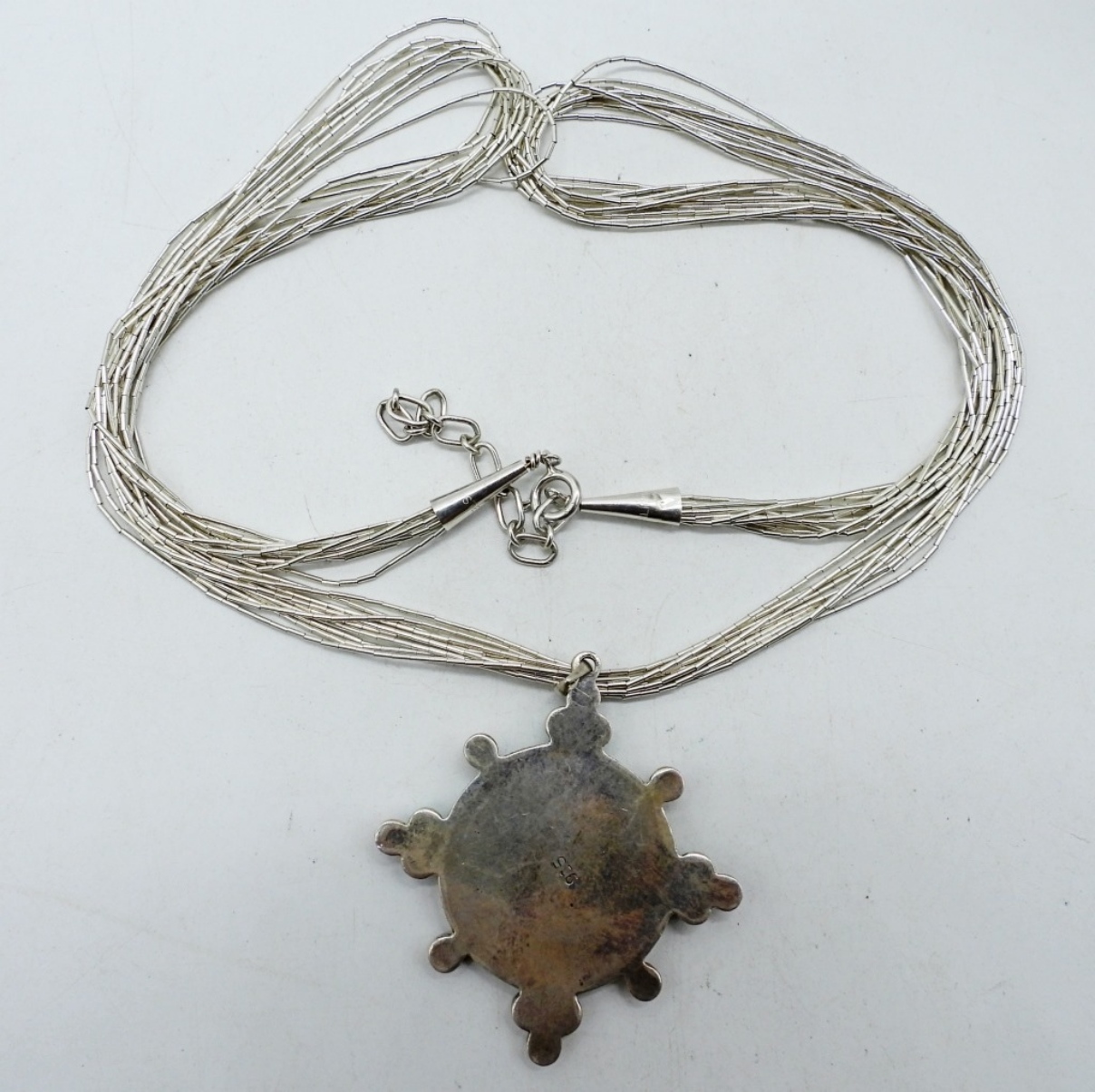 26″ LIQUID STERLING NECKLACE WITH A TURQUOISE & MOTHER OF PEARL INLAY PENDANT. (14.4 DWT)