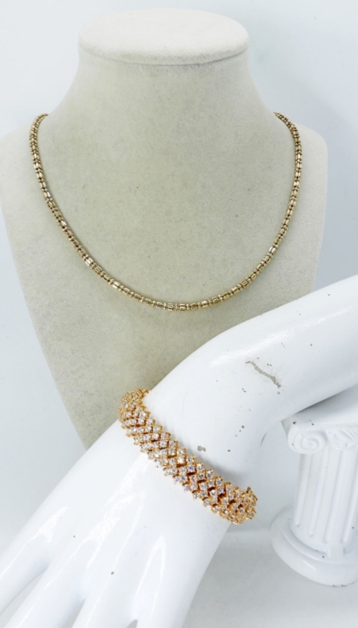 GORGEOUS STERLING GOLD TONE .5″ WIDE TENNIS BRACELET, 7″ LONG. VERY NICE STERLING GOLD TONE 24″ NECKLACE. (32.7 DWT)