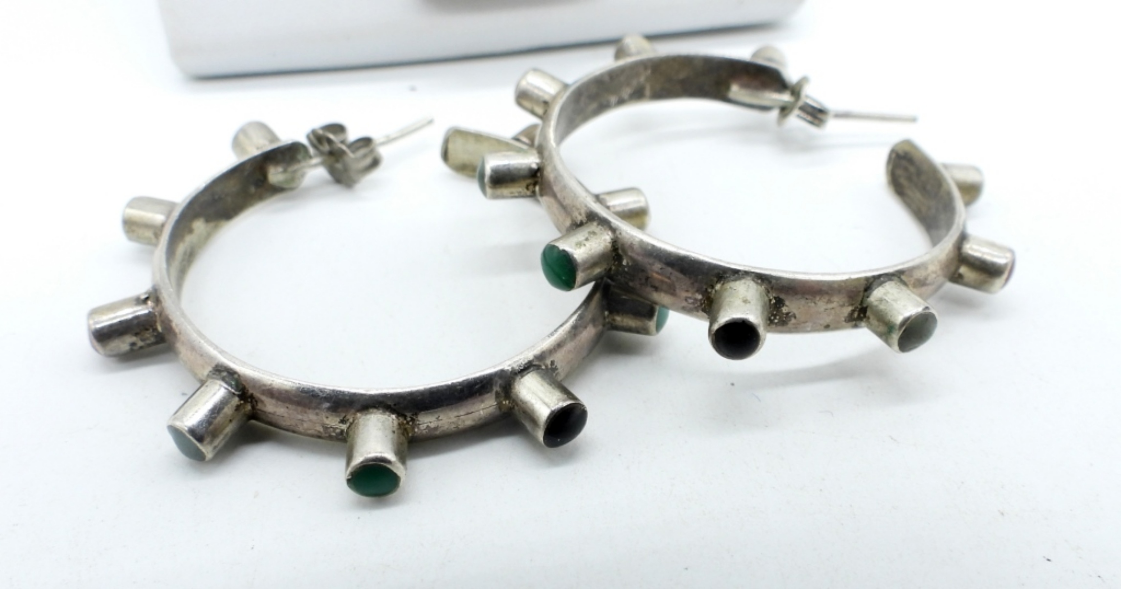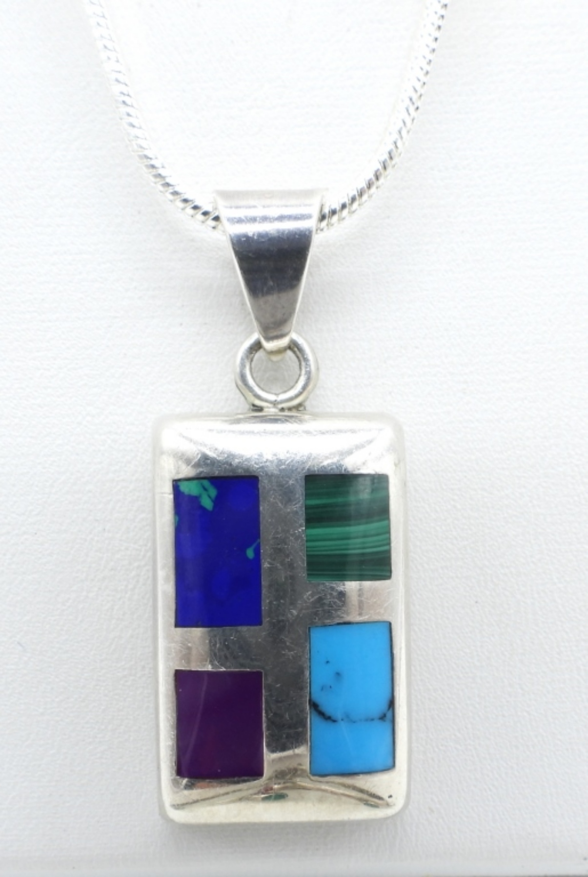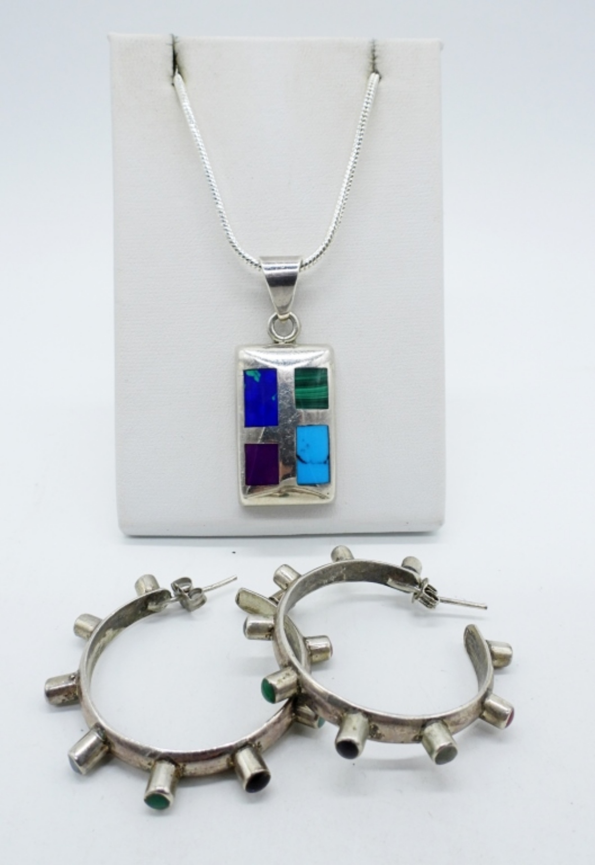 VINTAGE INLAID TURQUOISE, MALACHITE & MORE. EARRINGS ARE PIERCED STERLING WITH GEMSTONE INLAYS. 18″ CHAIN. (20 DWT)