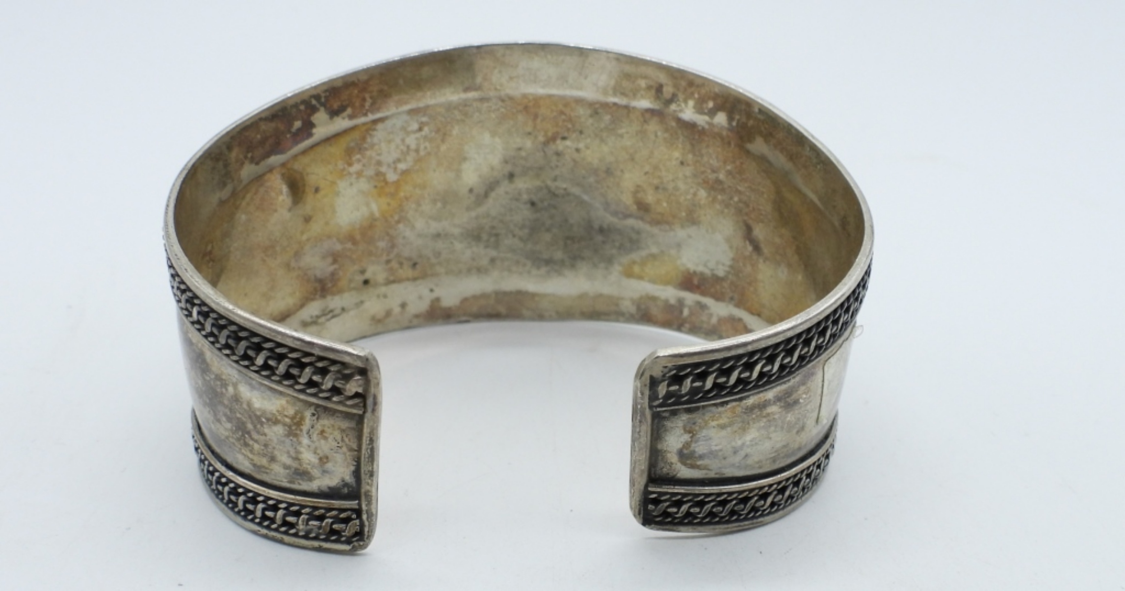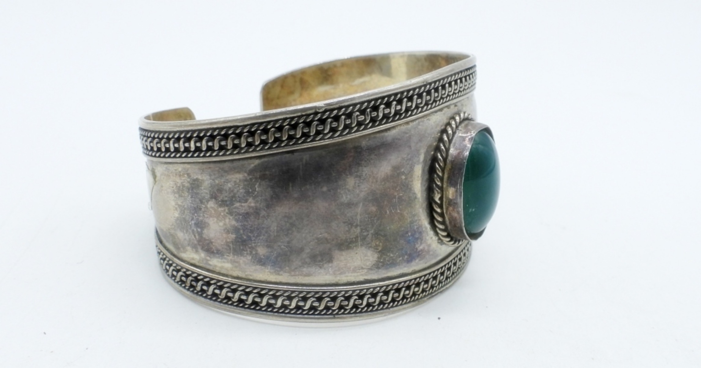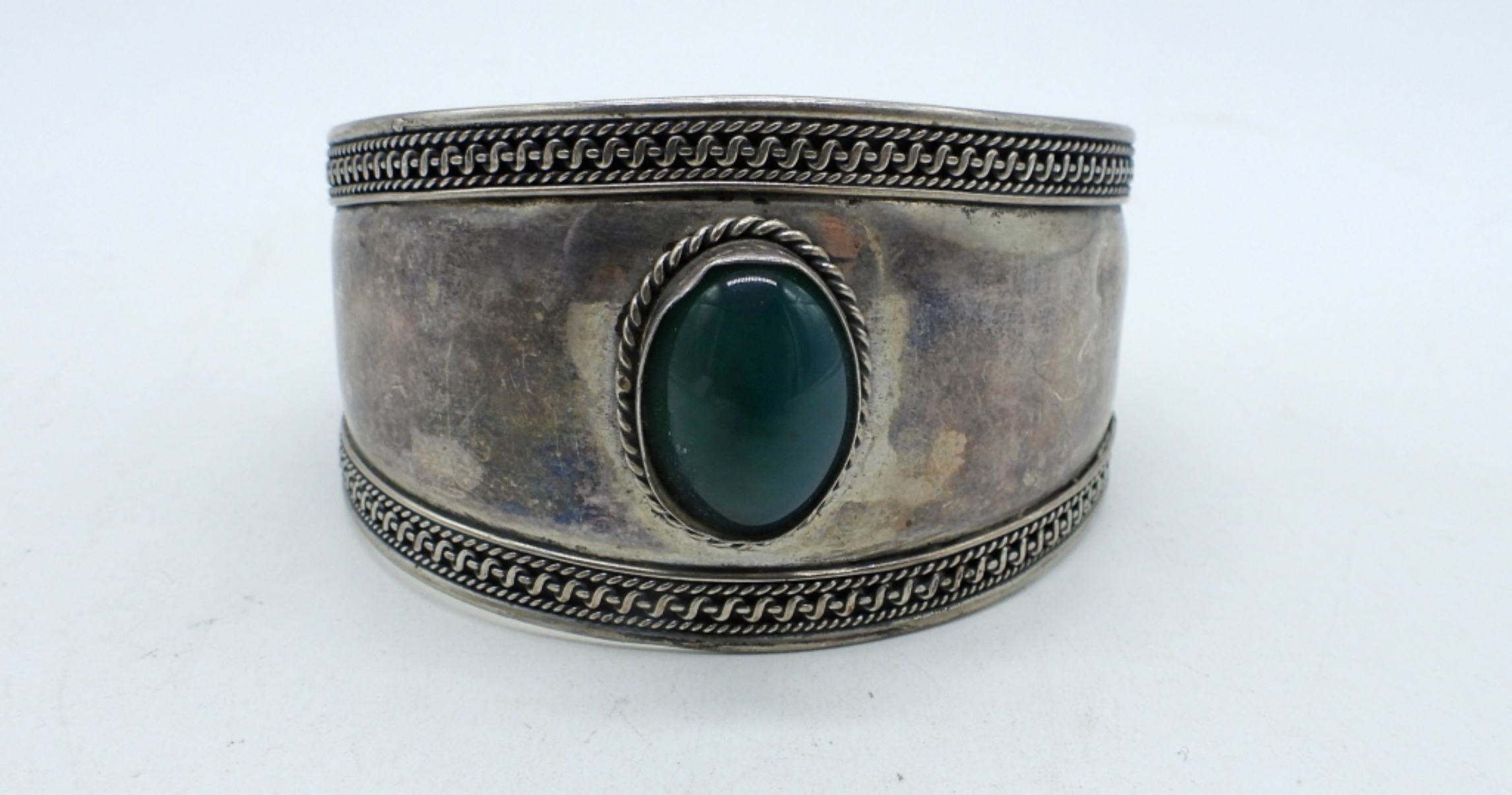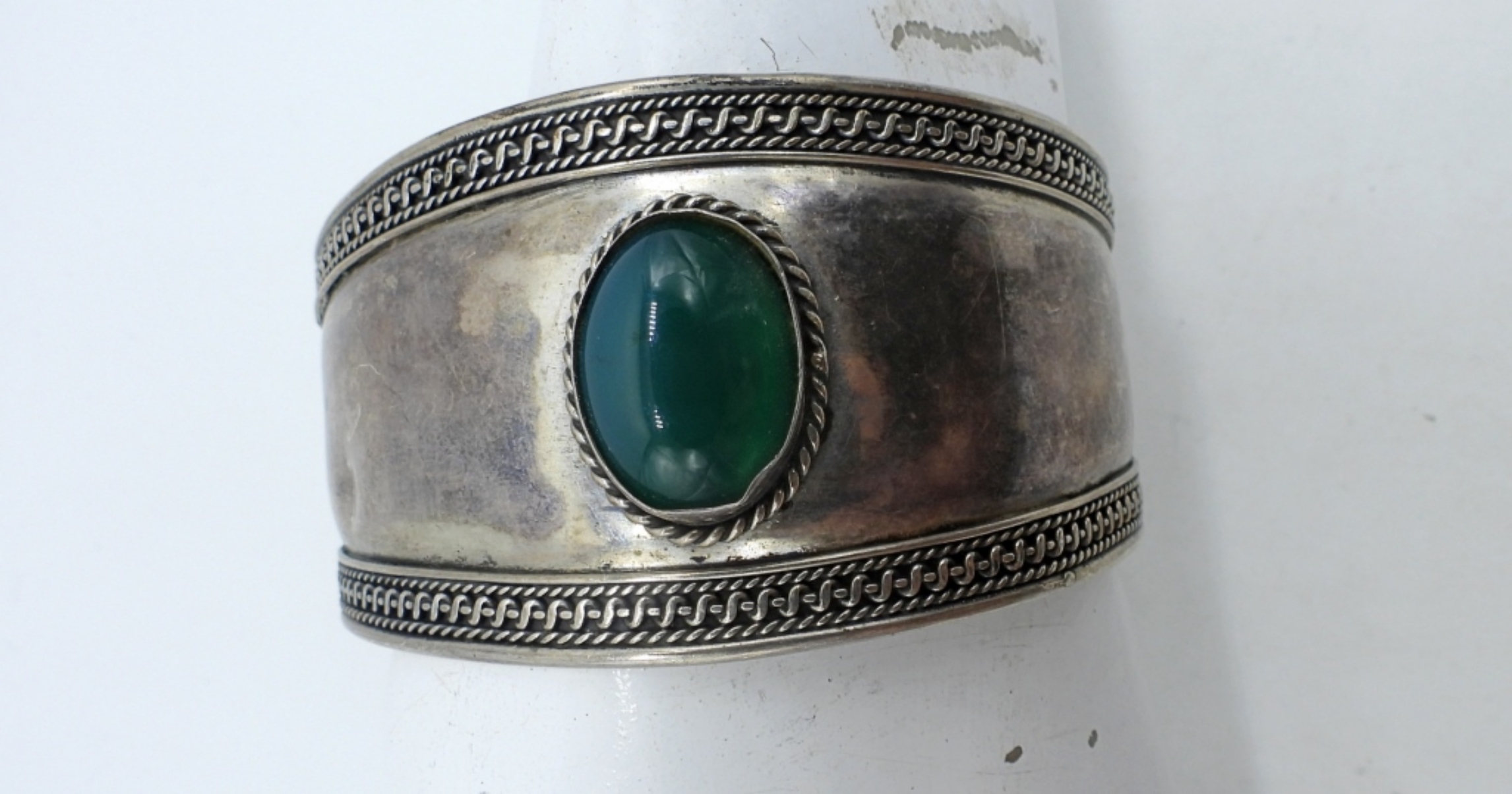 BOHO STYLE STERLING CUFF BRACELET, WITH GREEN FASHION GEMSTONE. (15 DWT)