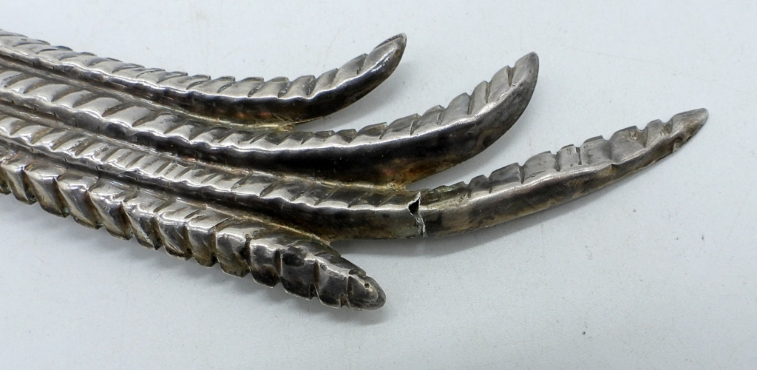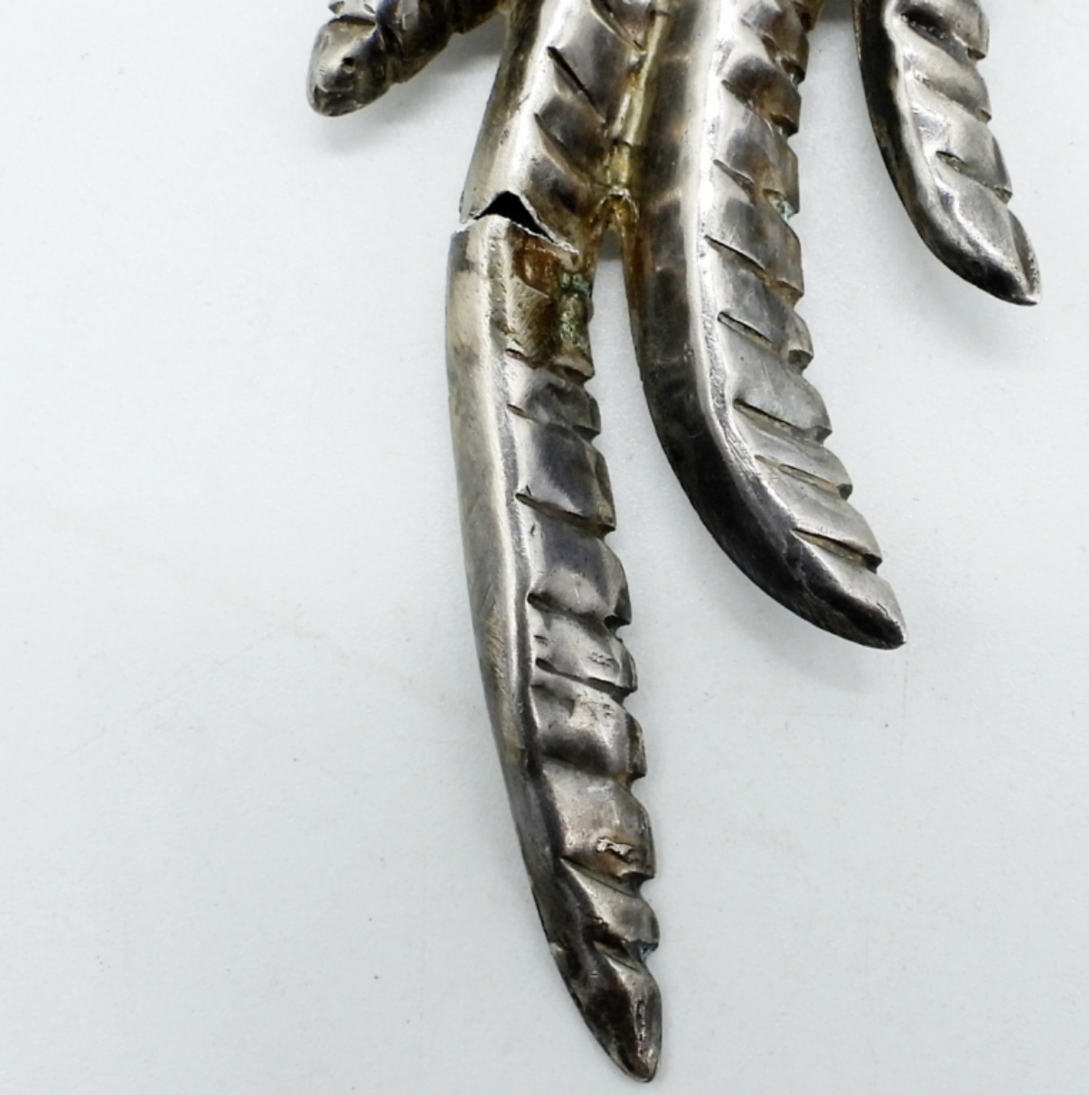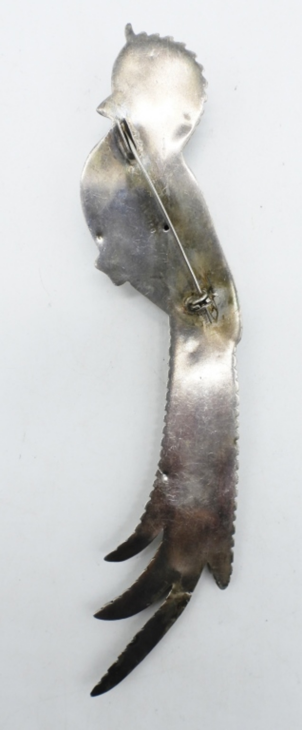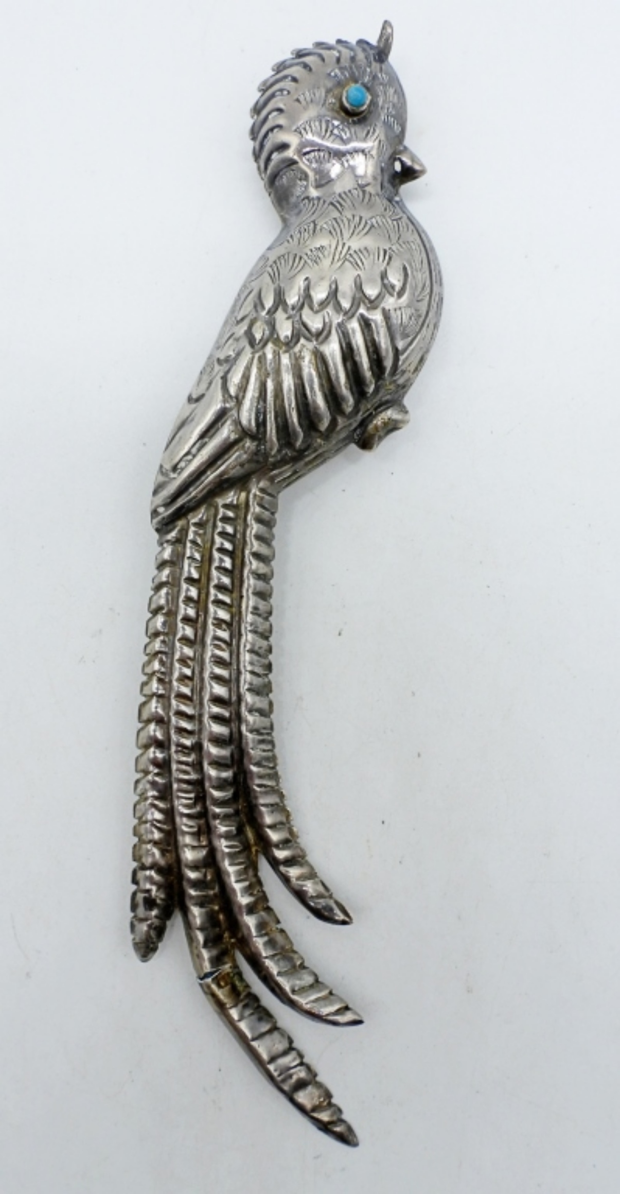 VINTAGE MEXICO STERLING QUETZAL BROOCH. TAIL HAS A CRACK. TURQUOISE GEMSTONE EYE. 6.5″ LONG. (15 DWT)