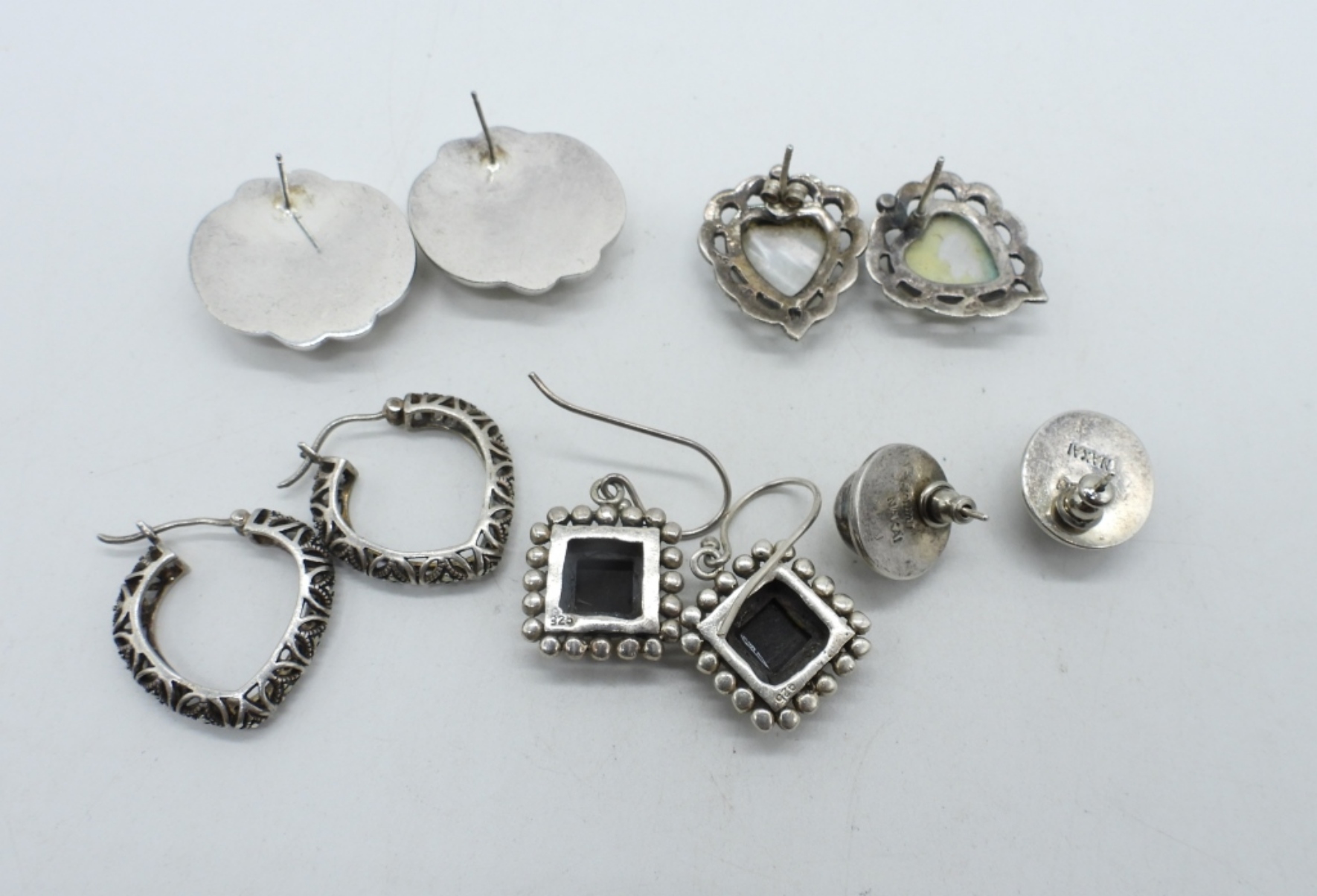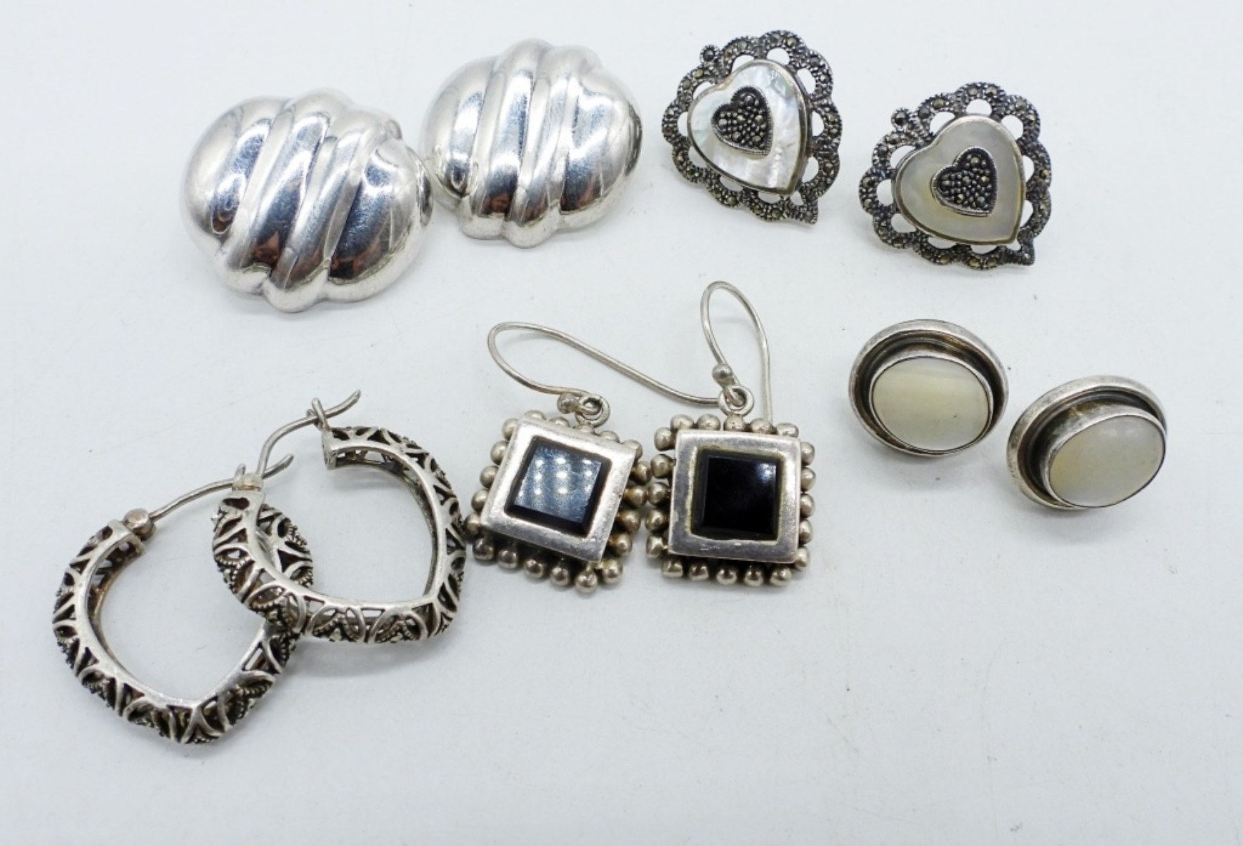 5 PAIR OF VINTAGE STERLING EARRINGS. MOTHER OF PEARL, BLACK ONYX, MOONSTONE. ALL PIERCED. (30 DWT)