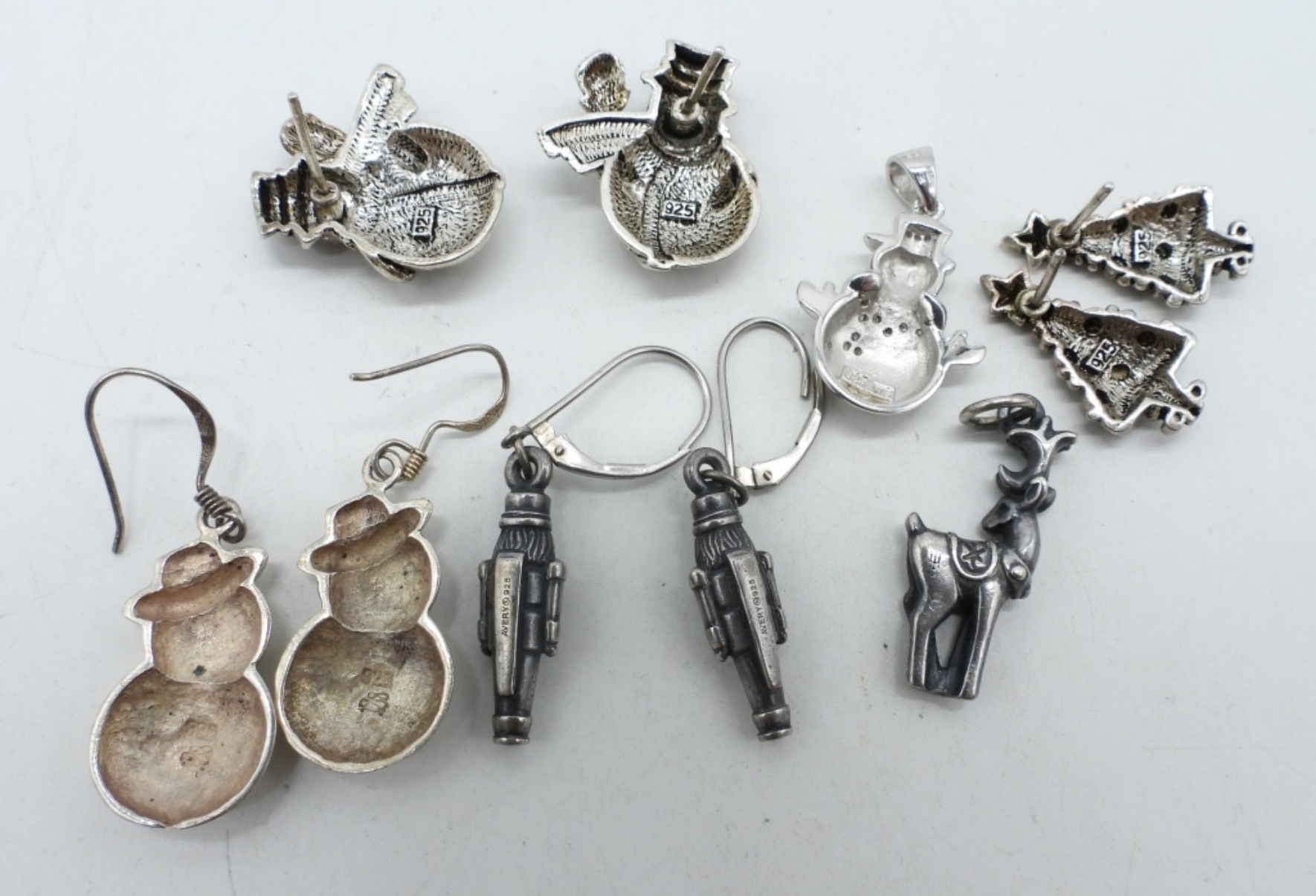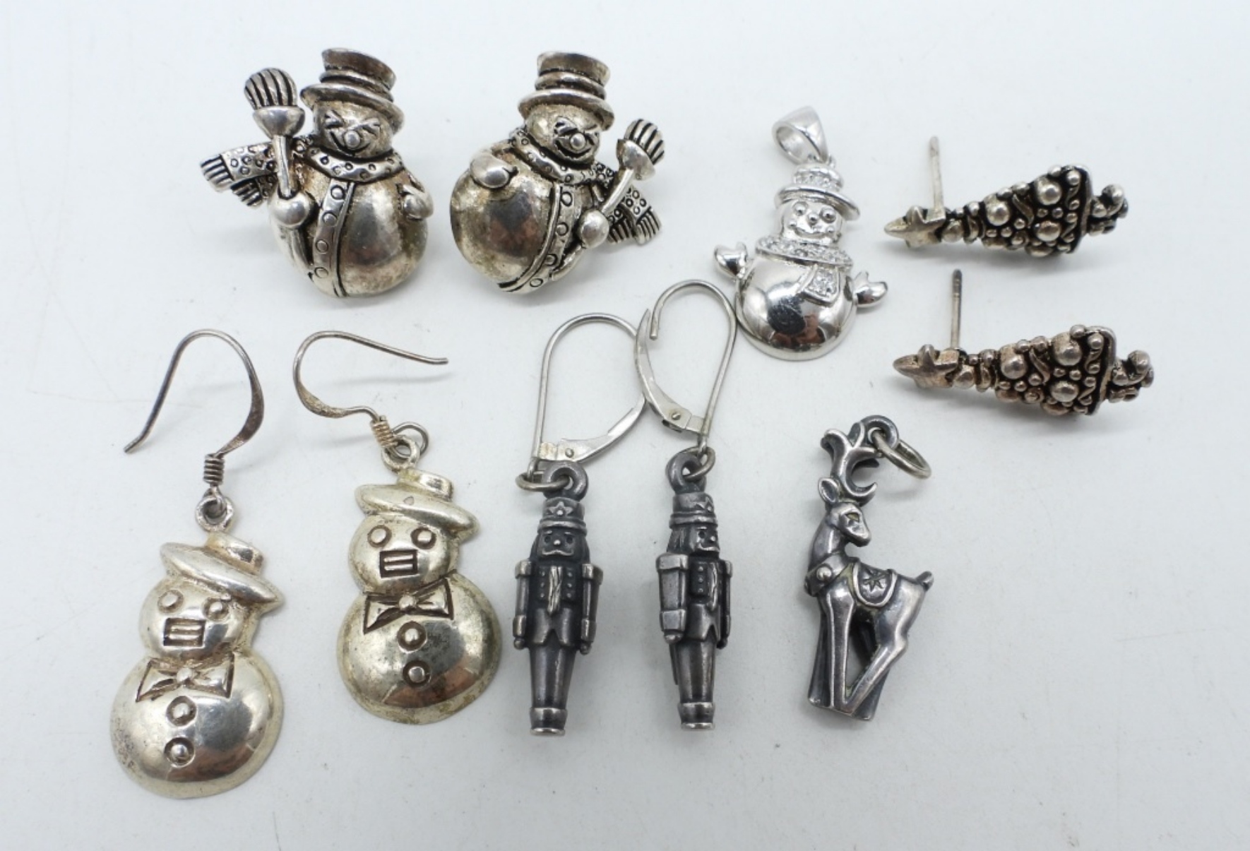 FOUR PAIR OF STERLING VINTAGE CHRISTMAS EARRINGS. NOT ALL HAVE BACKINGS. TWO STERLING PENDANTS. (20.4 DWT)