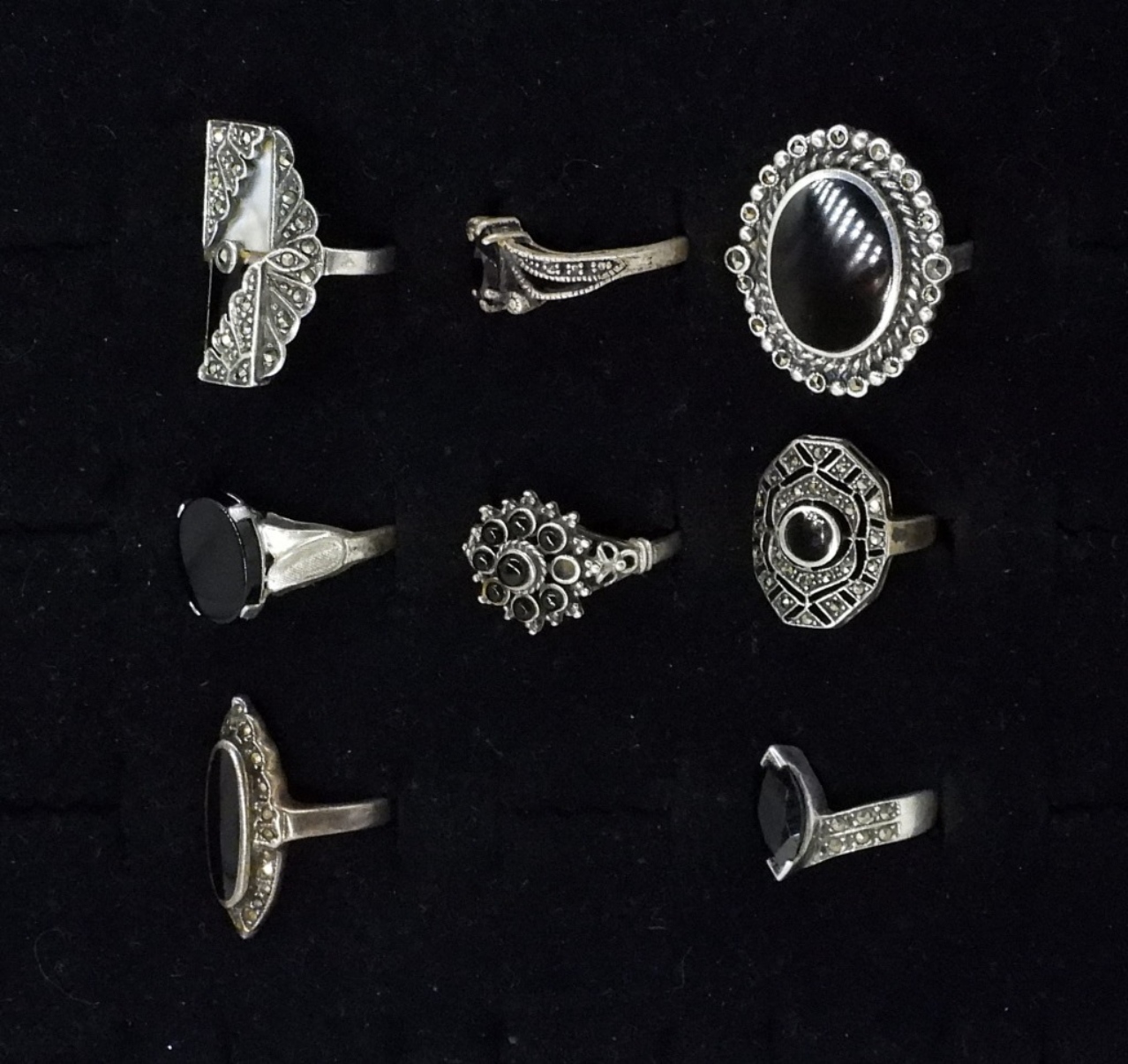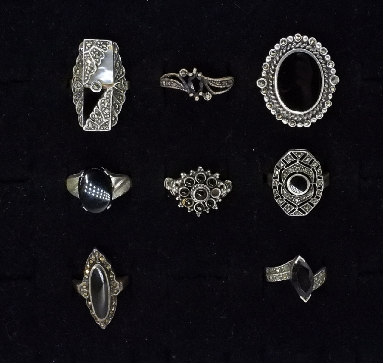 EIGHT STERLING FASHION RINGS. MARCASITE, ONYX, MOTHER OF PEARL. SIZES 5-8.5 (23.6 DWT)