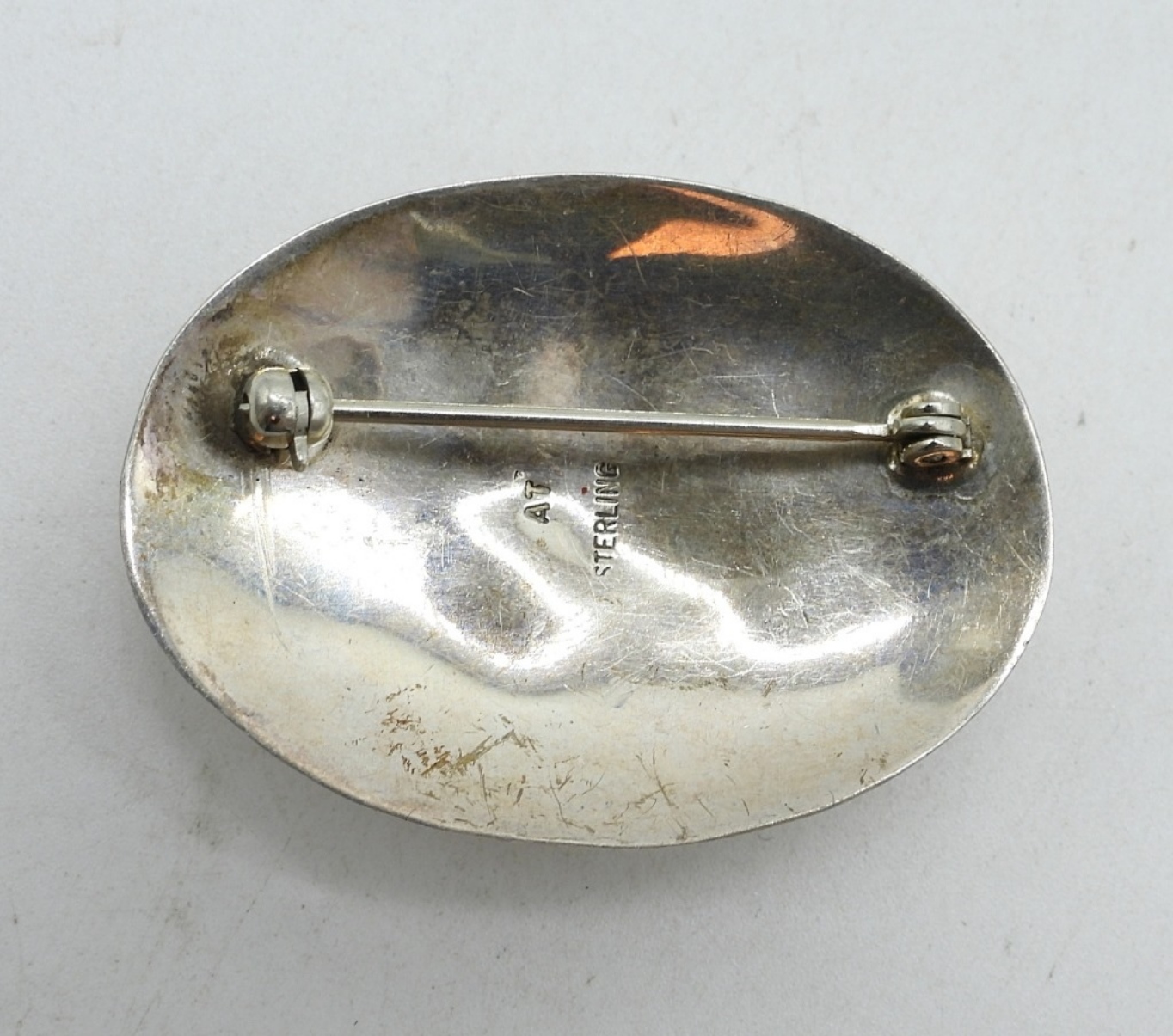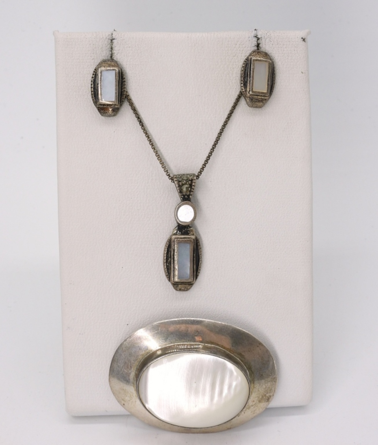 VINTAGE STERLING, MOTHER OF PEARL PIN 1″x 2″, PIERCED EARRINGS AND NECKLACE 18″. (10 DWT)