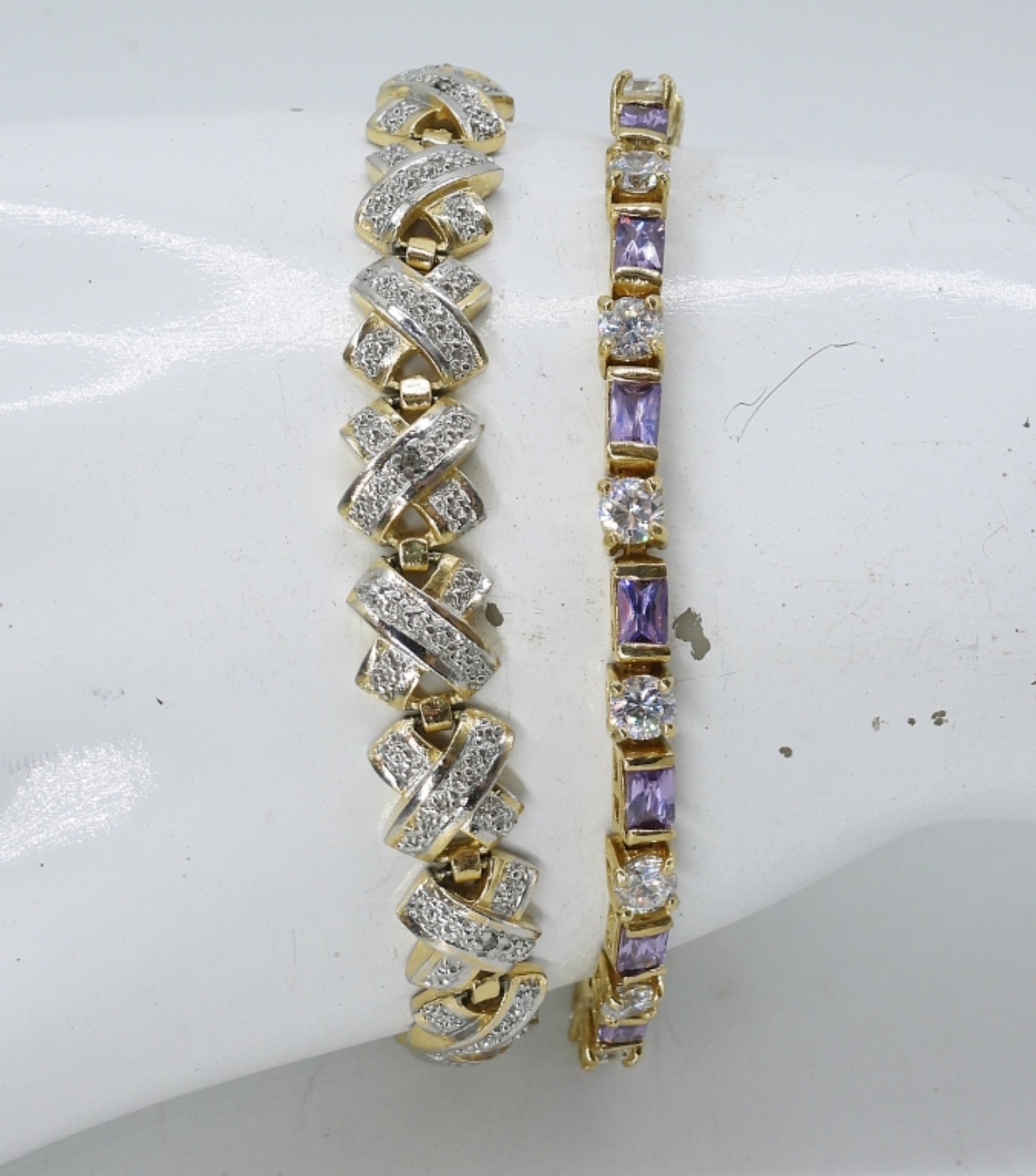 TWO STERLING GOLD TONE FASHION GEMSTONE BRACELETS. CLEAR GEMSTONES & AMETHYST. 7″. (18 DWT)