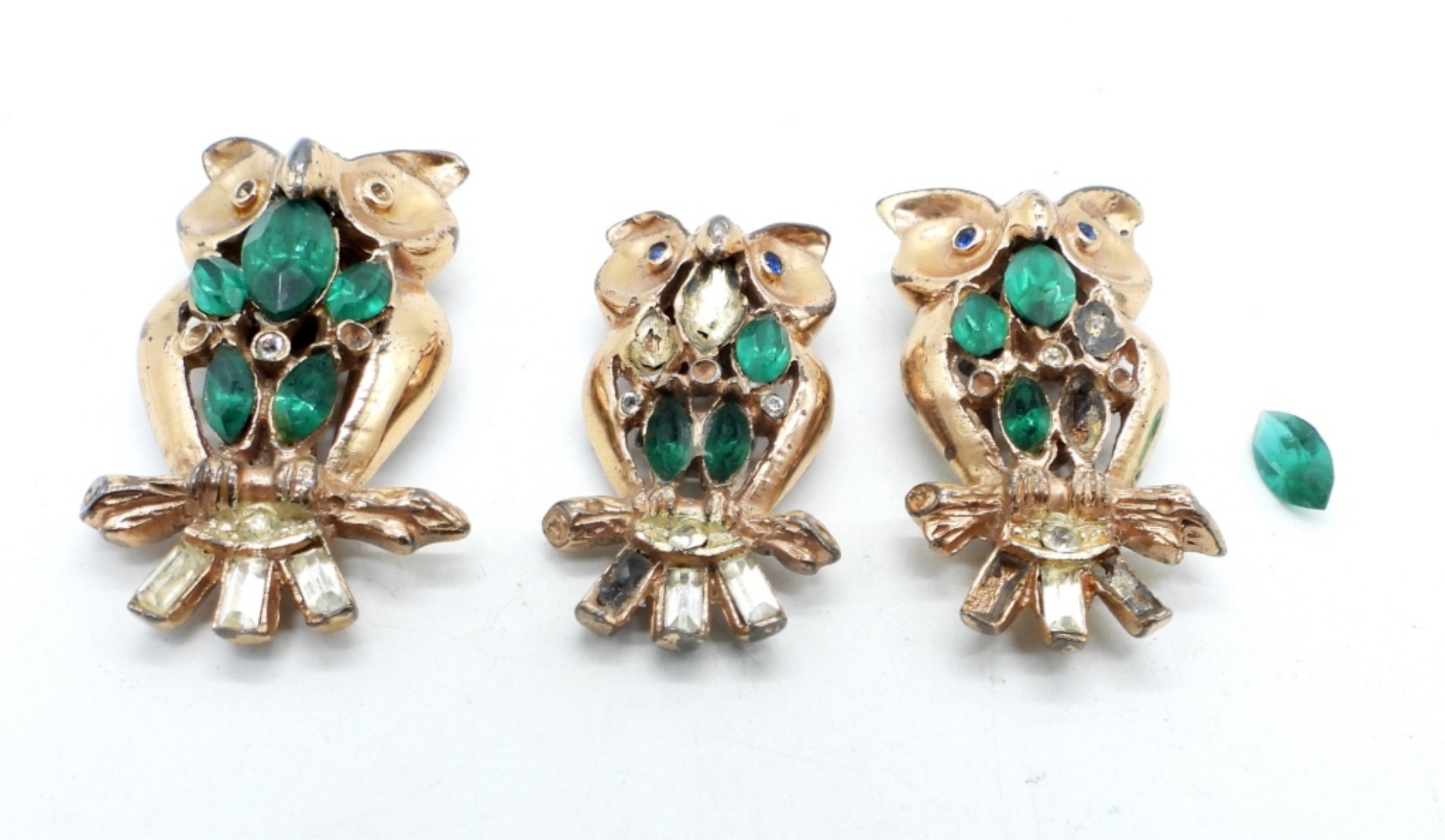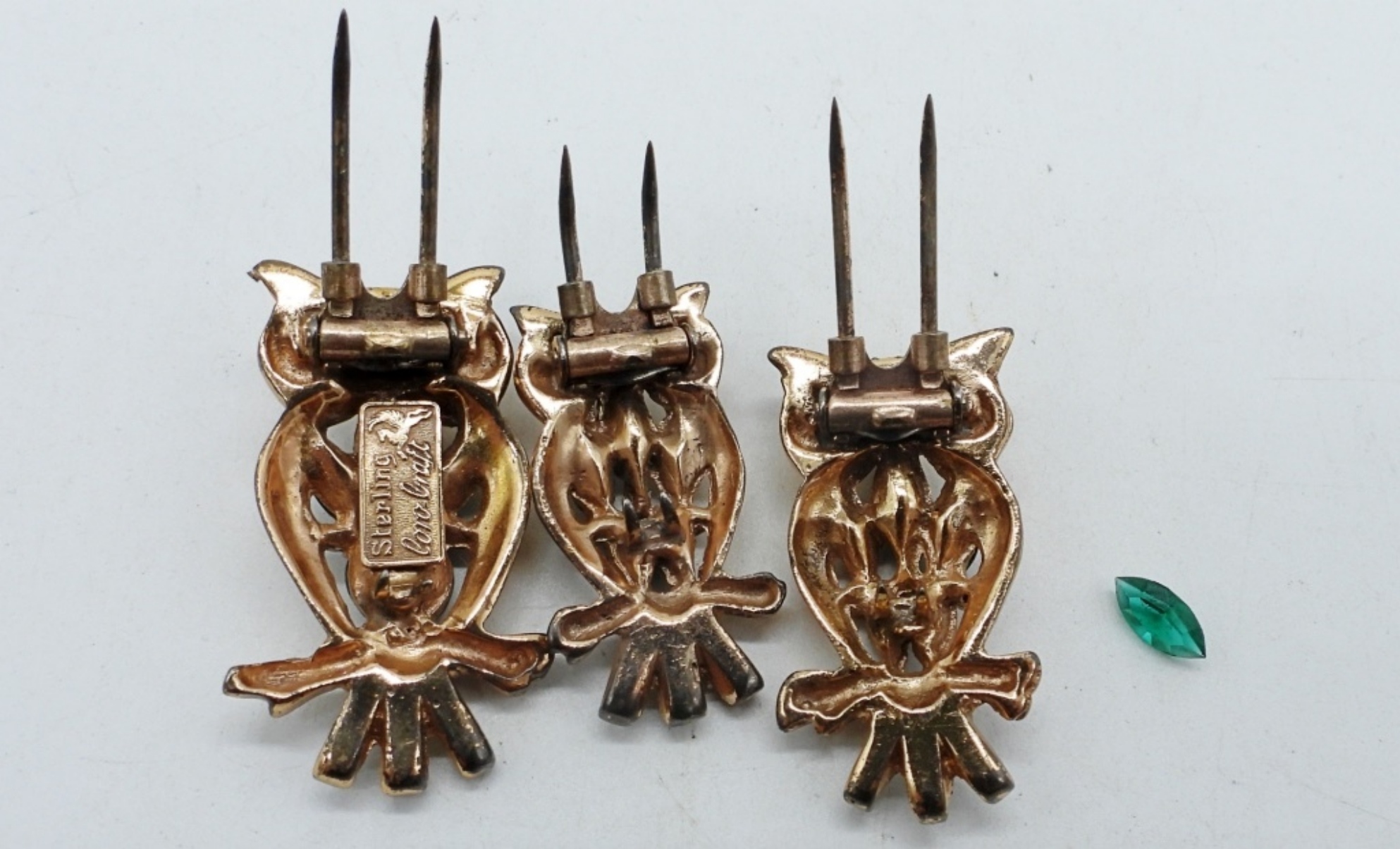 3 VINTAGE STERLING GOLD TONE CORO OWL CLIPS. FOUR GREEN GEMSTONES MISSING, ONE IS LOOSE IN THE BAG. FOUR CLEAR GEMSTONES MISSING. 1″ – 1.5″. (17.5 DWT)