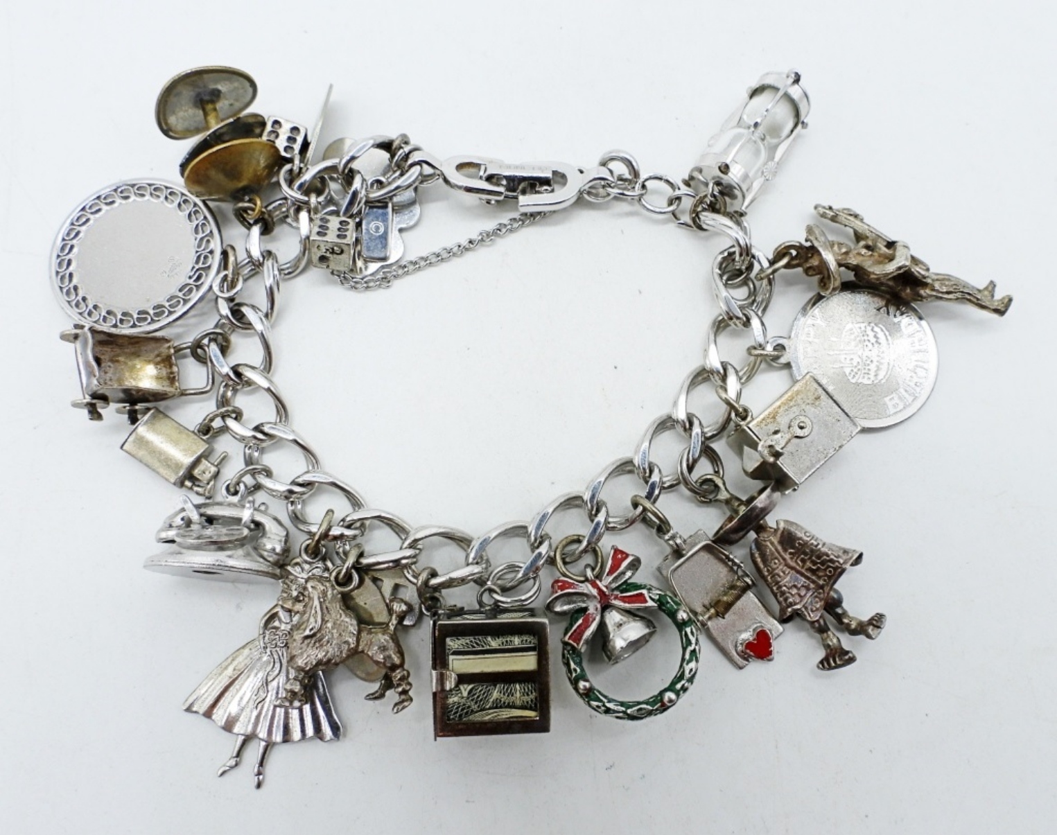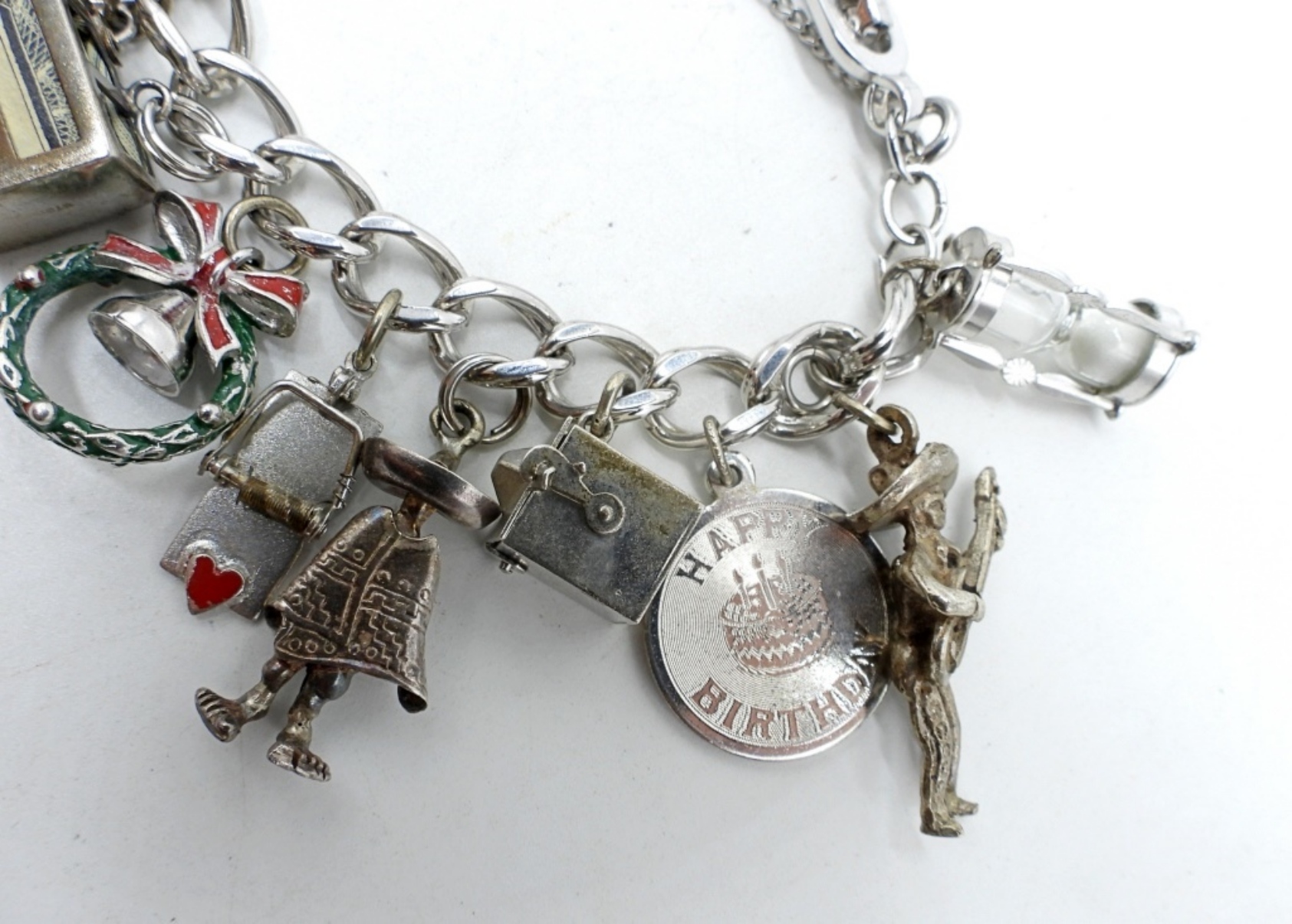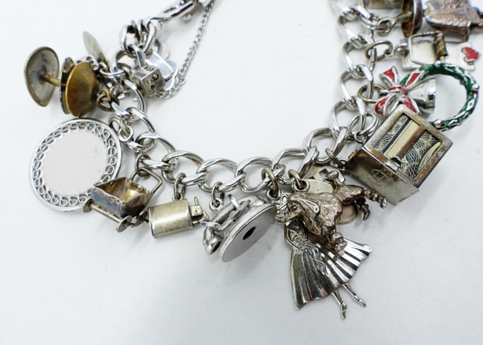 VINTAGE STERLING CHARM BRACELET WITH 18 CHARMS (SOME MAY NOT BE STERLING AS THIS IS A VINTAGE ITEM). 8″. (37 DWT)