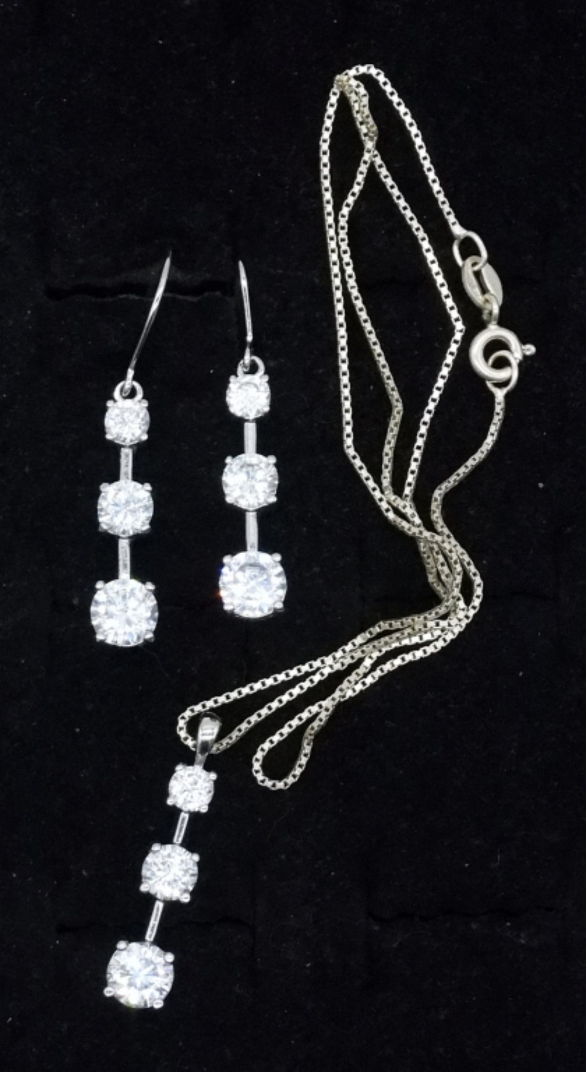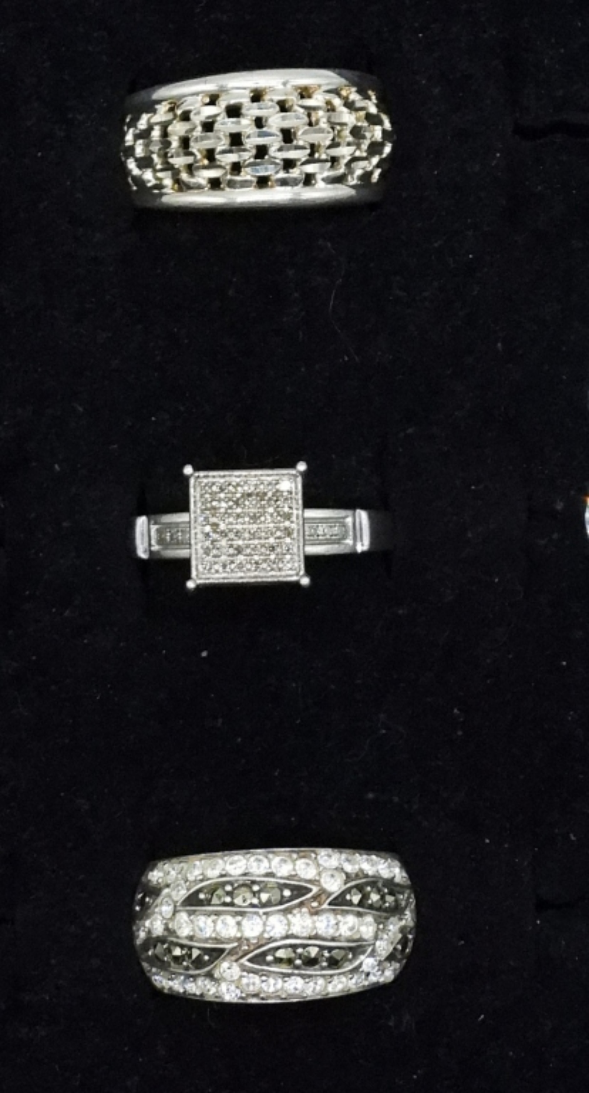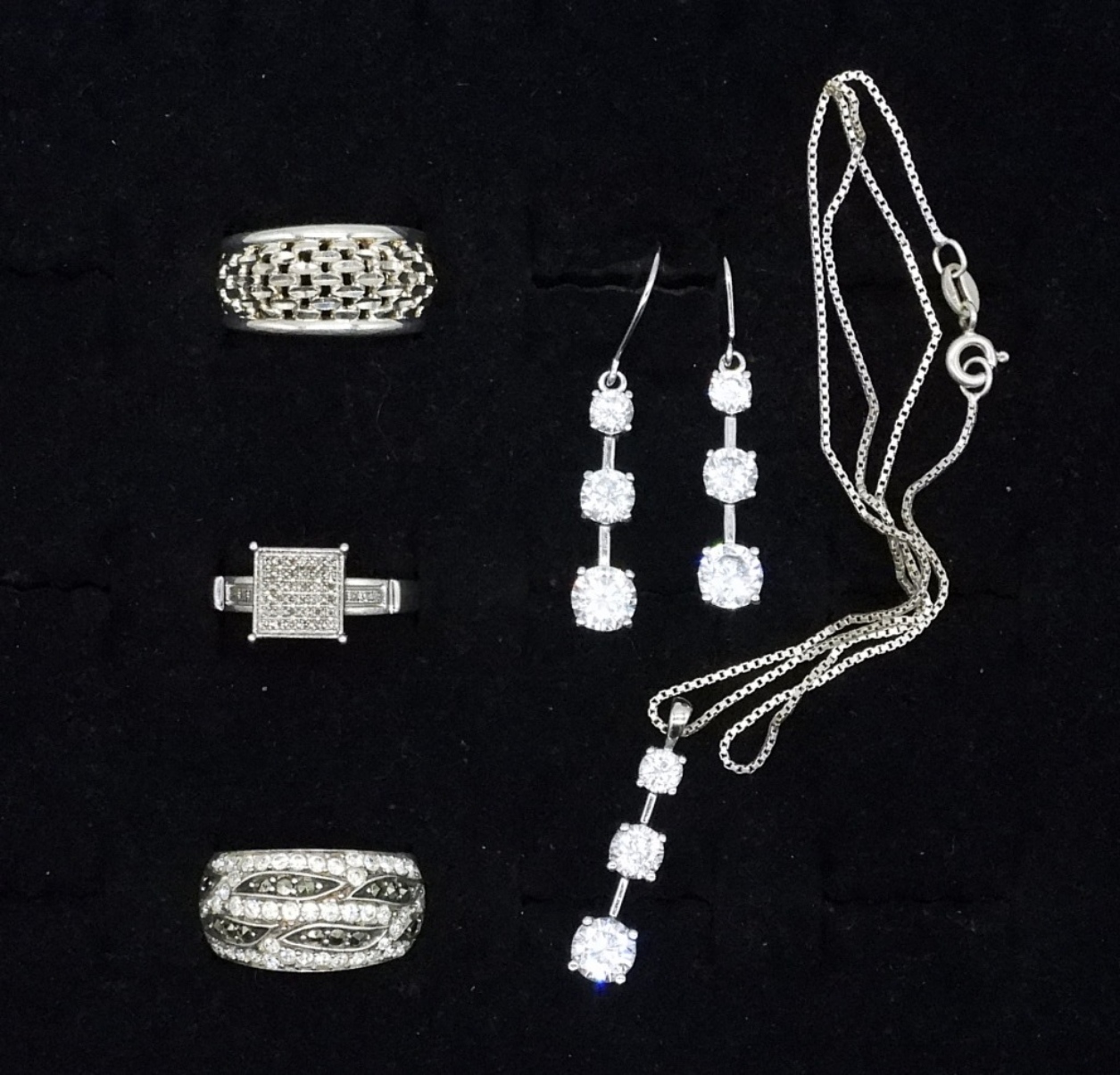 NECKLACE, 14″. MATCHING PIERCED EARRINGS, 1.5″ LONG. THREE STERLING RINGS, SIZES 5 & 7. (16 DWT)