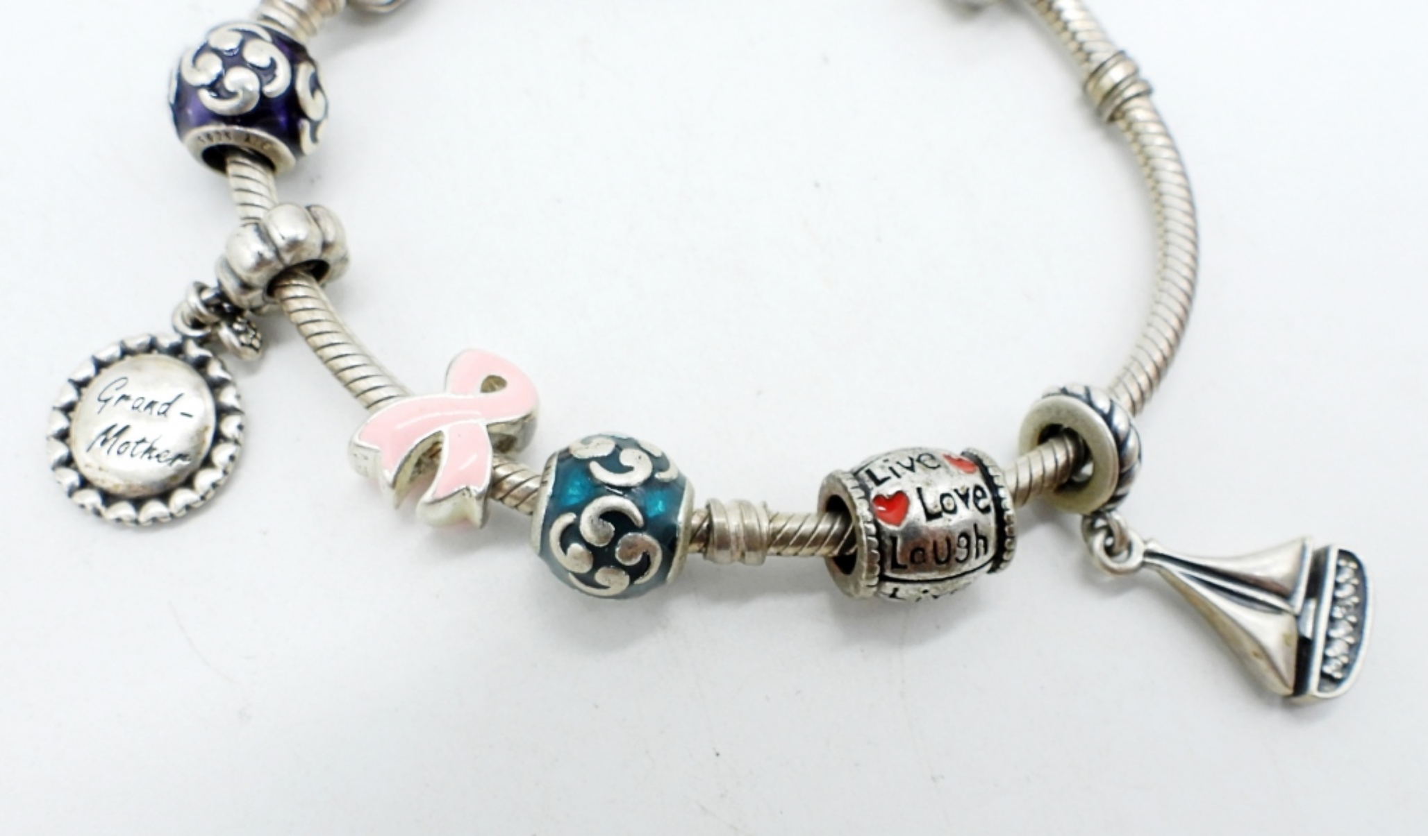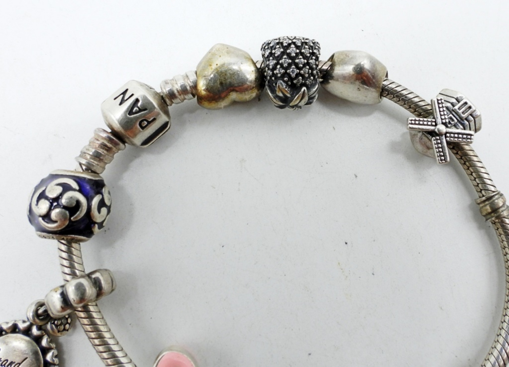 STERLING PANDORA CHARM BRACELET WITH 10 CHARMS. 7-7.5″. (31.6 DWT)